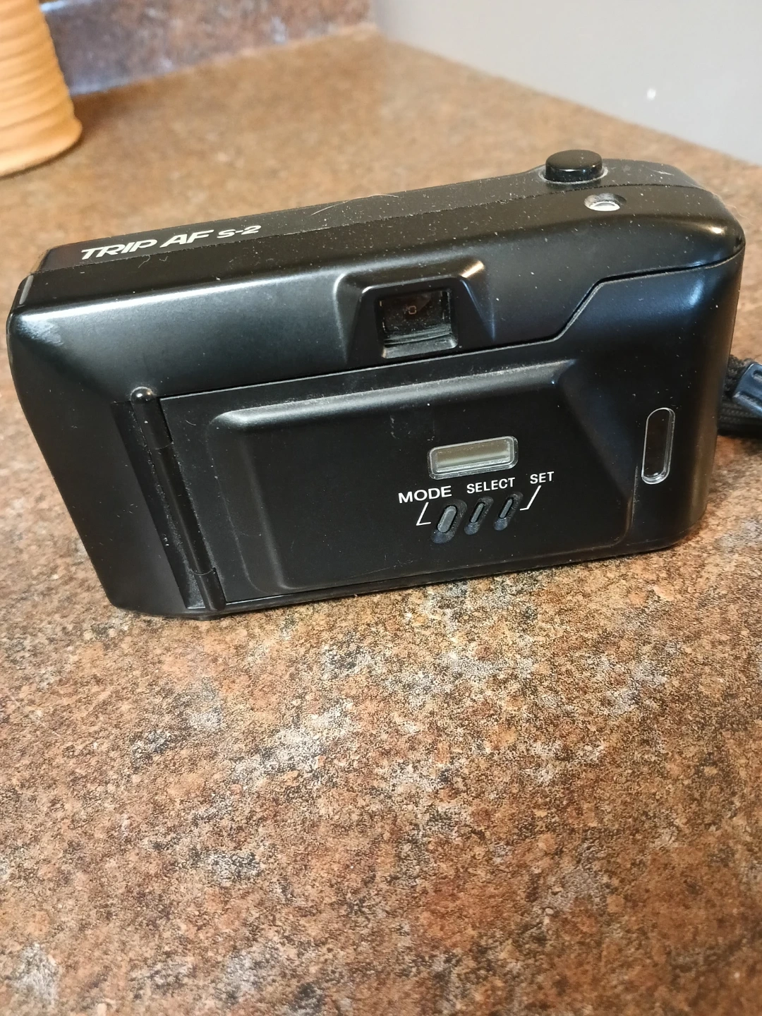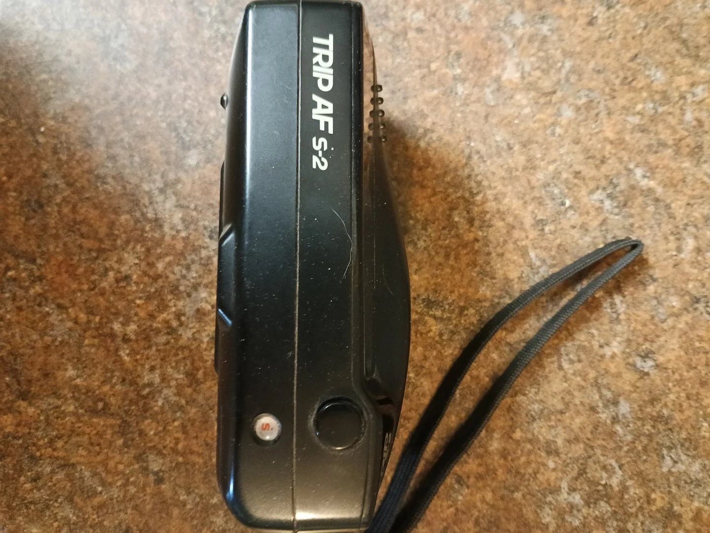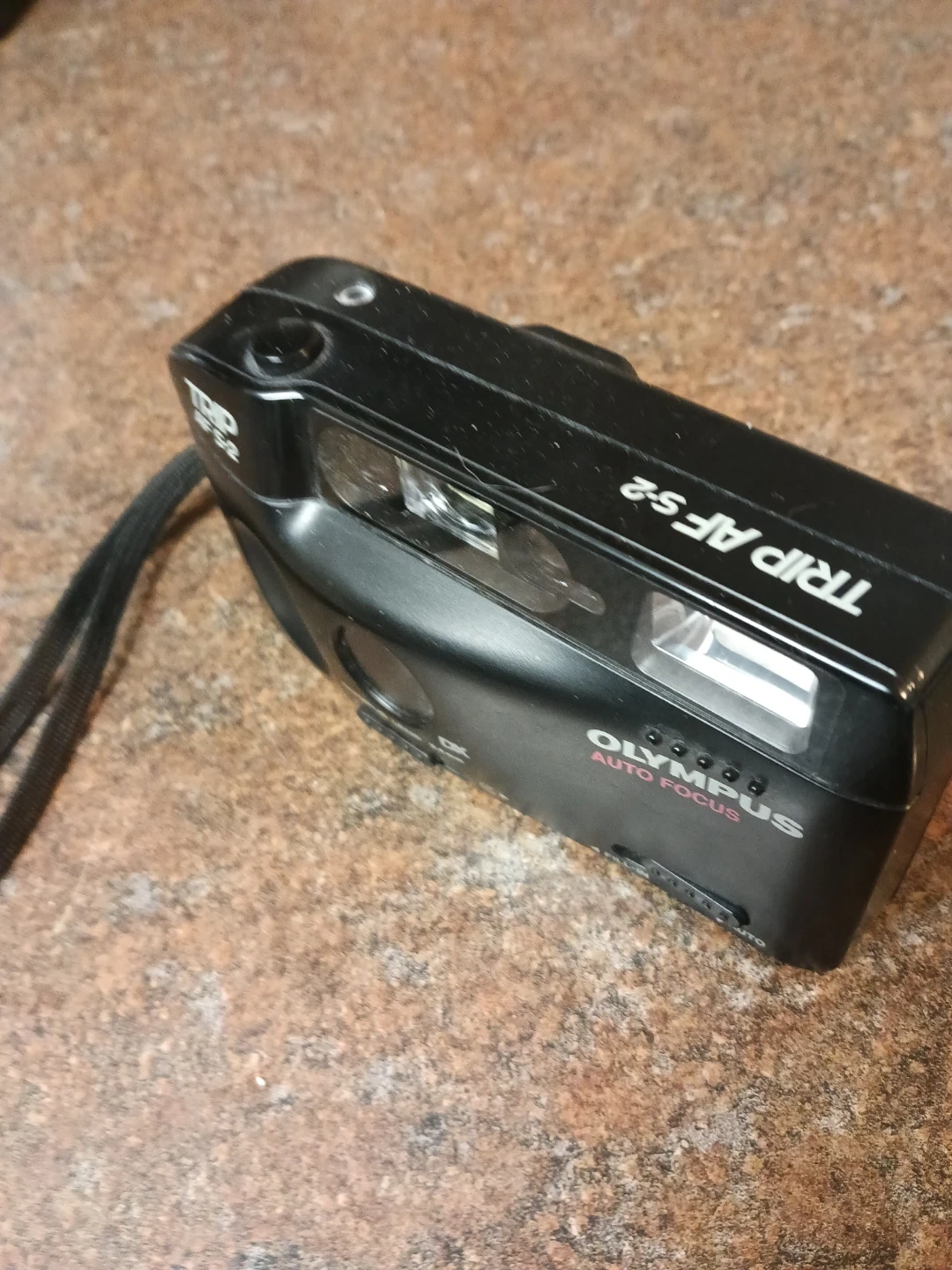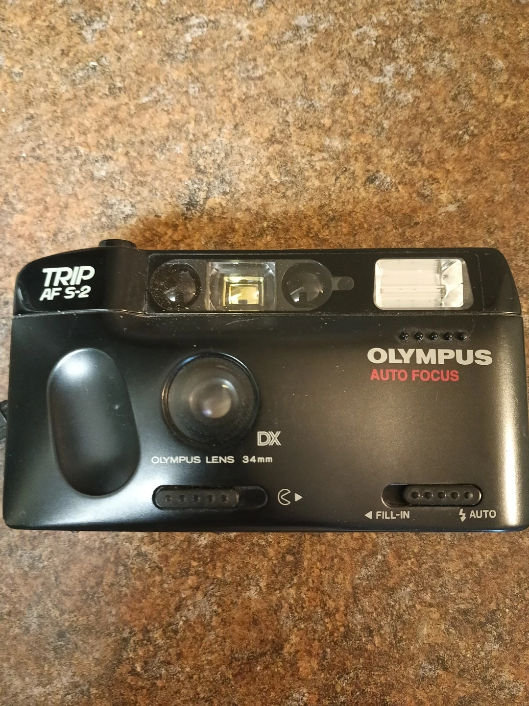 This is an Olympus Trip AF S-2 point-and-shoot film camera. It features auto focus and a 34mm Olympus lens. A fill-in flash is included for extra light. This camera is great for capturing memories on the go!