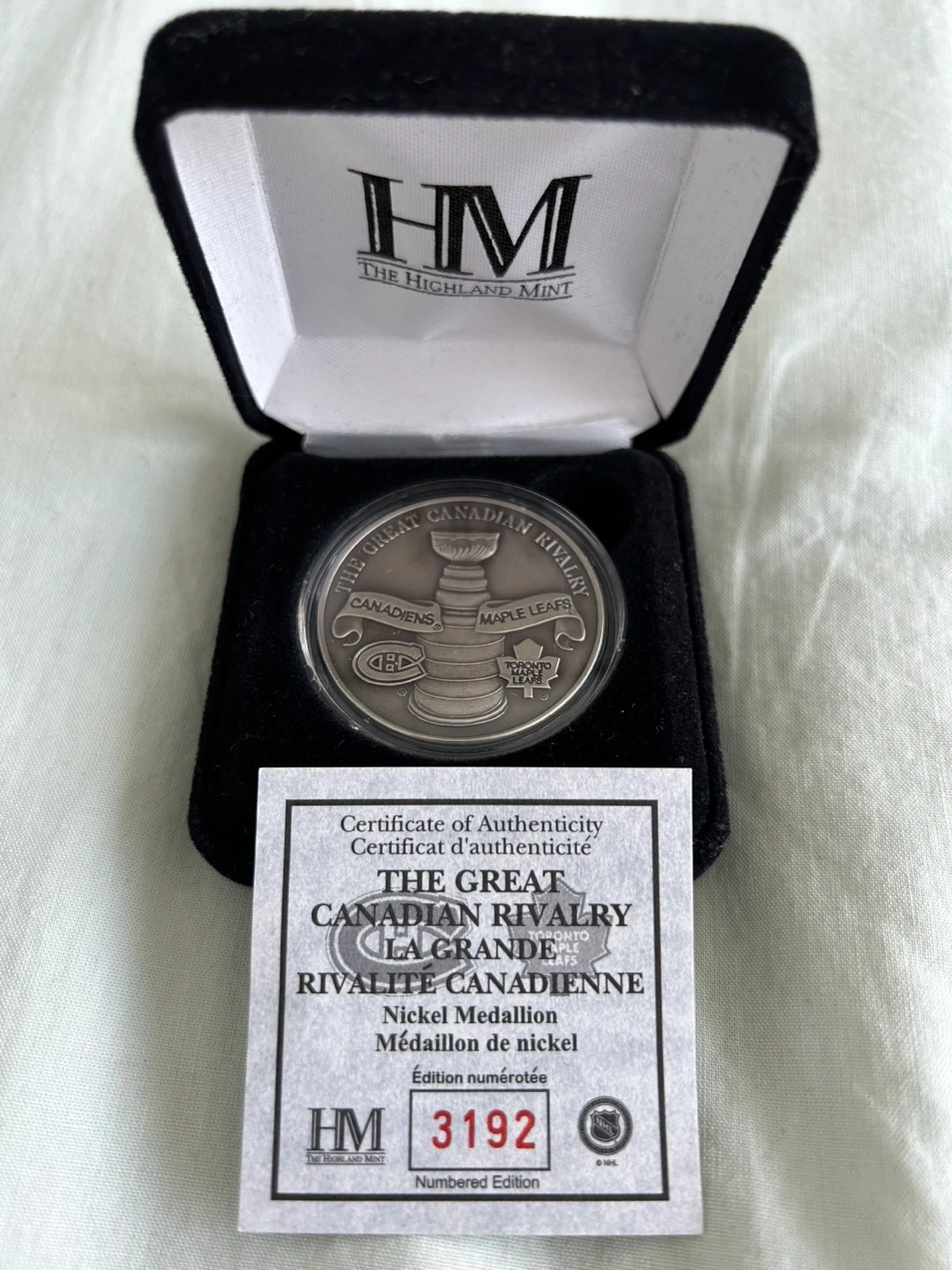 The Highland Mint presents 'The Great Canadian Rivalry' nickel medallion. This is a numbered edition, with this specific one being number 3192. It commemorates the Canadiens and Maple Leafs rivalry. Comes in a presentation box with its certificate of authenticity.