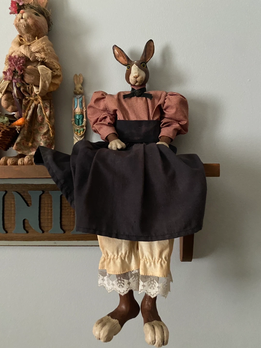 This is a charming handmade decorative bunny doll. It is a unique piece that would look great in any home.