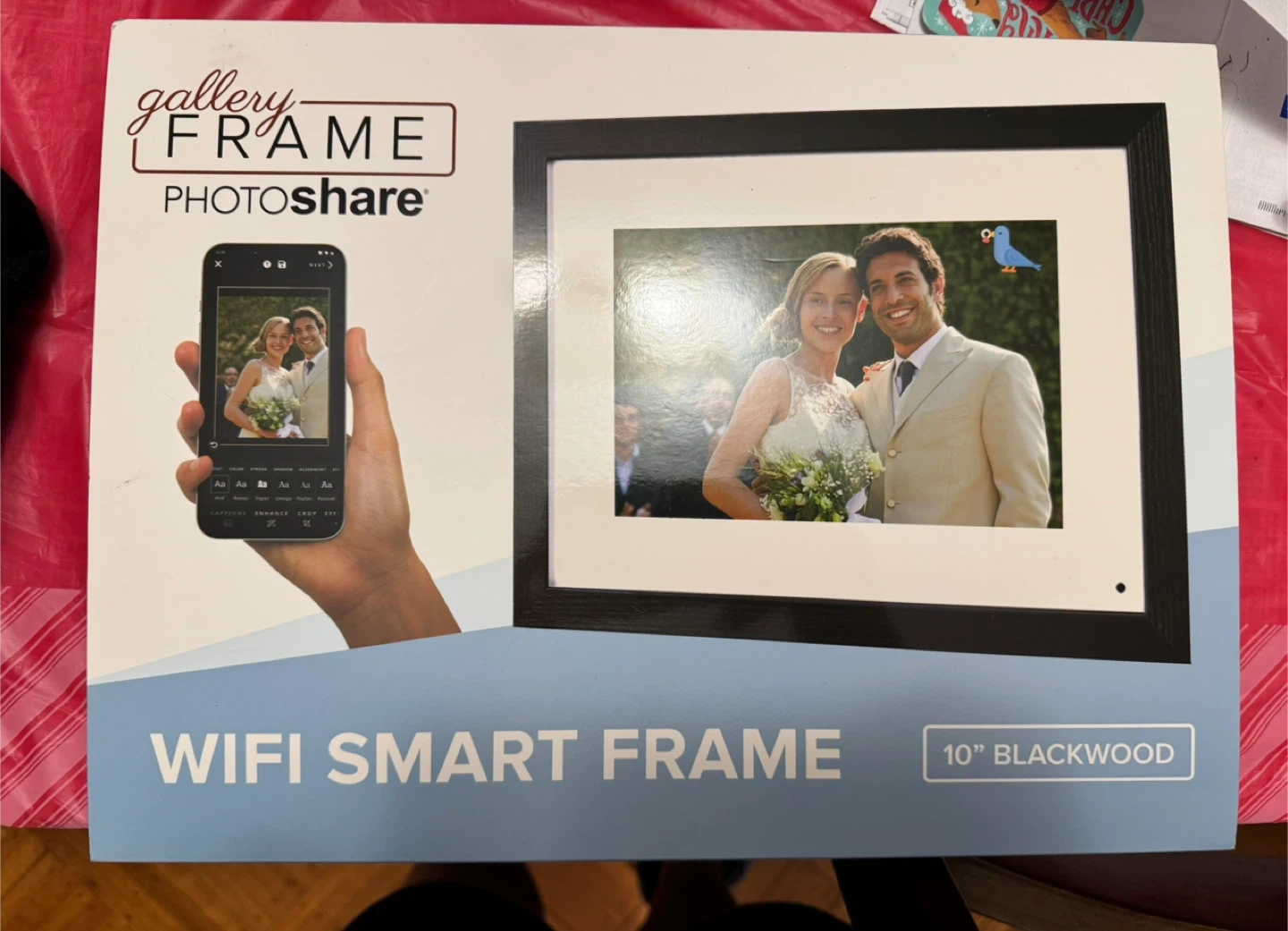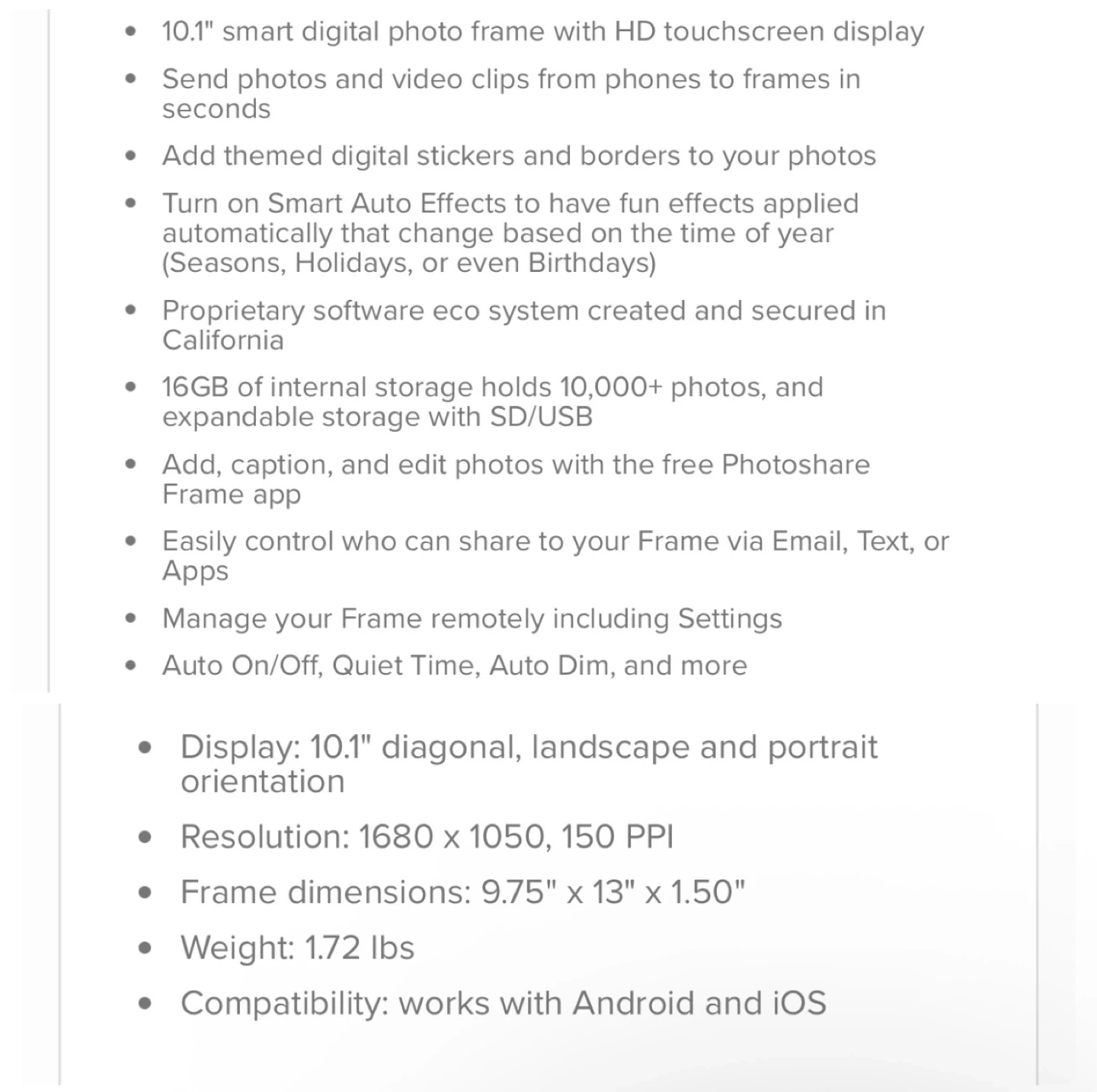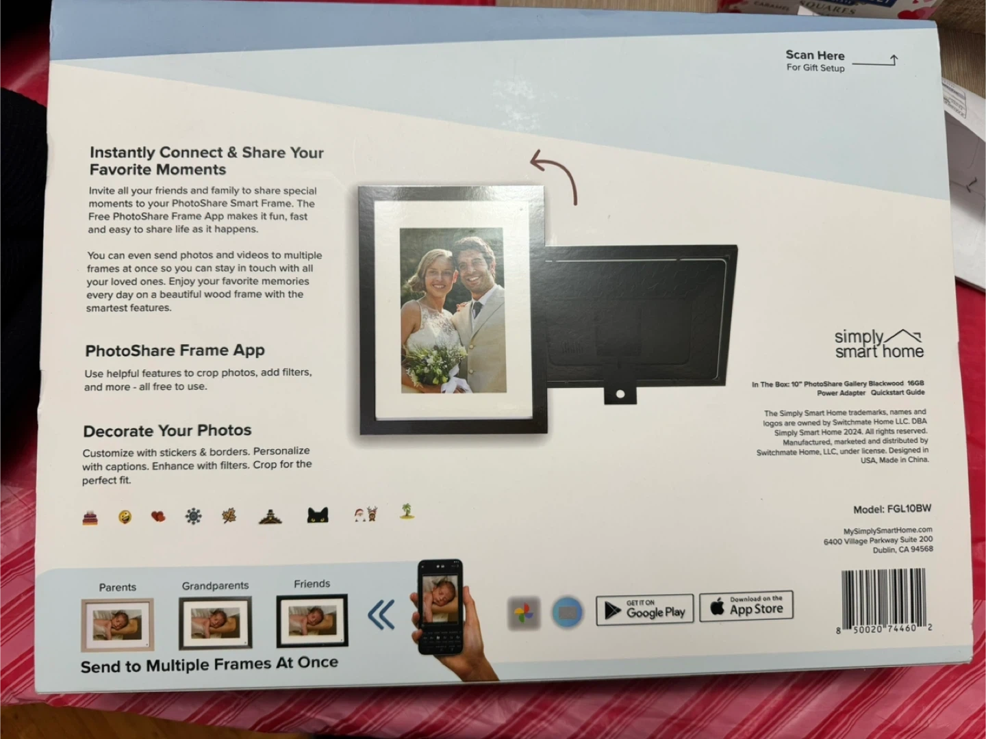 This is a Simply Smart Home PhotoShare WiFi Smart Frame in 10" Blackwood. It's designed to instantly connect and share your favorite moments. Includes power adapter and quick start guide. This frame is perfect for displaying cherished memories in your home!