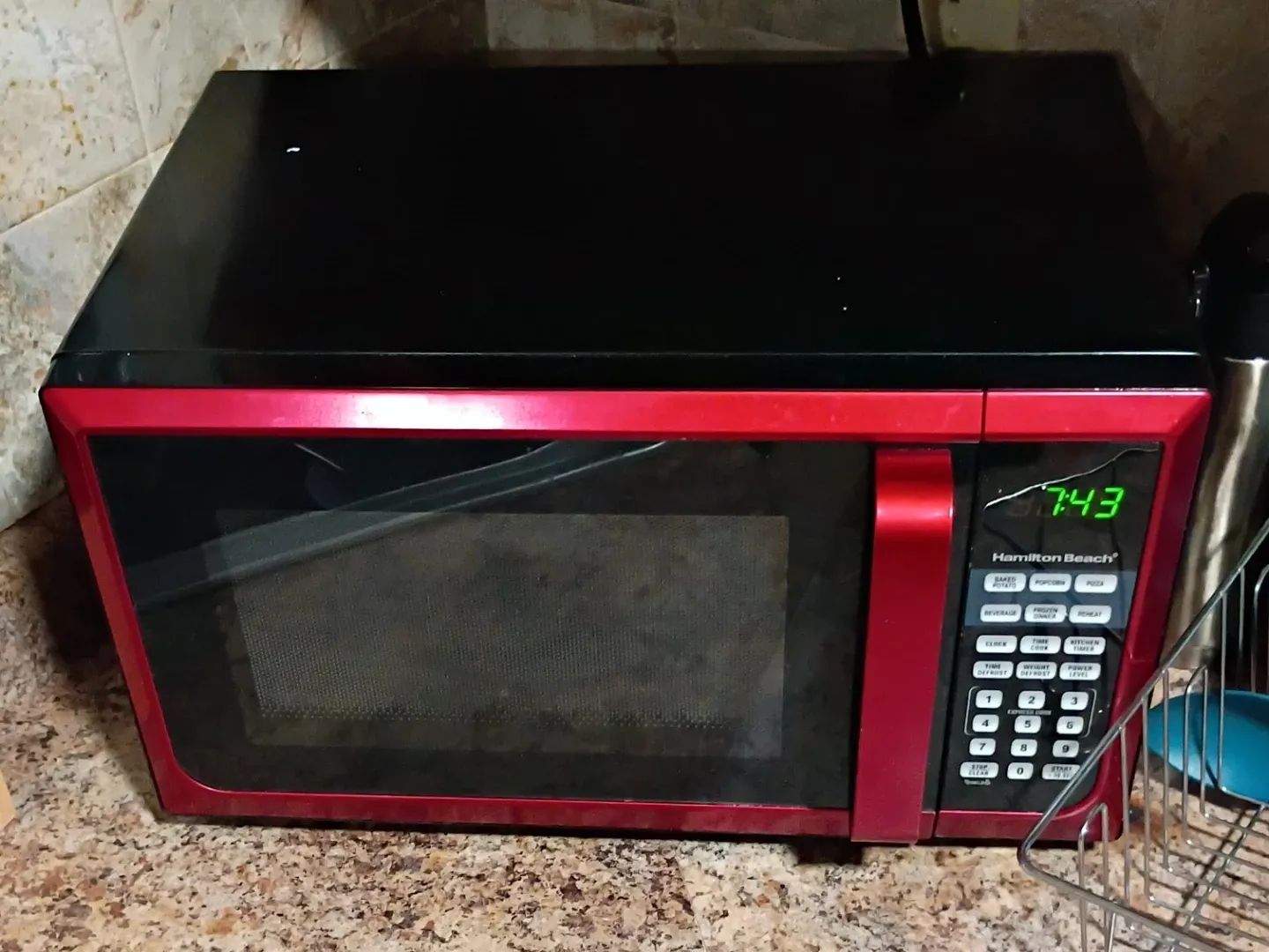 Compact Hamilton Beach microwave oven. Black top with red trim and door handle. Digital display shows 7:43. Features preset cooking buttons like popcorn and pizza.
