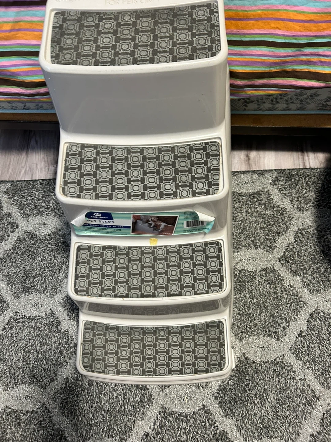 These are pet steps for cats and dogs, perfect for helping your furry friends reach high places. They're made of durable plastic and have non-slip treads for safety. Each step is designed to support up to 70 lbs. Helps pets easily get on furniture or into vehicles.
