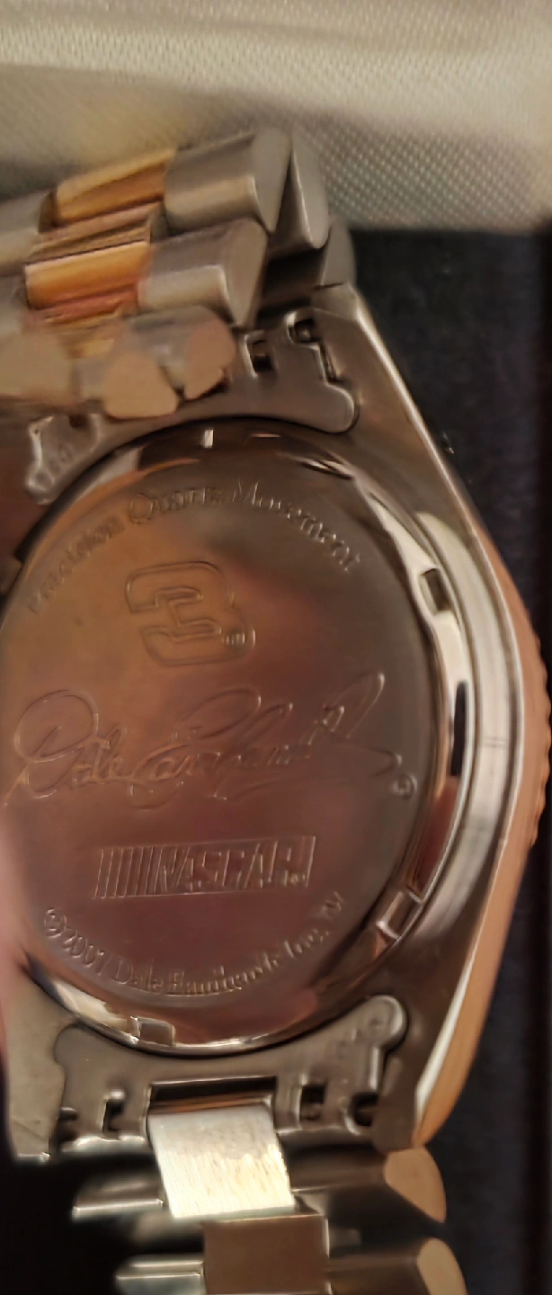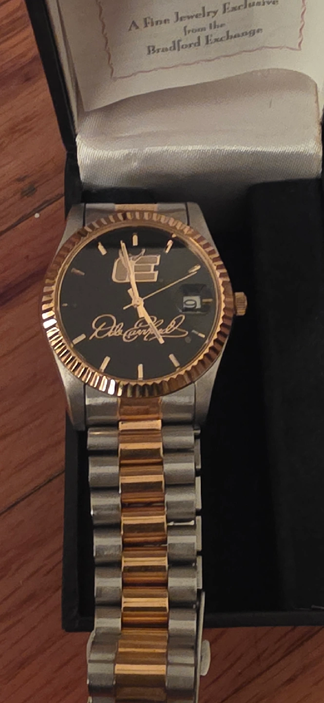 Selling a Dale Earnhardt NASCAR watch. It comes in its original box. The watch has a two-tone band and features Dale Earnhardt's signature on the face. The back of the watch has the NASCAR logo and Dale Earnhardt's signature. A fine jewelry exclusive from the Bradford Exchange.needs a battery been sitting in the box