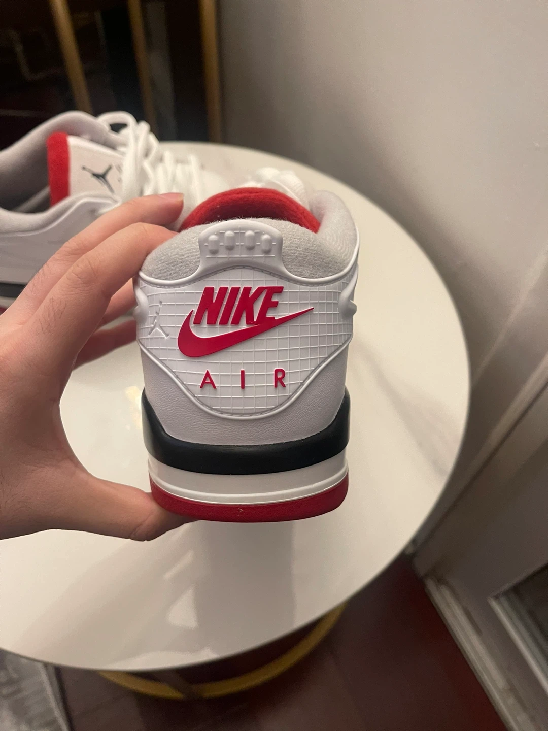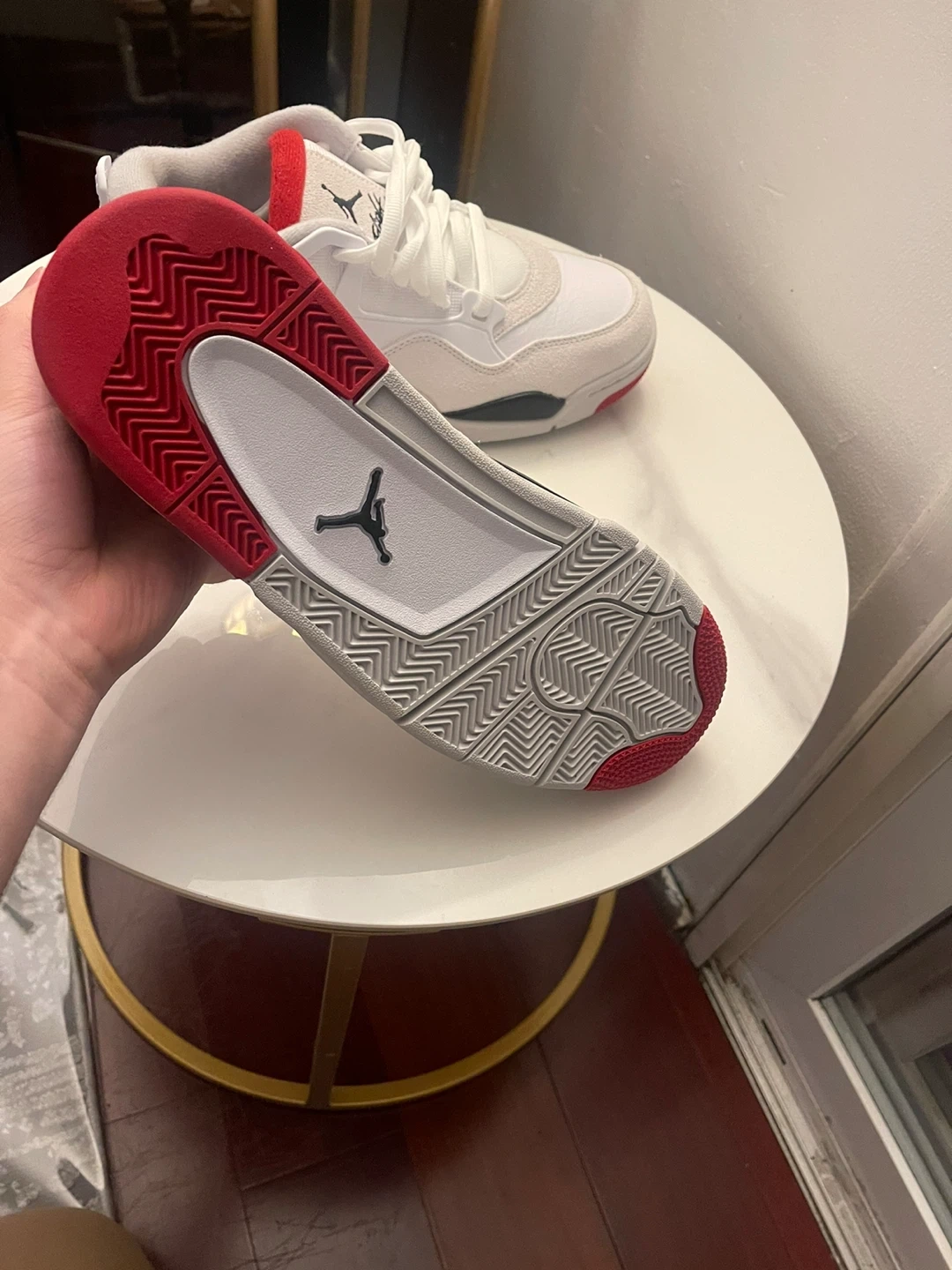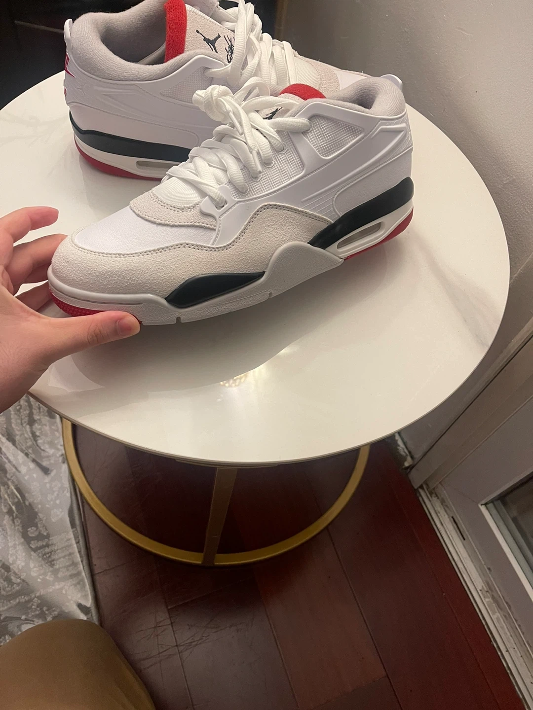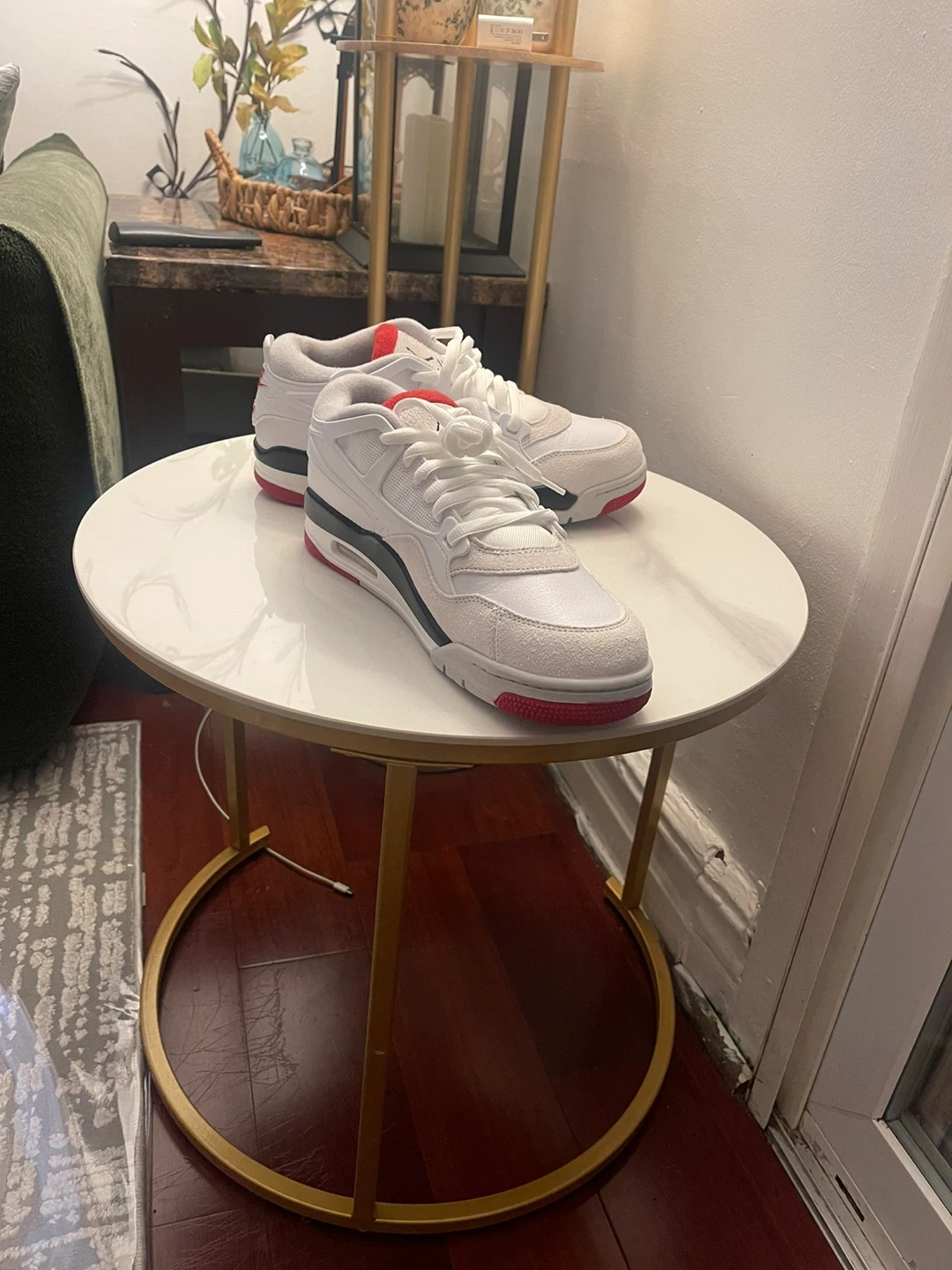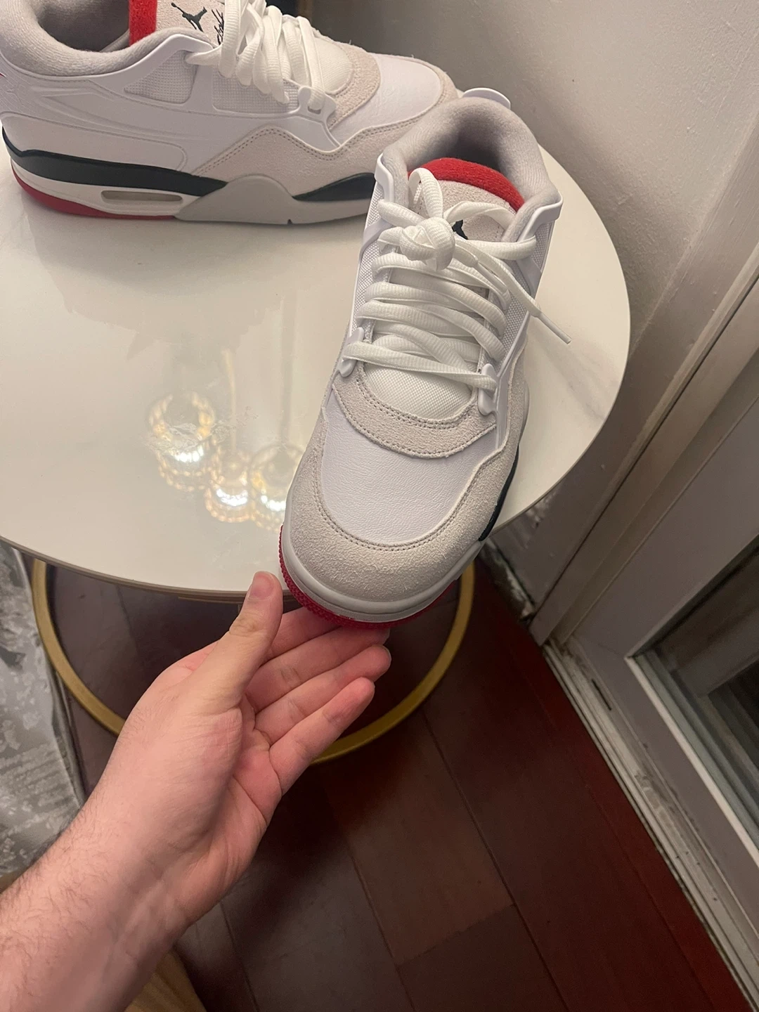 White and red Brand new Jordan 4 rm size 10 sneakers. These shoes feature a combination of leather and suede materials. They have a rubber outsole for traction. Comes with original laces. Including box( no lid)