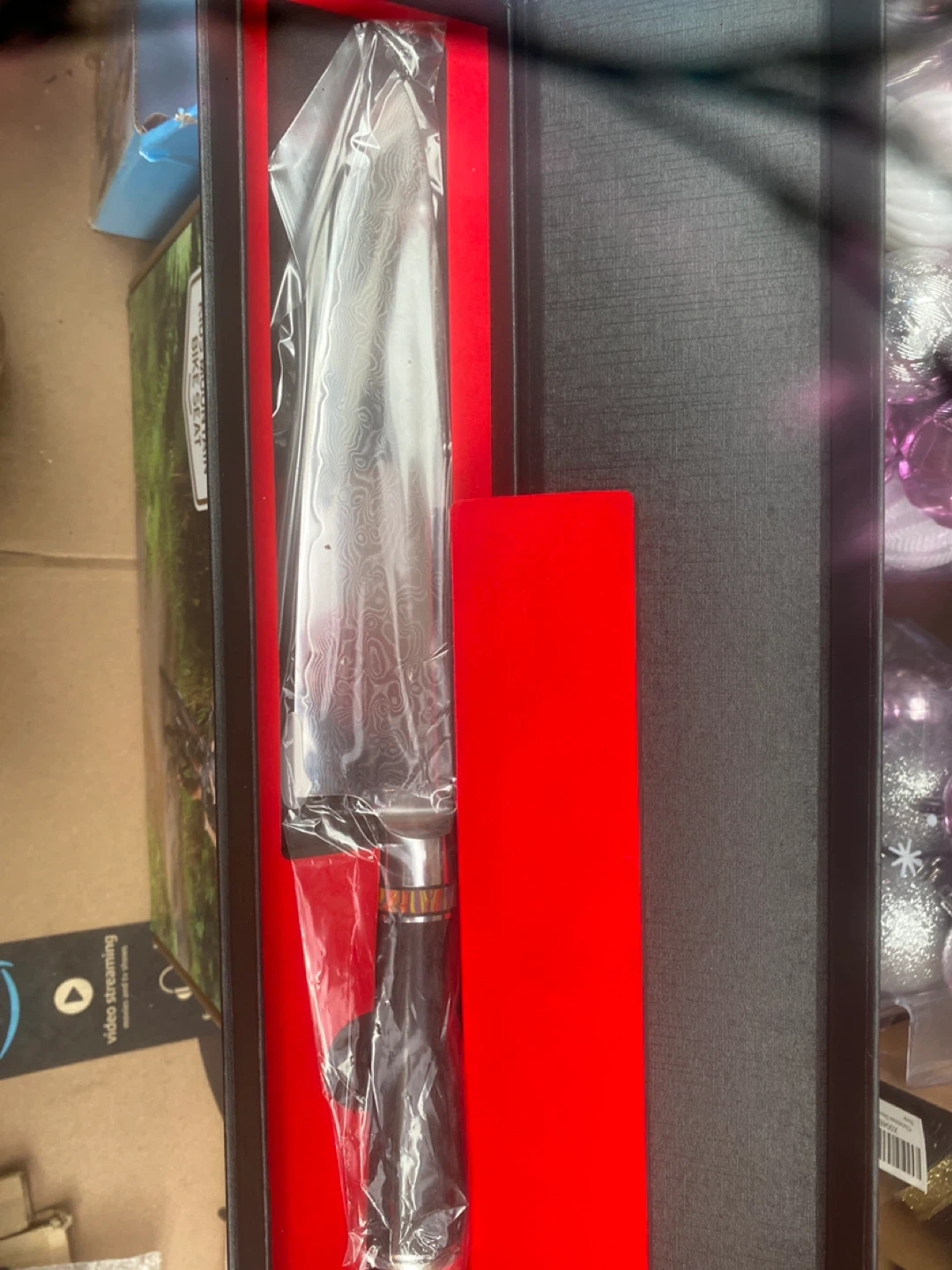 65Selling a brand new Damascus steel kitchen knife still in its original packaging. It features a beautiful patterned blade and a sleek black handle. The knife comes in a box with a red insert.