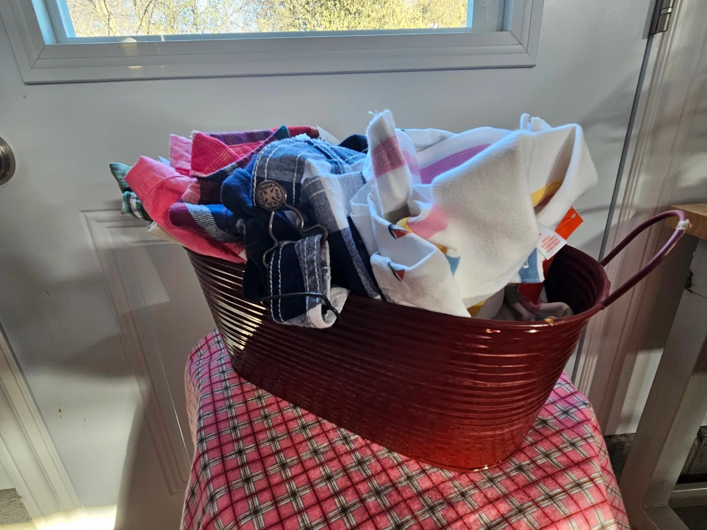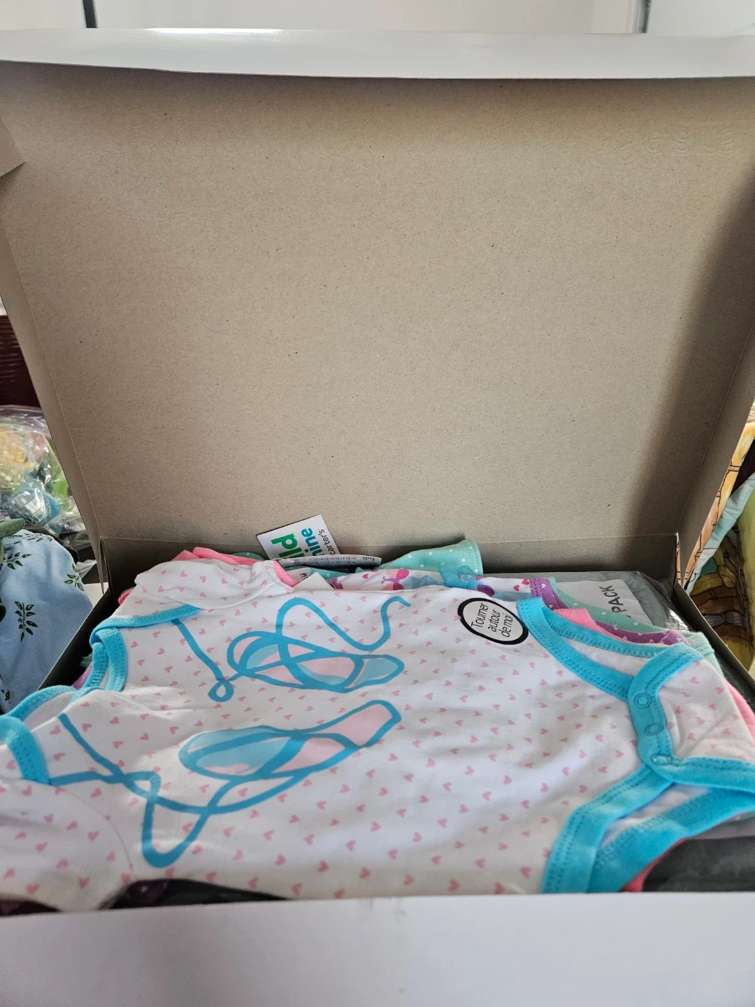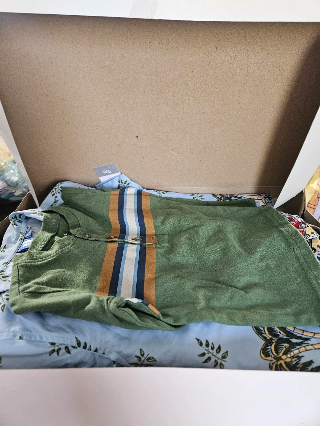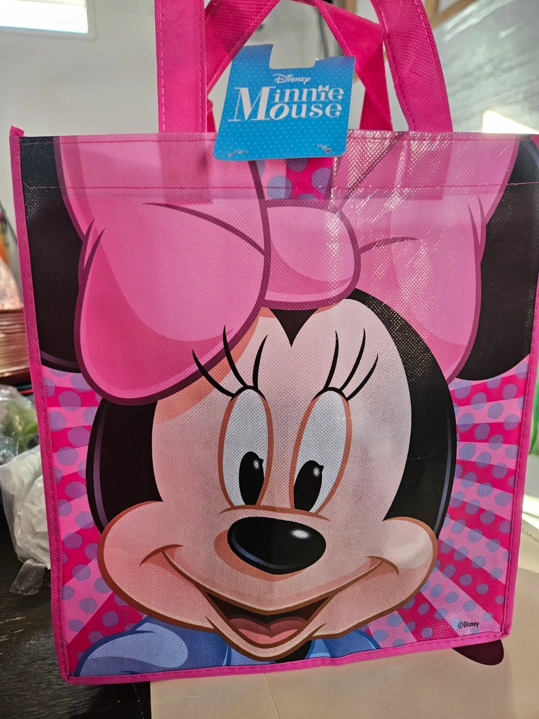 These baskets includes a variety of kids' and adukt clothing items. You'll find a green striped shirt in size 6 months, a pair of 2-pack Junction Performance socks in size S/M, and a Disney Minnie Mouse reusable tote bag. Additional items are present in baskets, including shirts and patterned leggings.
