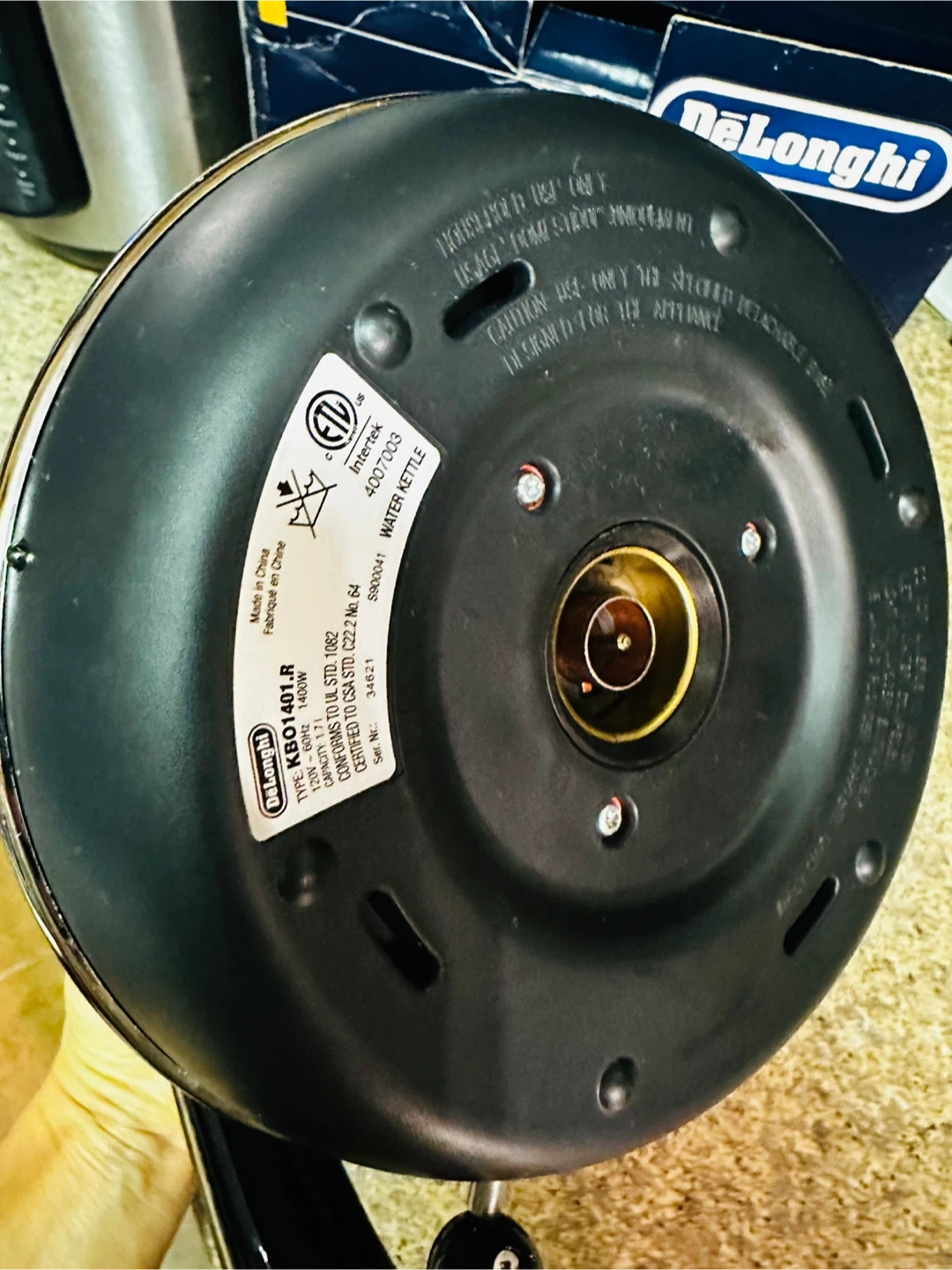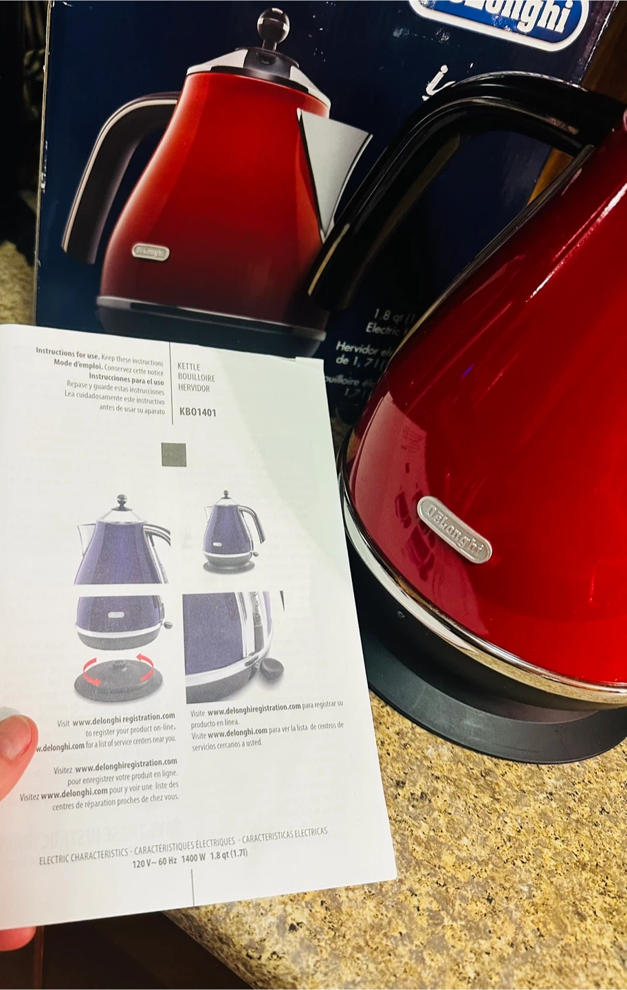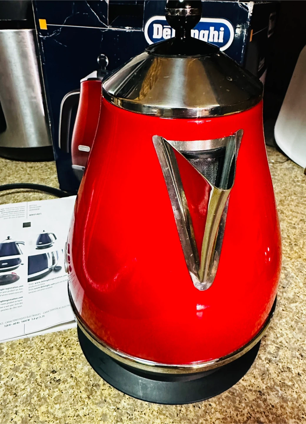 This is a red DeLonghi electric kettle, model KB01401.R. It's 1.8 qt capacity and uses 1400W. Includes original box and instructions.