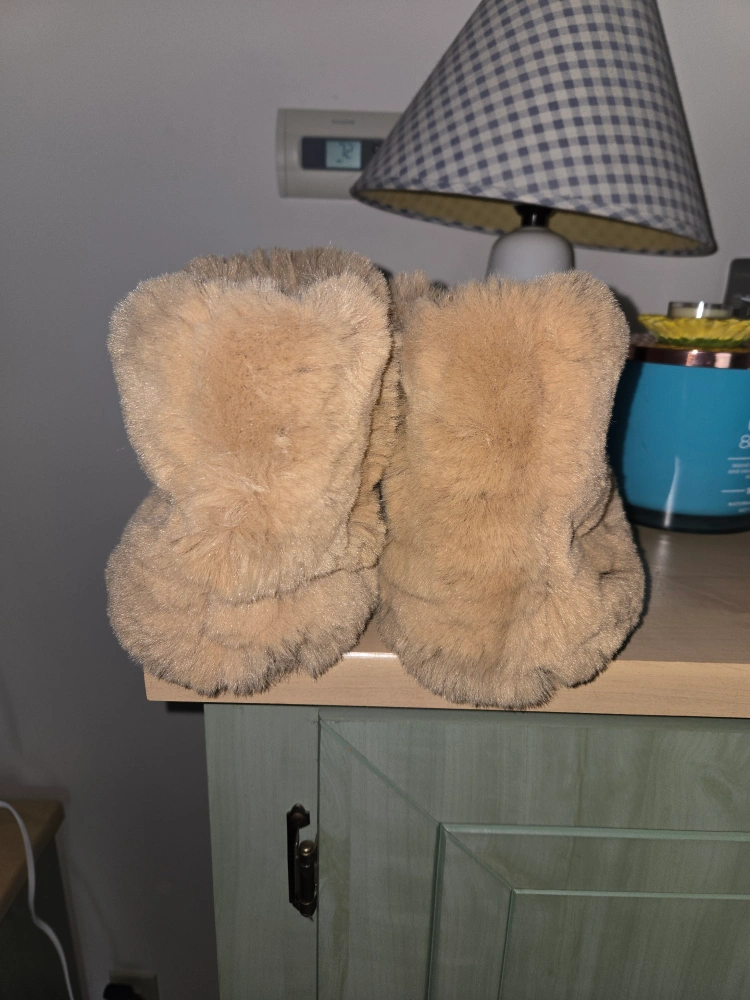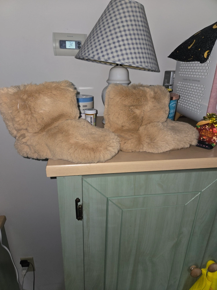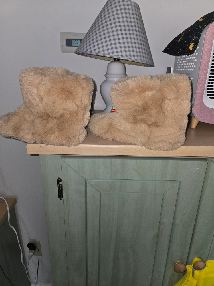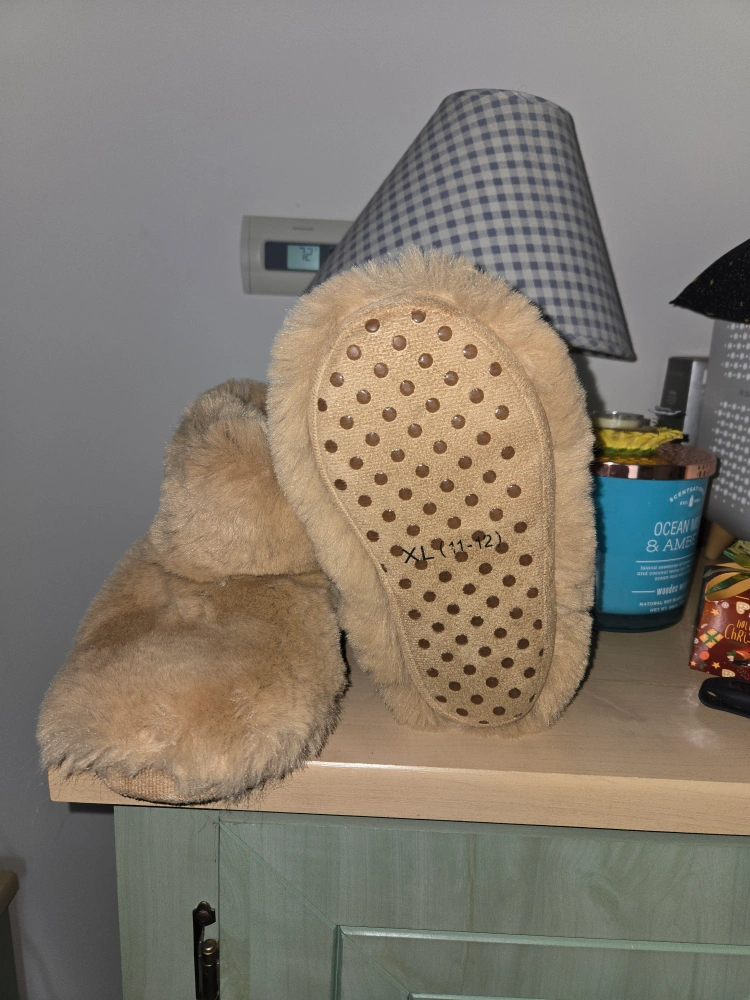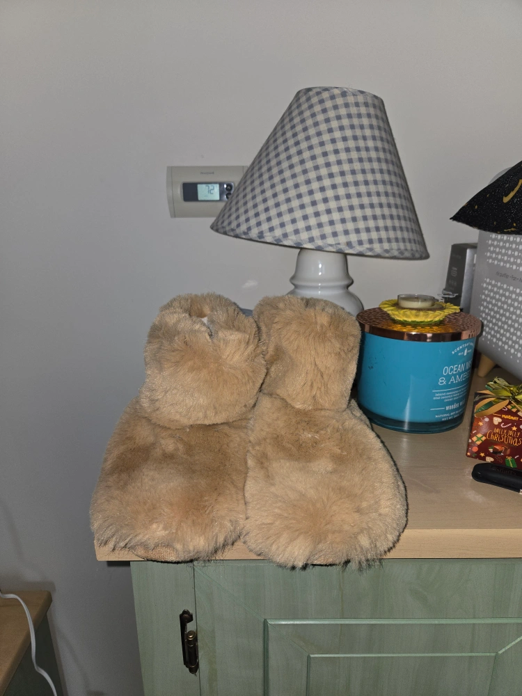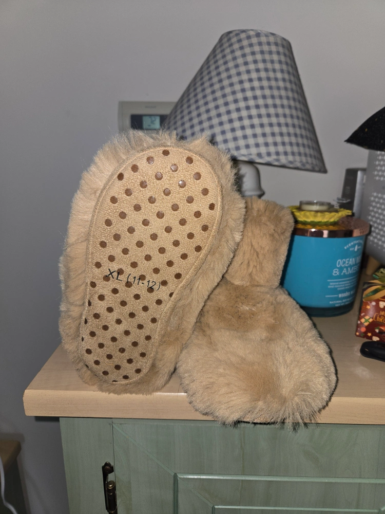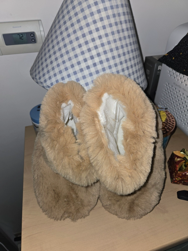 Cozy faux fur slippers. Light brown color. Size XL. Good for keeping your feet warm.