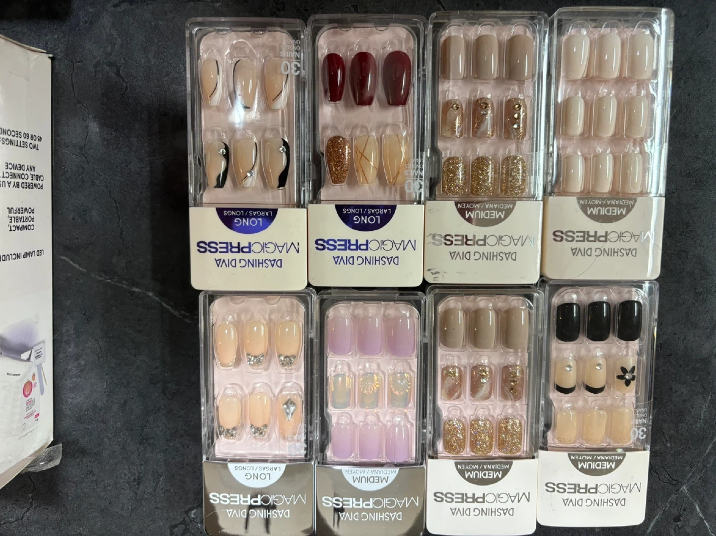 I'm selling a variety of Dashing Diva nail sets. All are brand new in their original packaging! Styles include: - Glaze Strong Semi-Cured Gel Nail Strengthener - Magic Press nails in various designs -Also includes mini uv lamp for certain nail sets