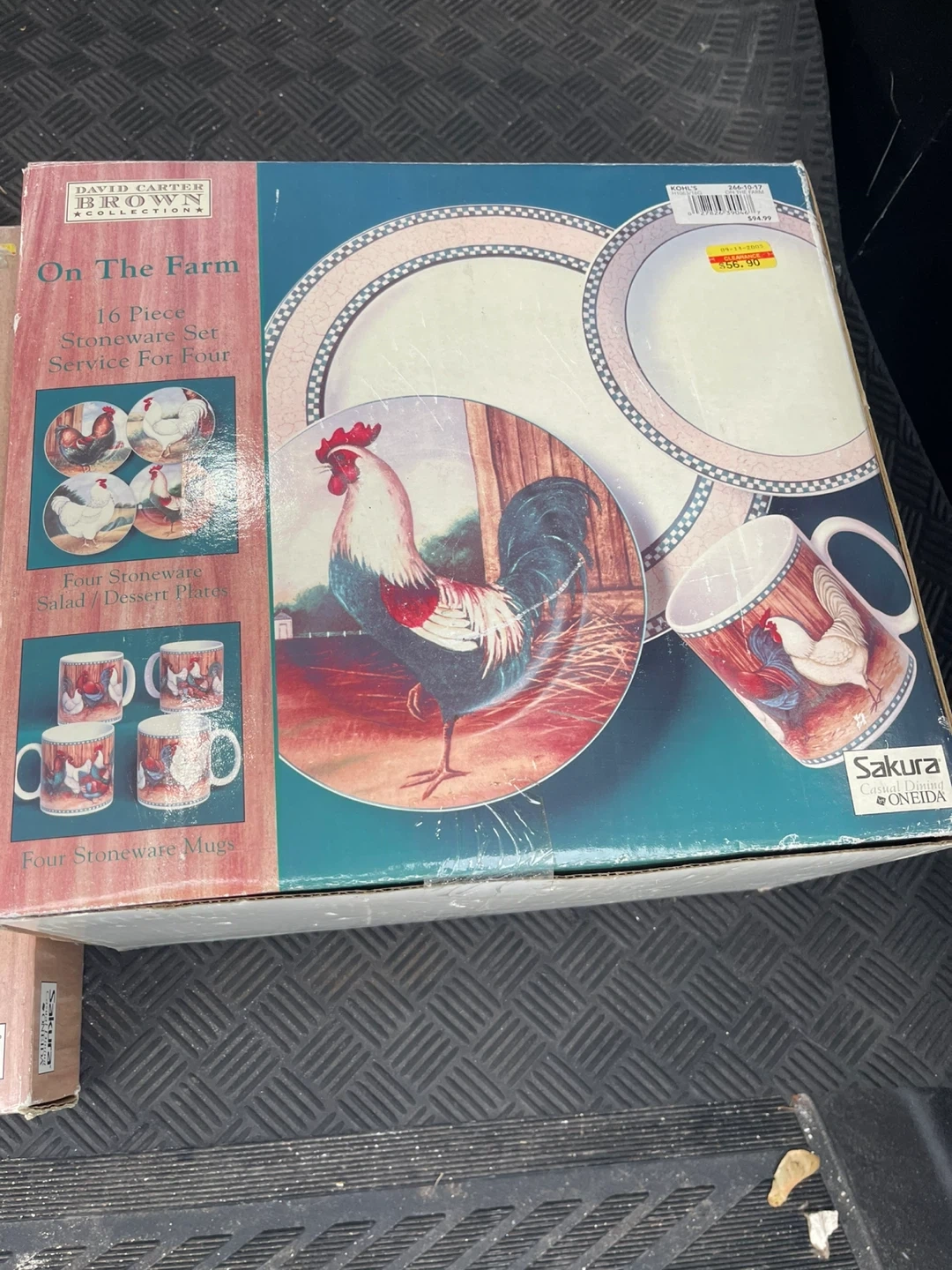 Selling a David Carter Brown Collection 'On The Farm' hand-painted earthenware platter. It's a 16" round serving platter featuring a charming rooster design. The box indicates it's not microwave or dishwasher safe, hand washing is recommended!