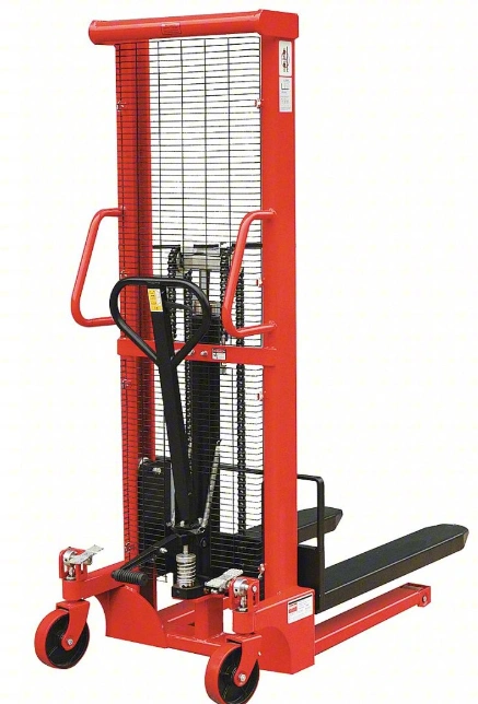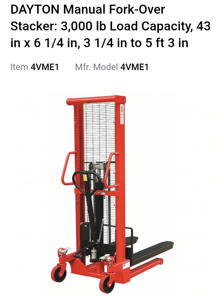 10Selling a DAYTON Manual Fork-Over Stacker with a 3,000 lb load capacity. Dimensions are 43 in x 6 1/4 in, with a lift range of 3 1/4 in to 5 ft 3 in