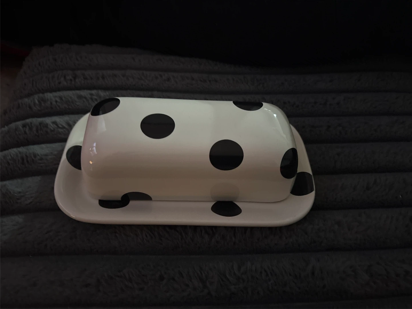 Here's a cute butter dish with a lid! It's white with black polka dots, perfect for adding a bit of fun to your kitchen. It's in great condition and ready for a new home