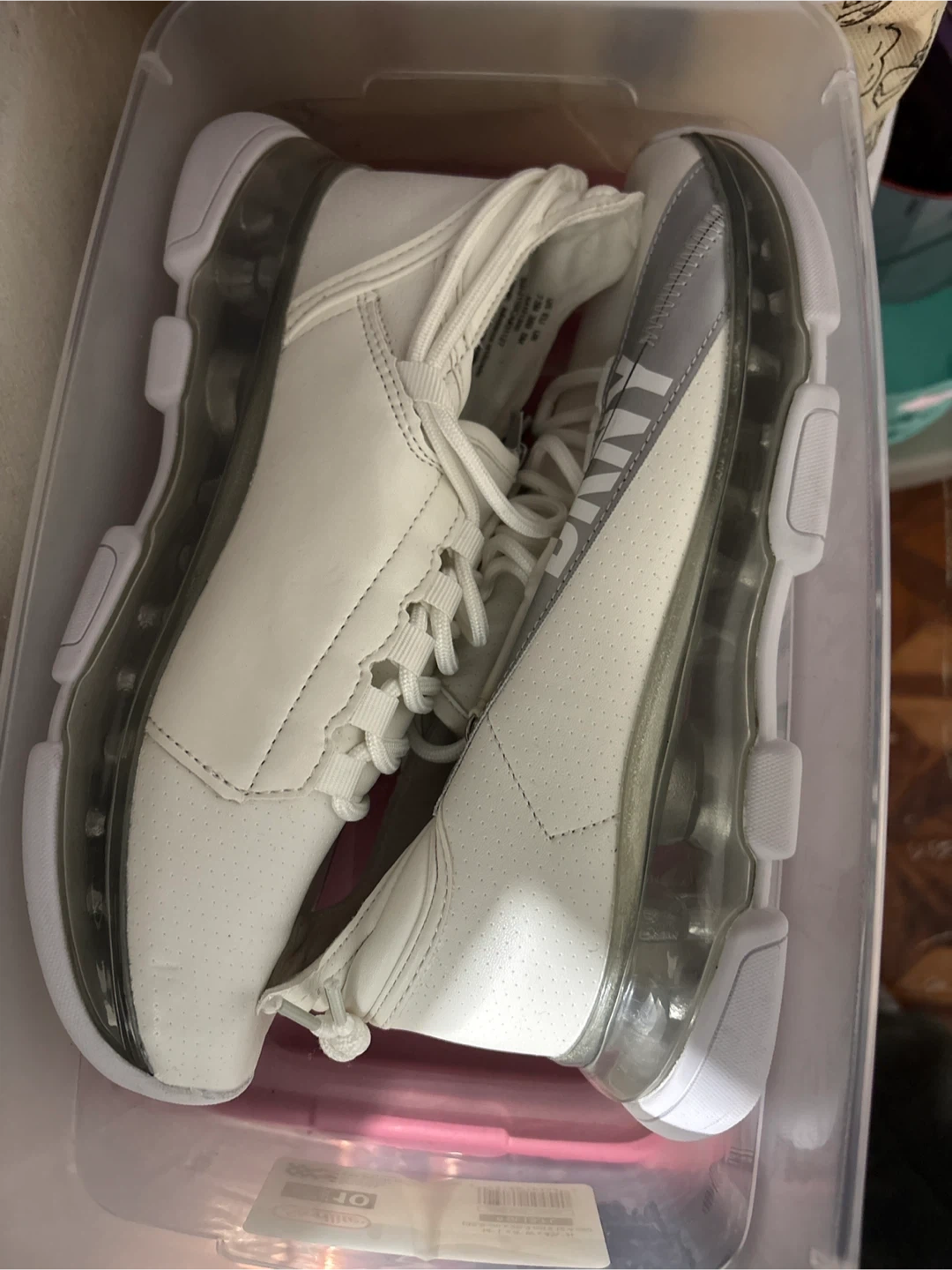 White Nike Air Max sneakers. Leather and synthetic upper with a visible Air Max sole unit. Lace-up closure for a secure fit. These are great for everyday wear!