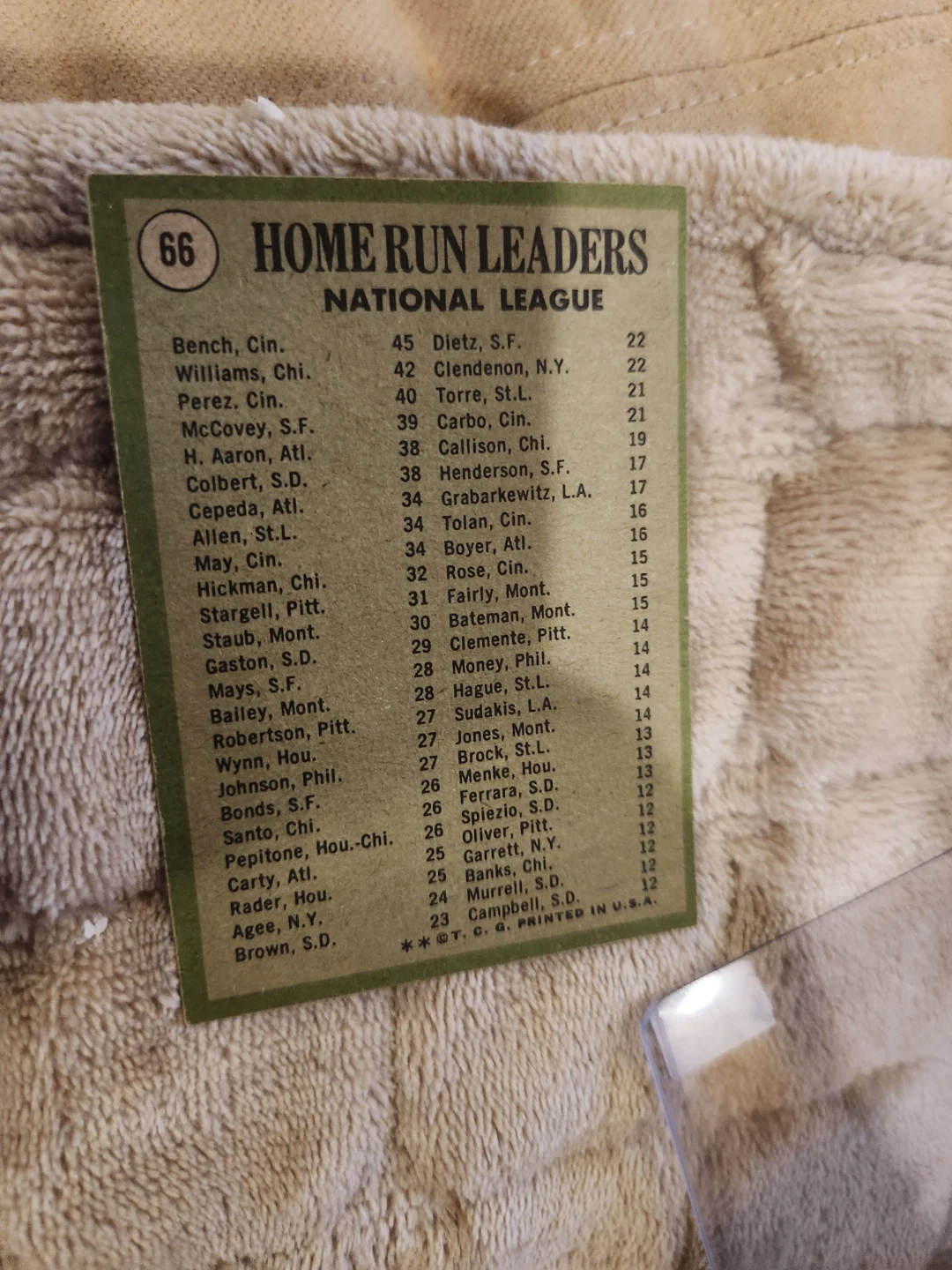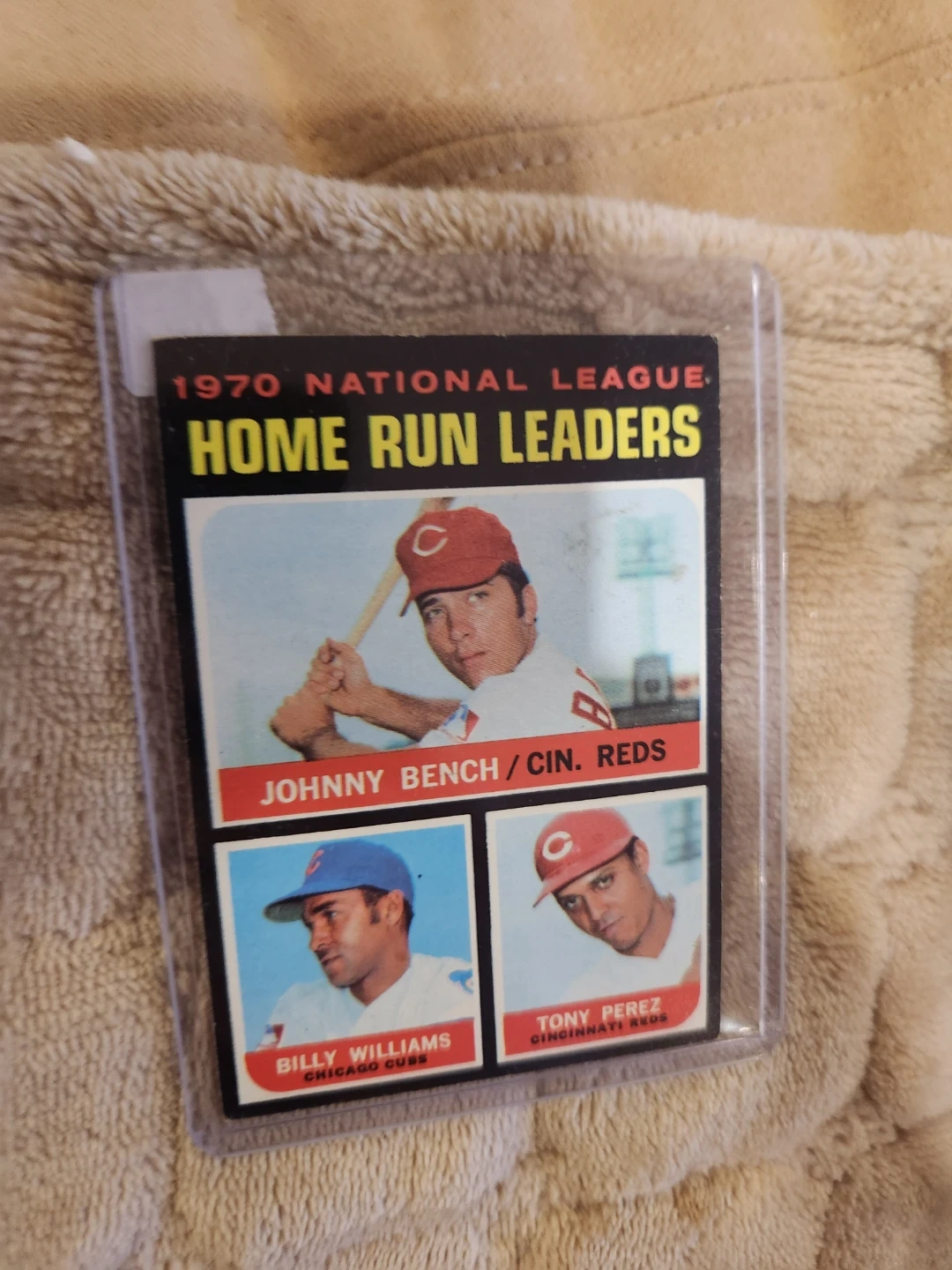 This is a 1970 Topps National League Home Run Leaders baseball card featuring Johnny Bench. It also includes listings for other players like Tony Perez and Billy Williams. The card is in a protective sleeve.