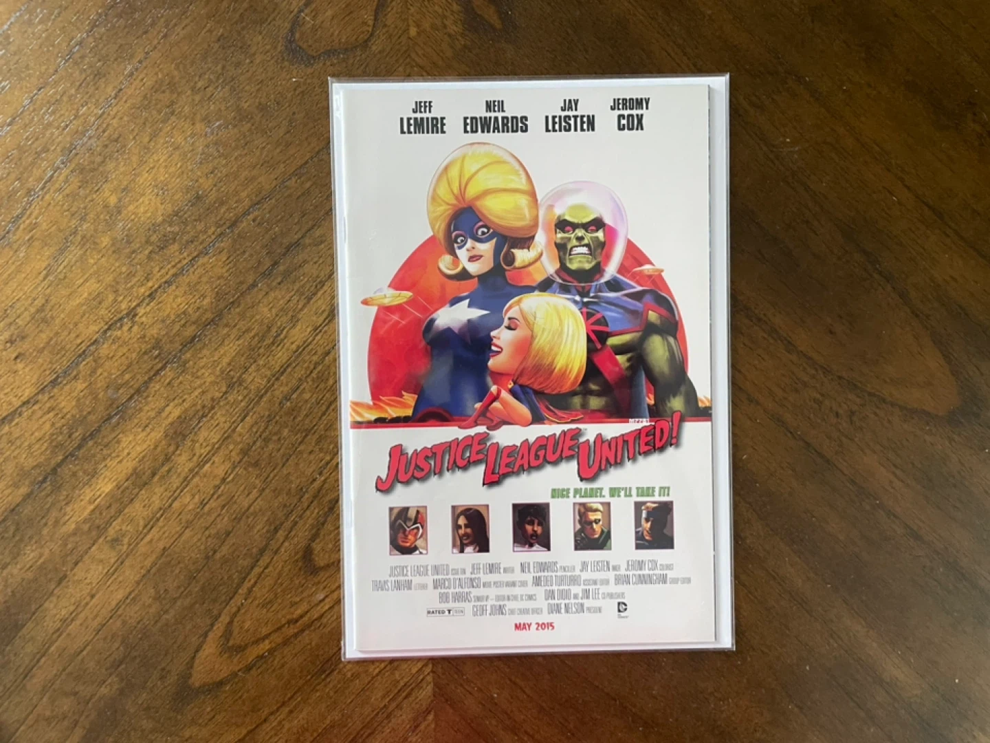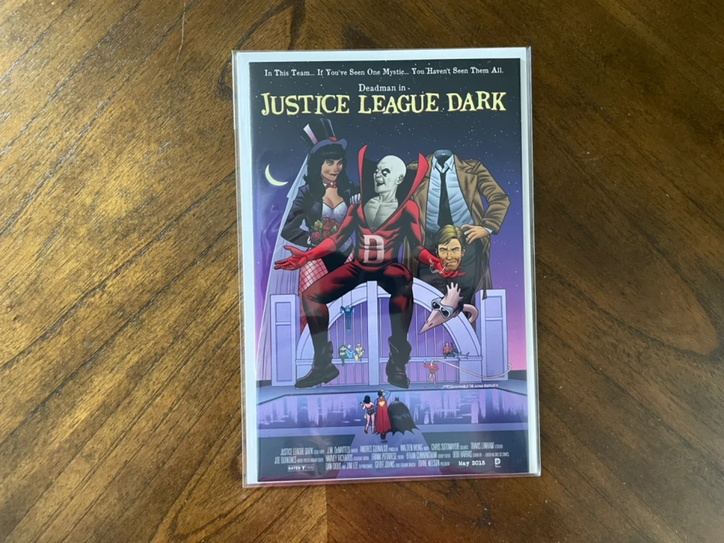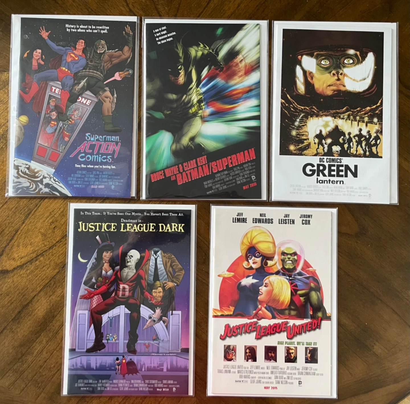 This is a set of five variant comic book covers from DC Comics, featuring Green Lantern, Justice League United, Superman Action Comics, Batman/Superman, and Justice League Dark. They are all dated May 2015. These covers are great for collectors and fans of DC superheroes!