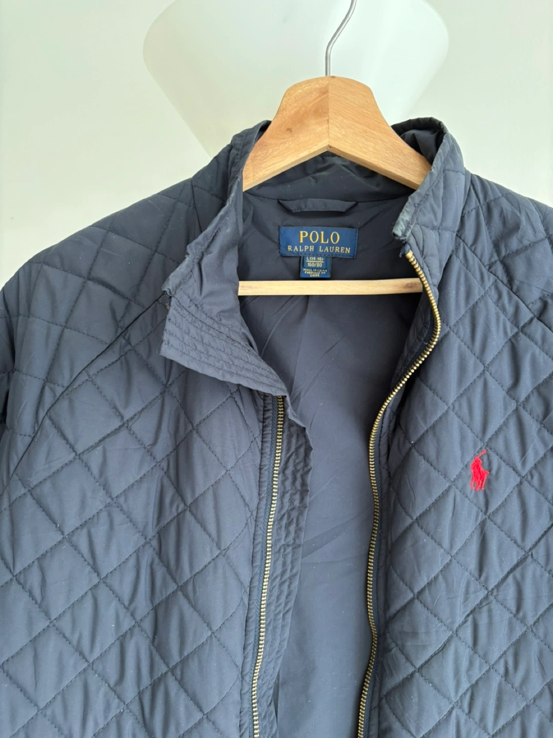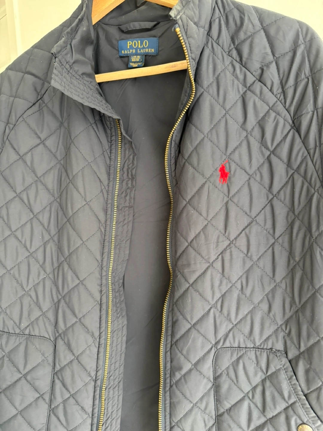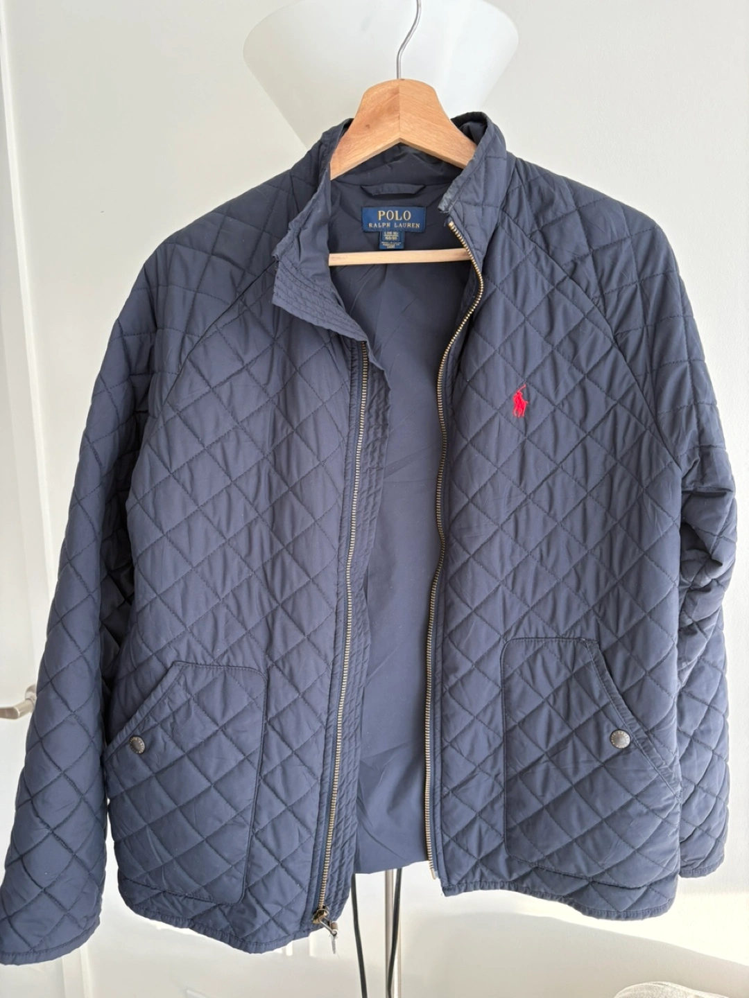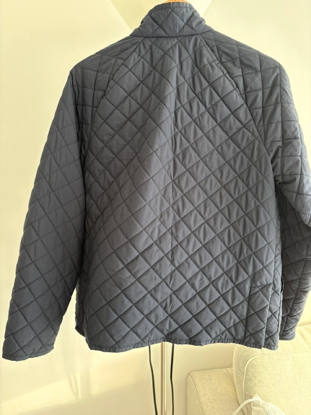 A nice quilted jacket in a lovely blue shade. Featuring a zipper front and two front pockets. The jacket also has a small logo on the breast. It would make a great addition to your wardrobe for a cozy autumn evening.
