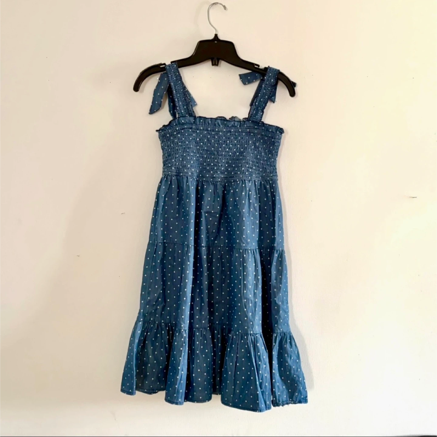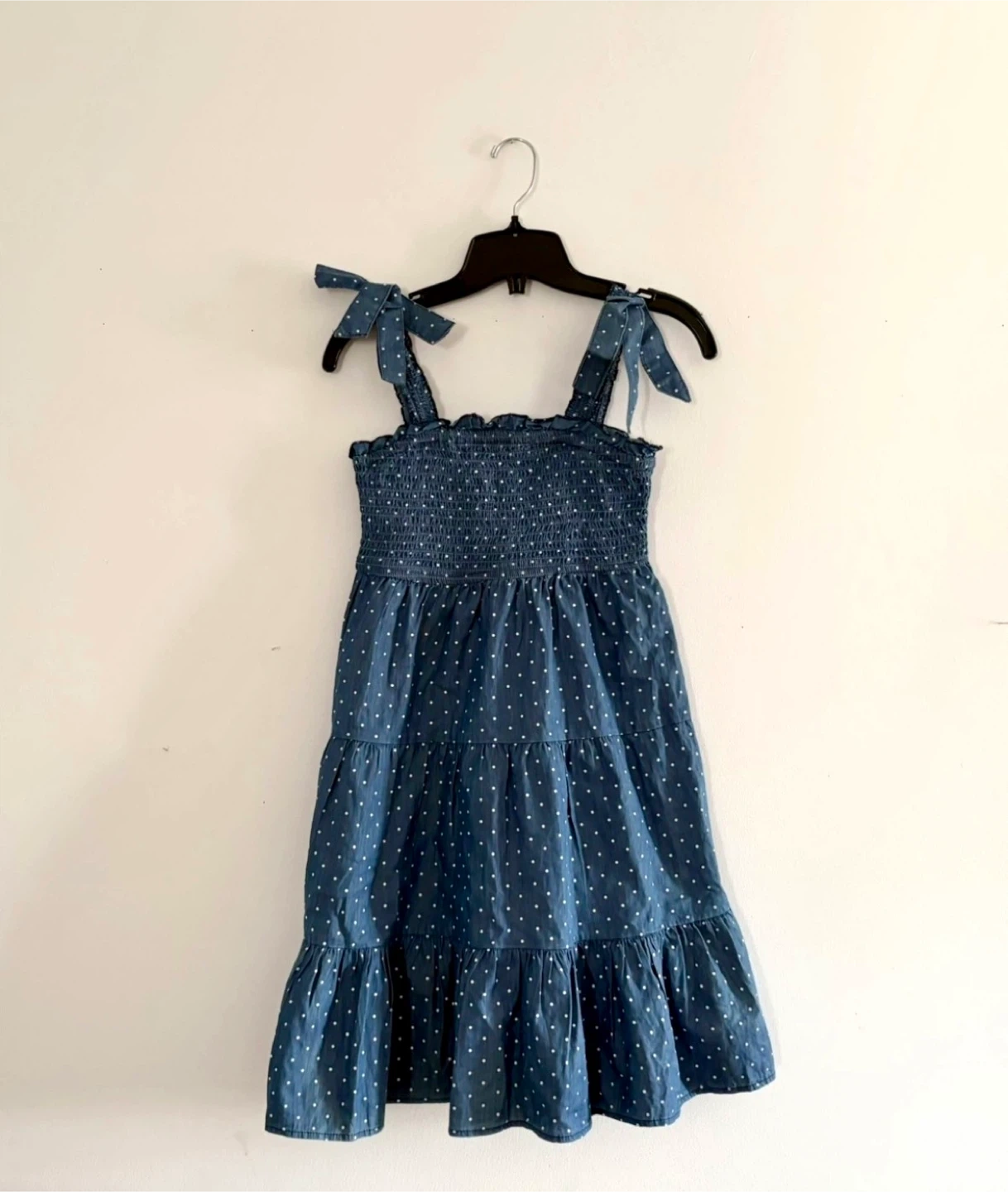 This blue dress features a smocked bodice and tiered skirt with a polka dot pattern.