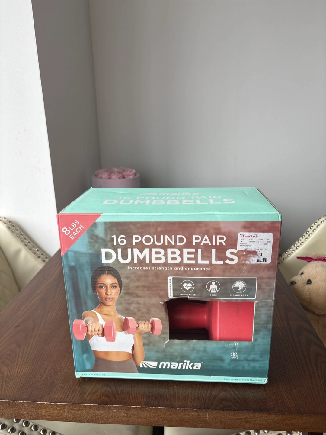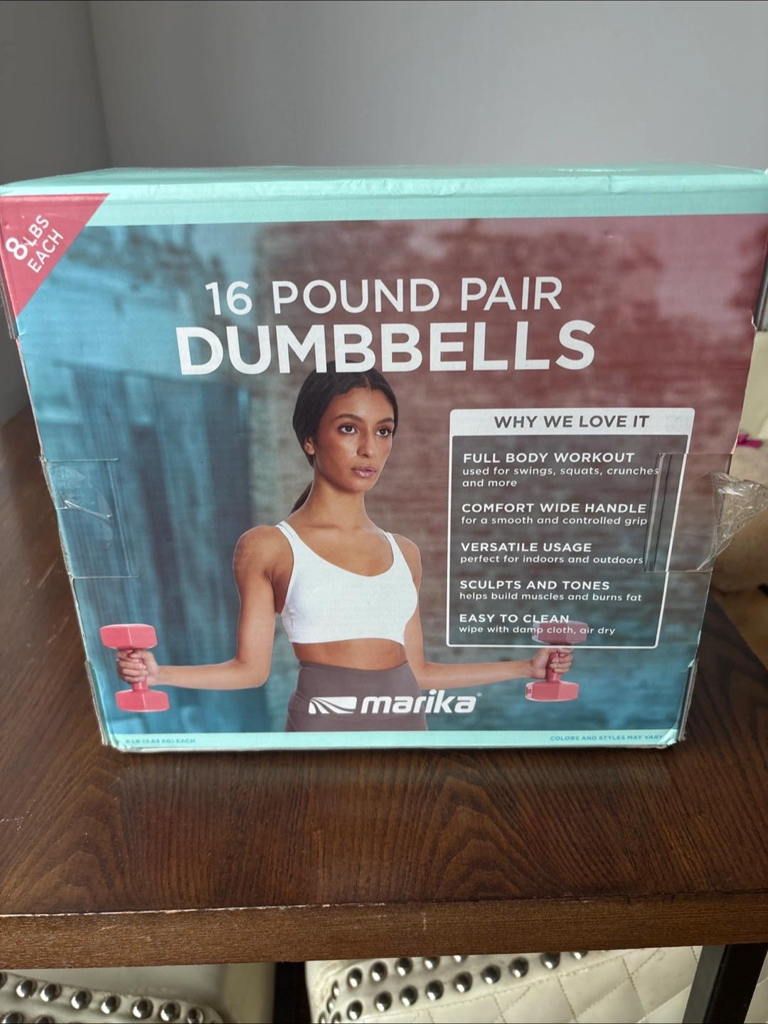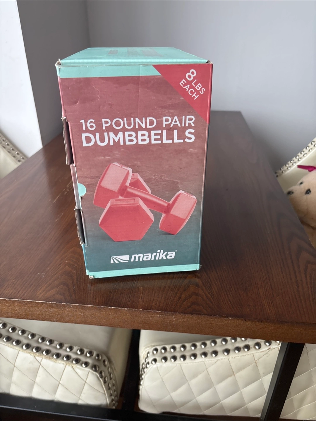 A set of dumbbells in their original packaging. The box has some wear. Using them will bring your body into a comfortable state of relaxation.