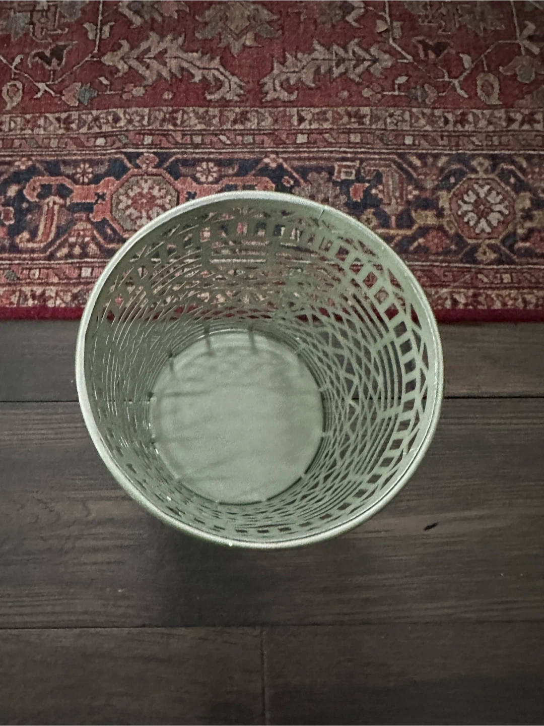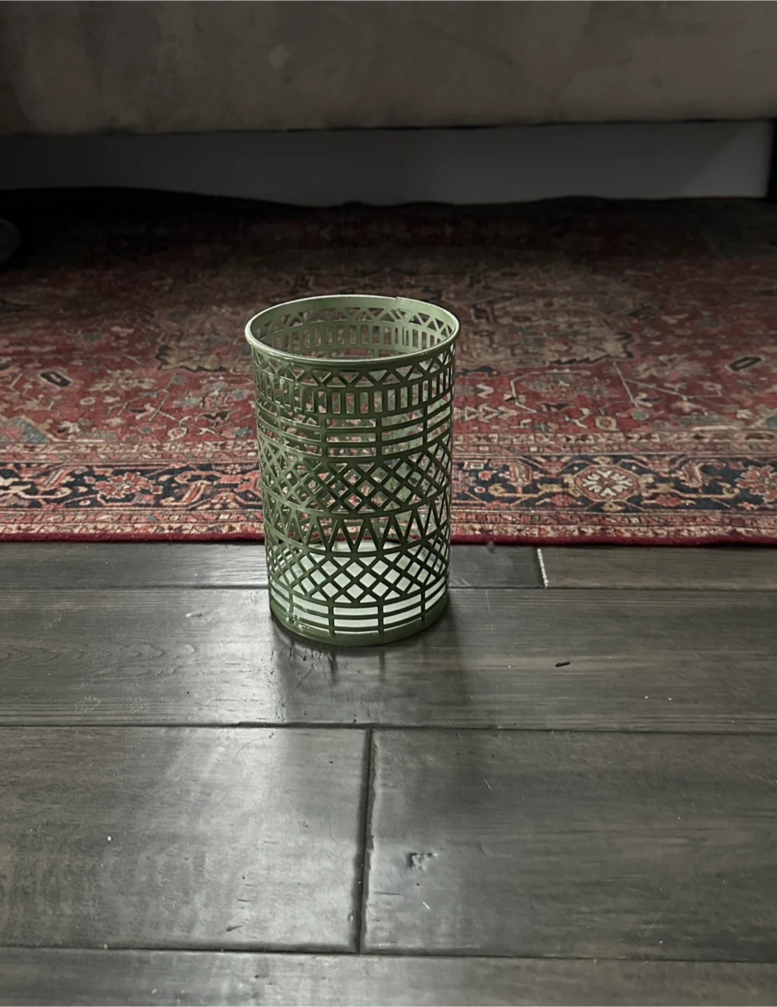 This green metal holder has a decorative lattice pattern. It's about 8 inches tall and 4 inches in diameter. Use it for storage or as a decorative accent!