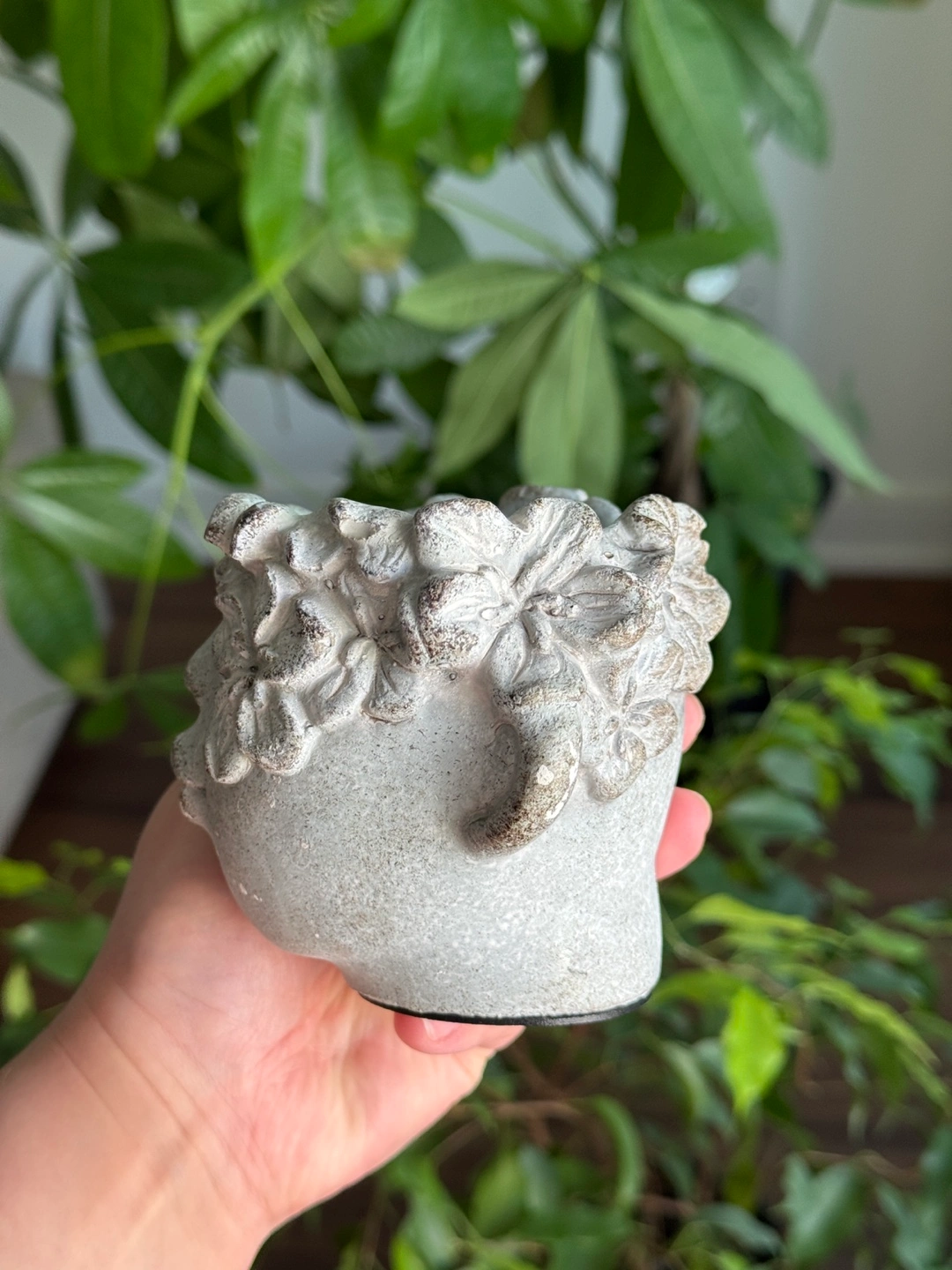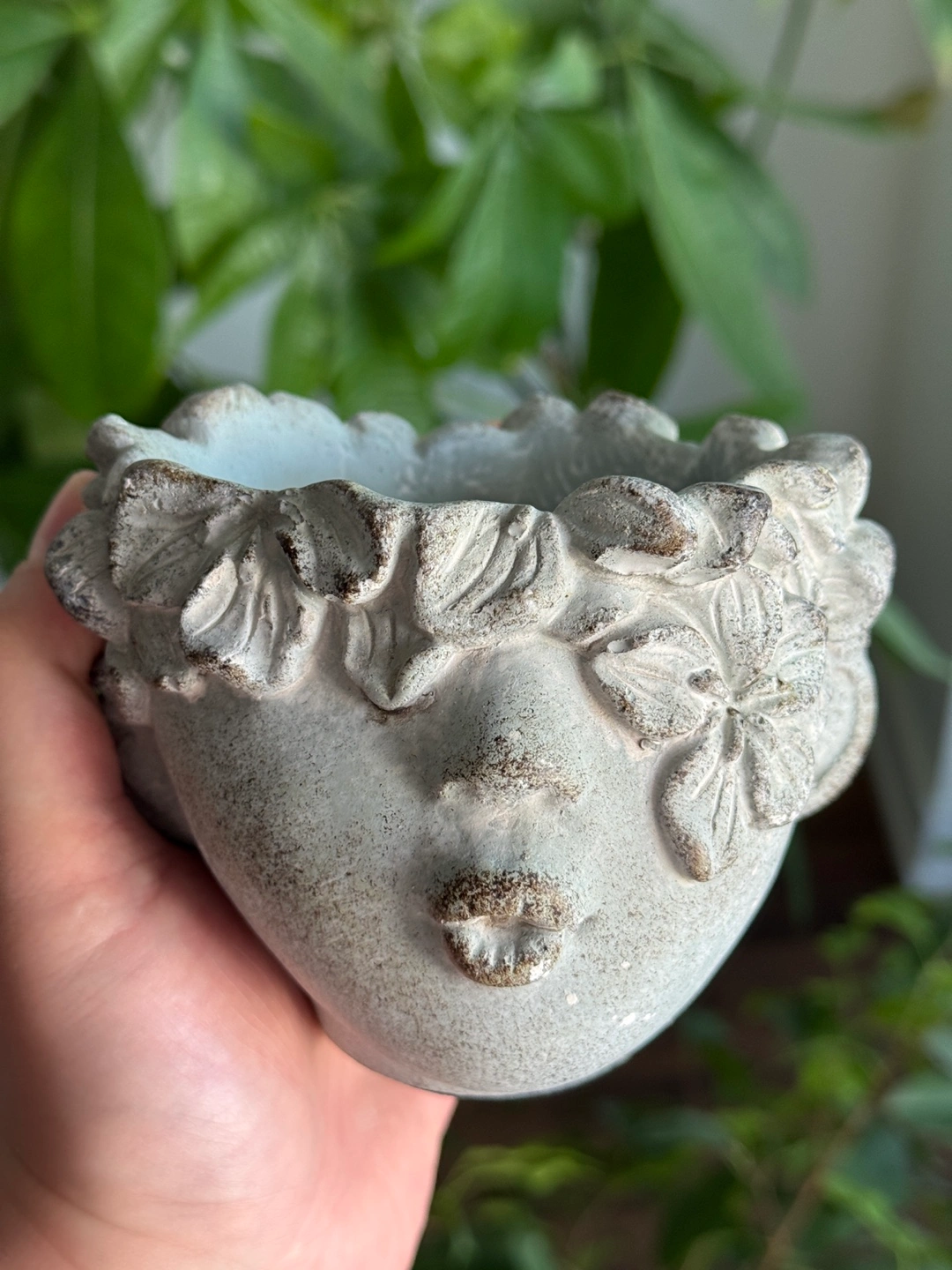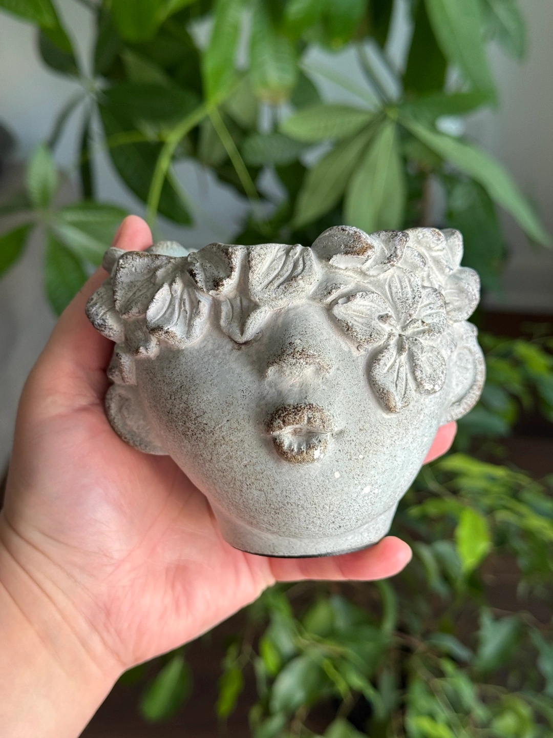 Small grey planter. Shaped like a face with flowers. Perfect for succulents or small plants. Unique home decor.