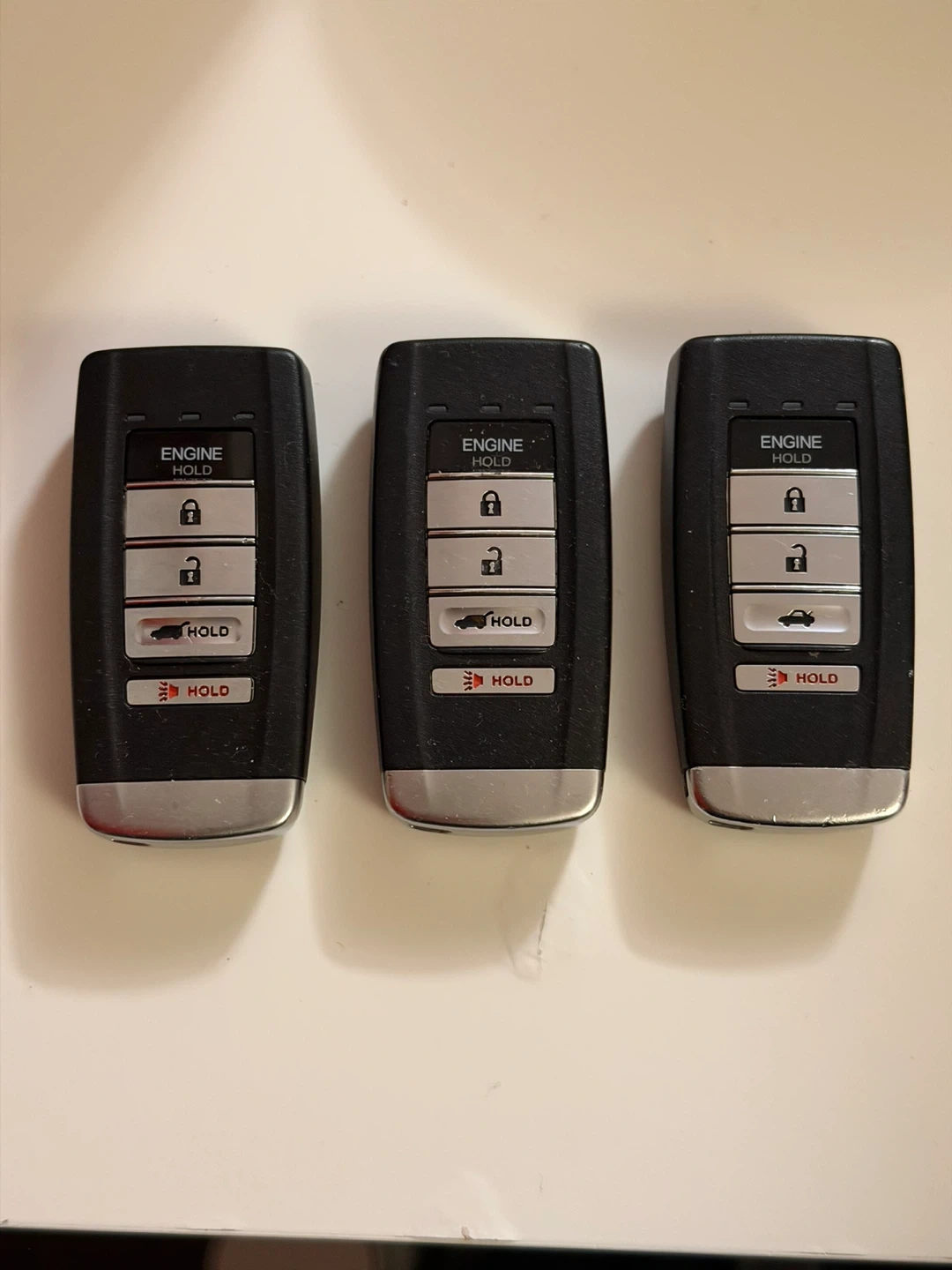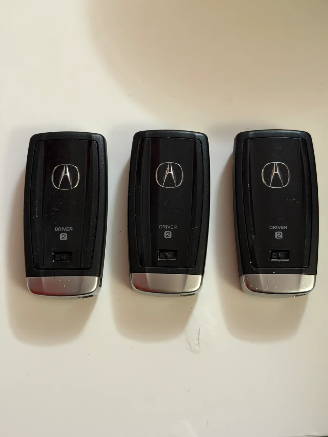 Selling a set of three Acura key fobs. These are black with silver trim and feature buttons for engine start, lock, unlock, and trunk/hood release. "Driver 2" is indicated on one side. They're ready for programming to your vehicle!
