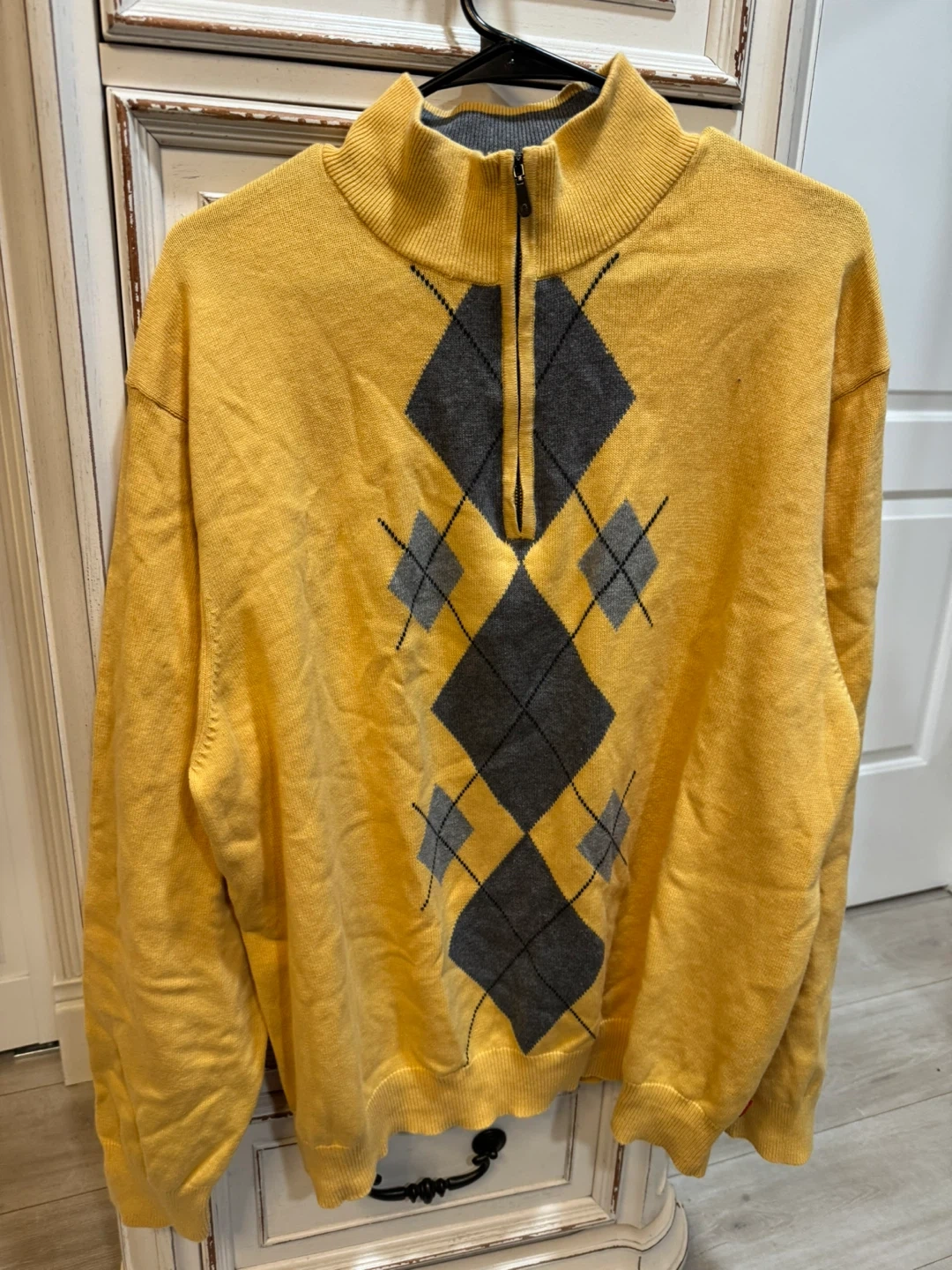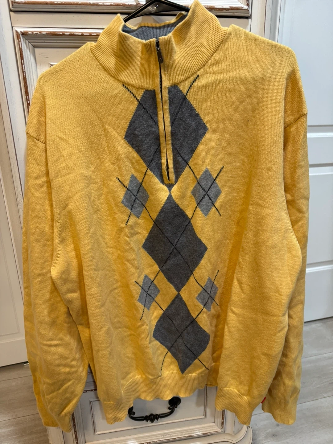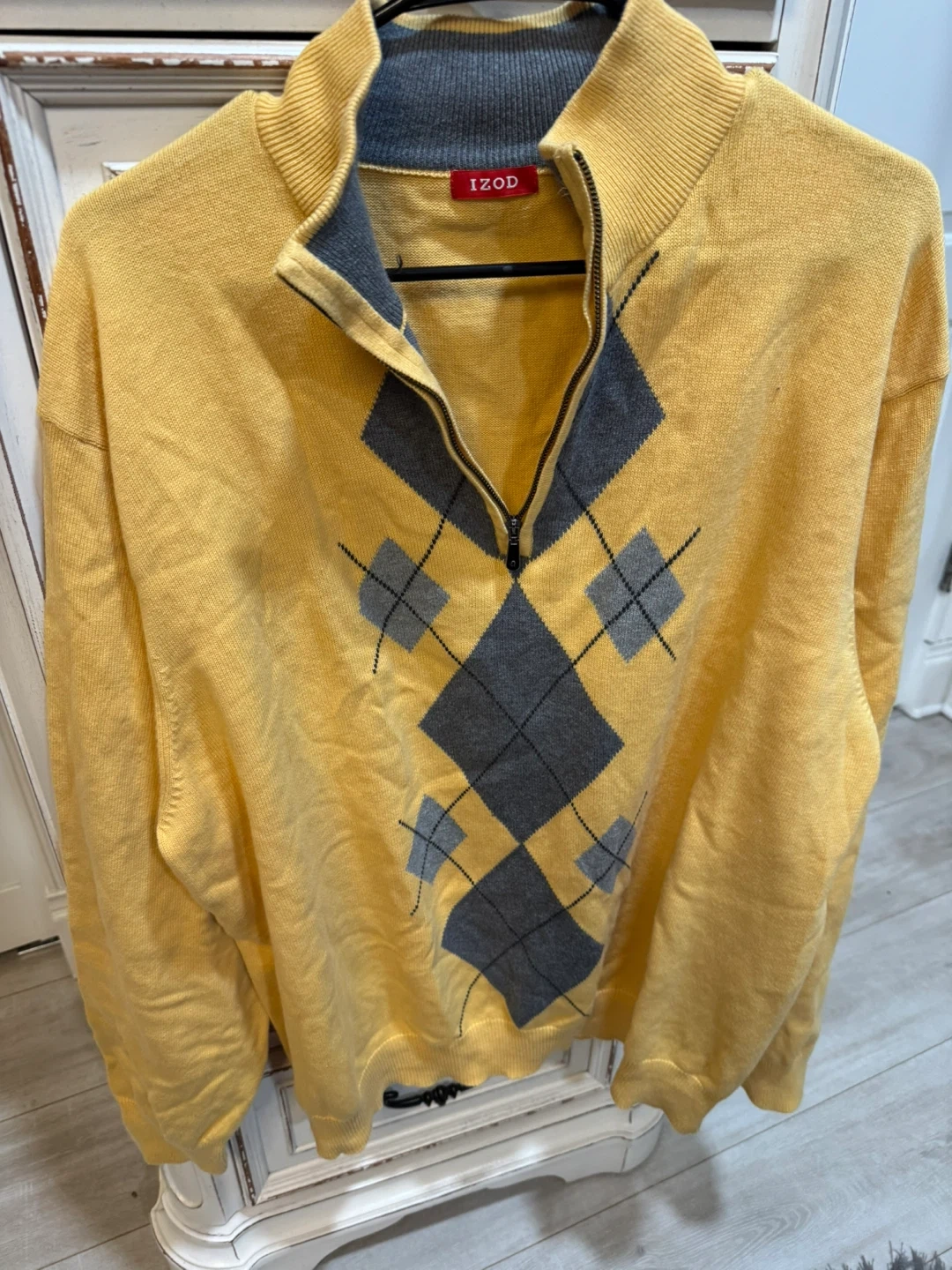 This IZOD sweater features a classic yellow color with a bold gray argyle pattern. It's a quarter-zip pullover style with a mock neck. Made for comfortable wear.