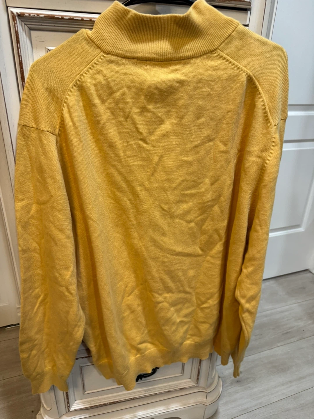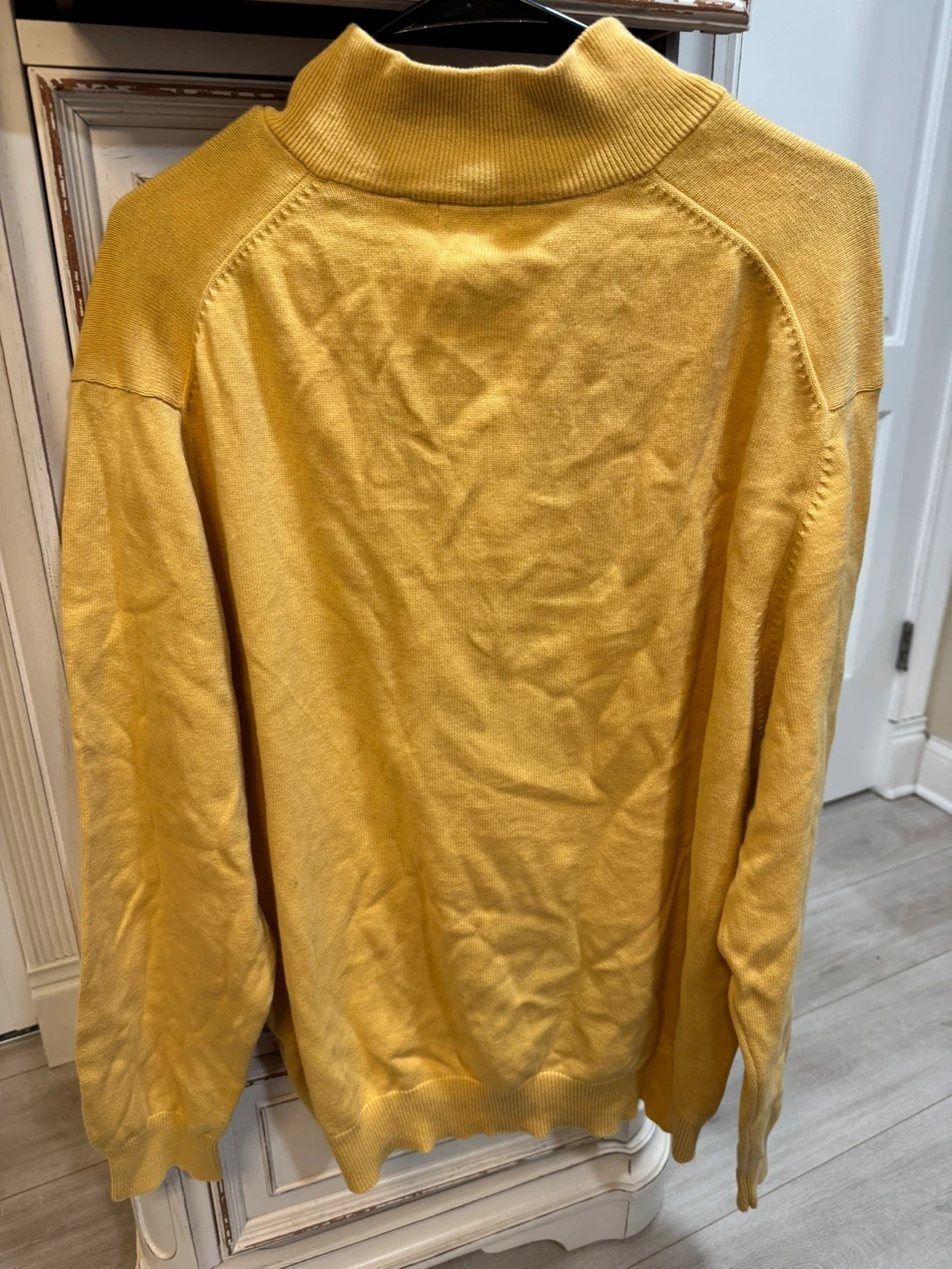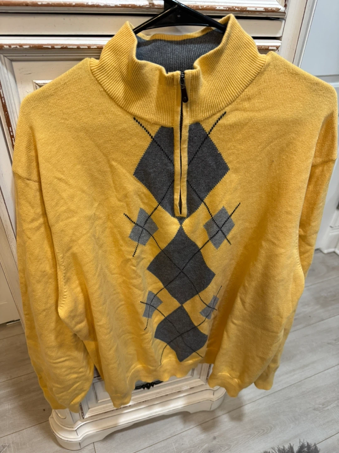 This IZOD sweater features a classic yellow color with a bold gray argyle pattern. It's a quarter-zip pullover style with a mock neck. Made for comfortable wear.