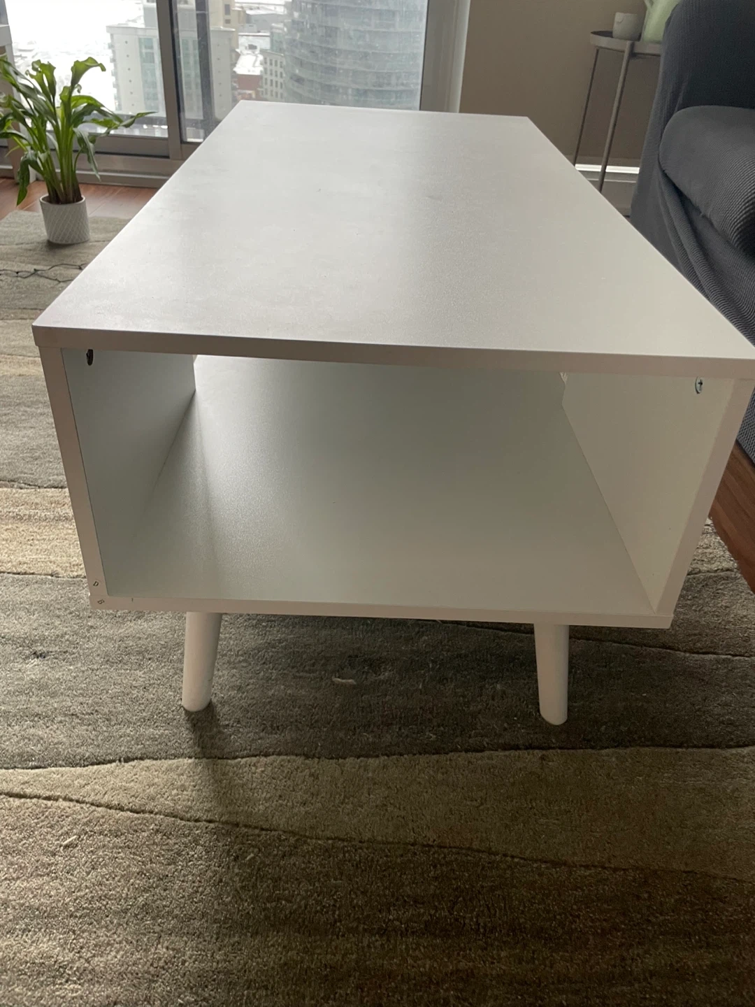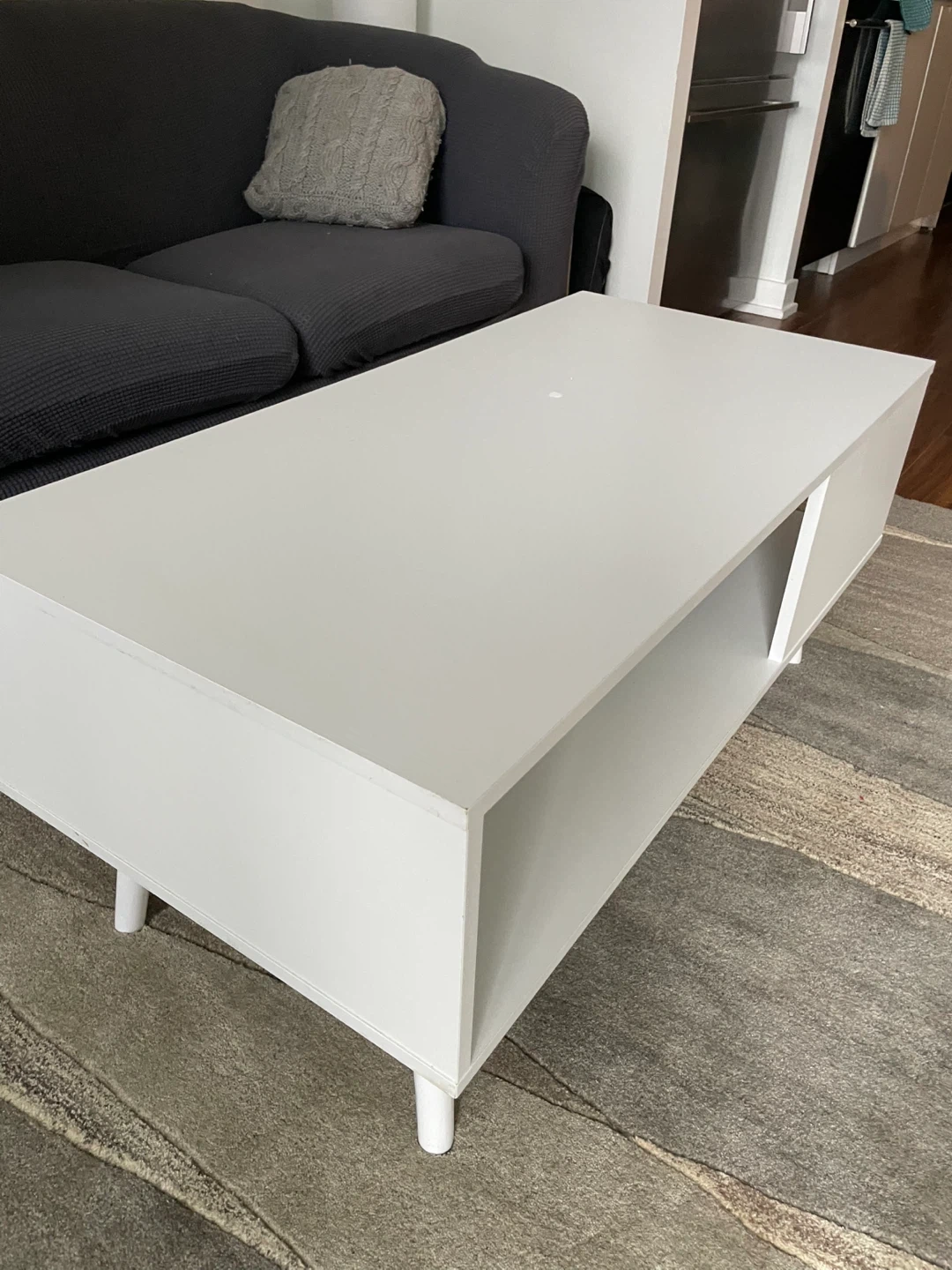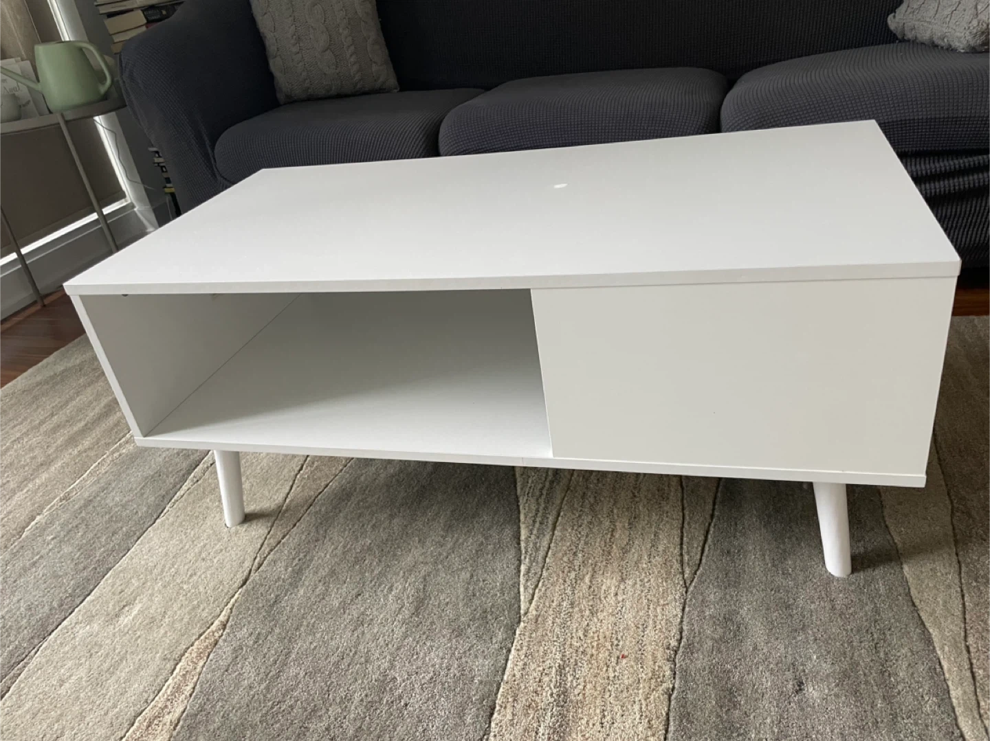 White coffee table featuring a modern design. It has an open shelf and a closed storage compartment. Perfect for your living room!
