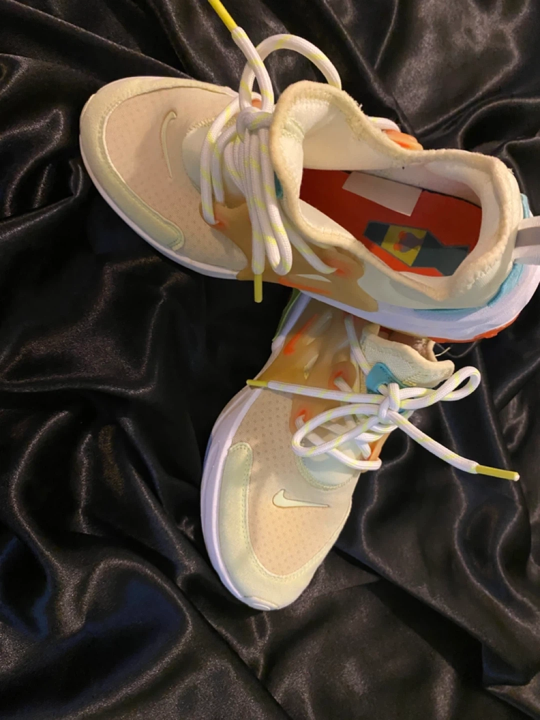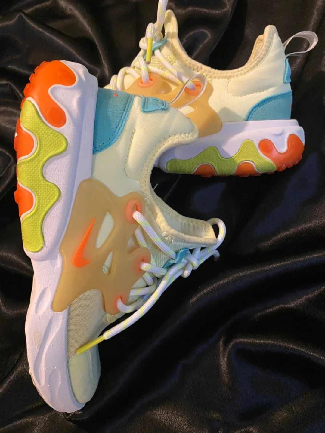 These are Nike Presto React shoes in a size 5Y. They feature a light cream and orange colorway with white laces. Made in Vietnam, with a production date of 01/19/19. Perfect for active kids!