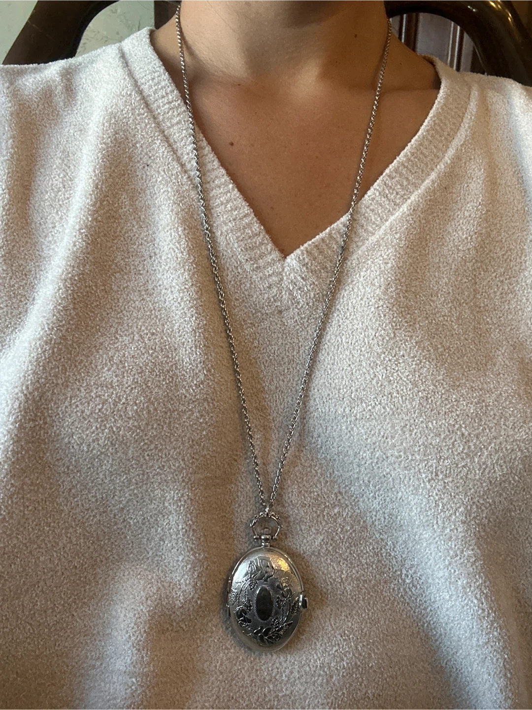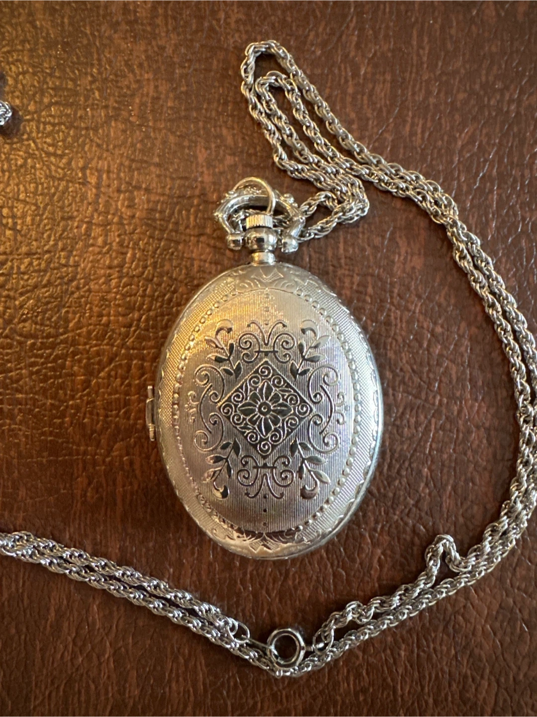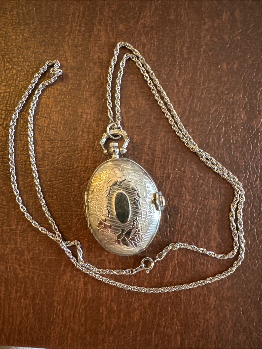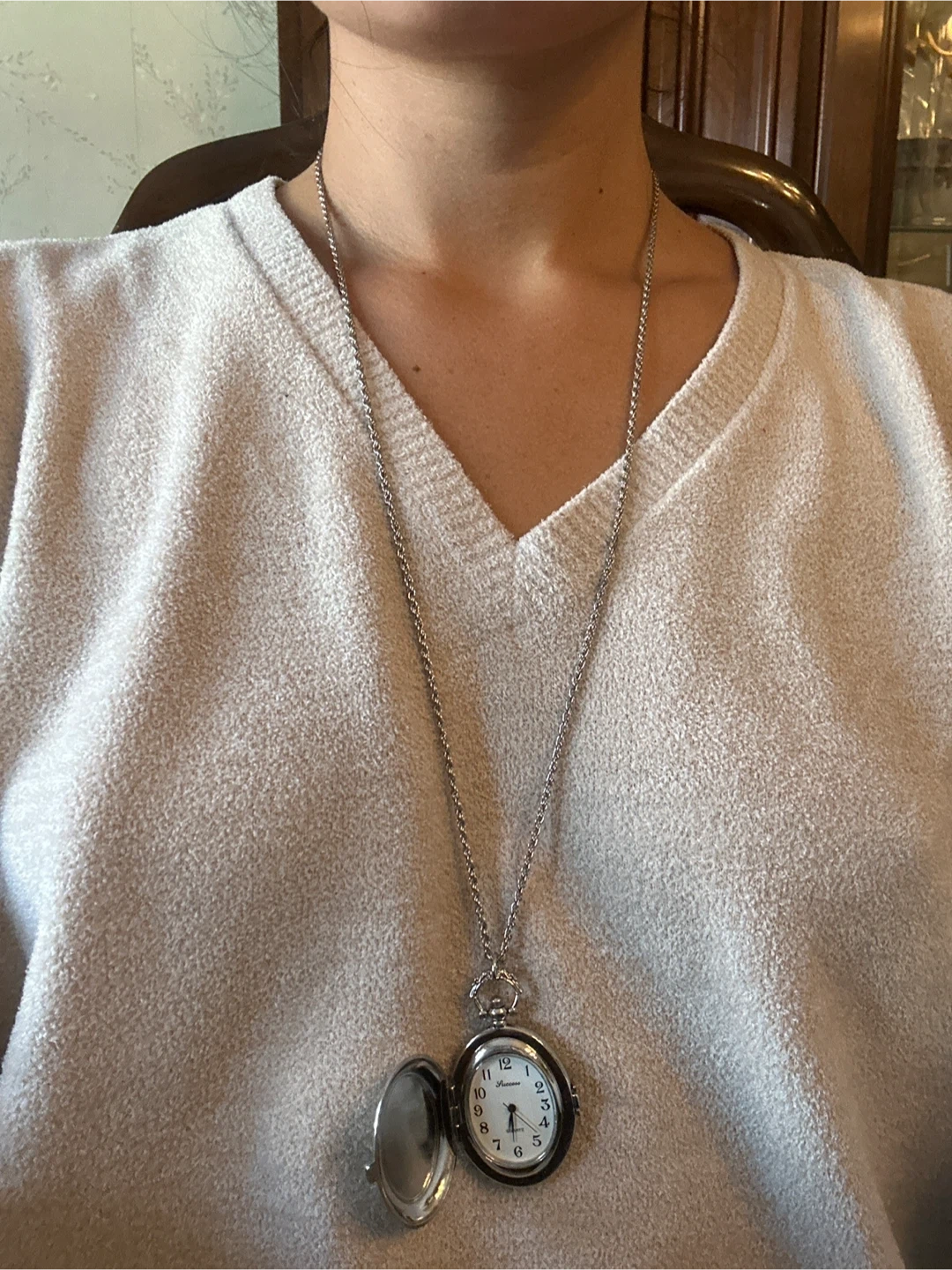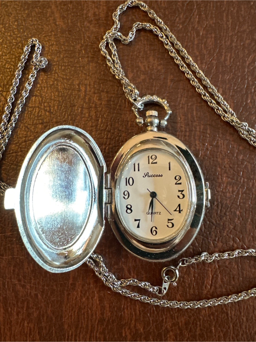 This is a Success brand quartz pocket watch necklace. It's silver-tone with a decorative etched case. The watch opens to reveal a white face with black numbers and hands.