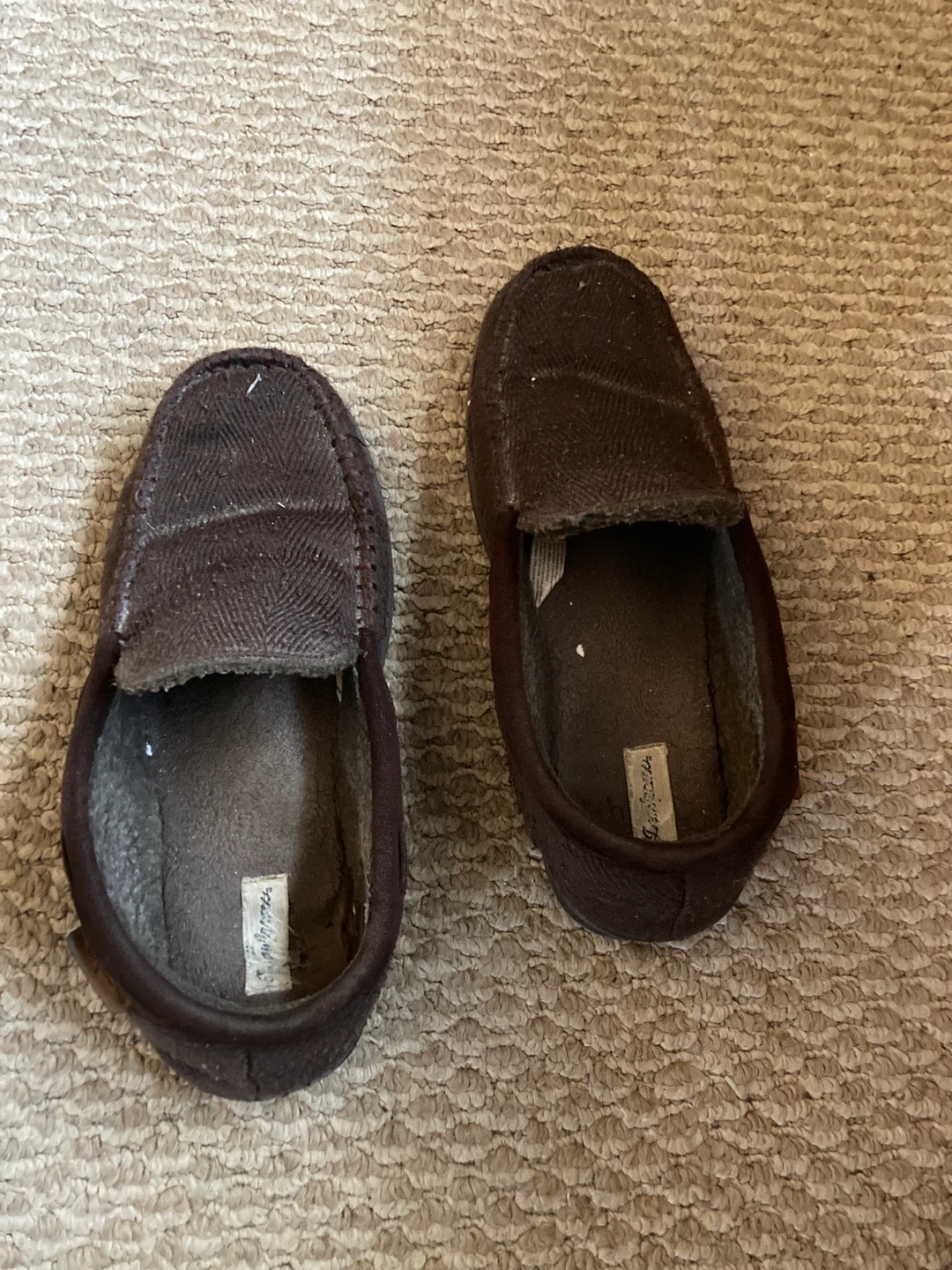 Selling a pair of Dearfoams slippers in brown. They show some signs of wear but are still comfy for padding around the house!