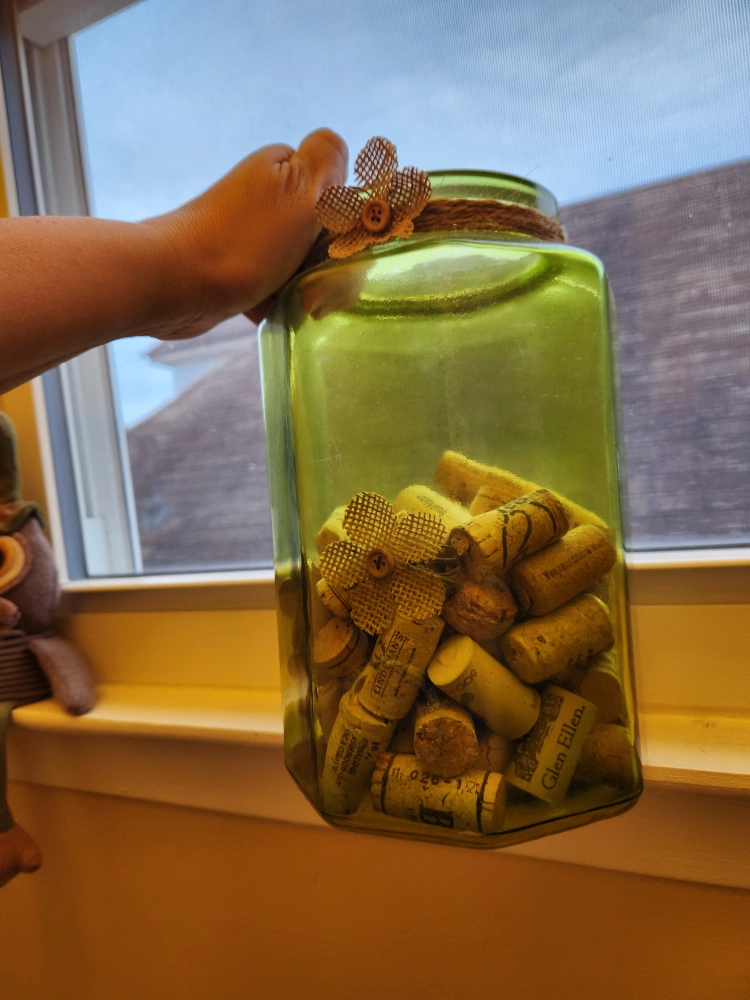 🥕 A beautiful, green glass jar. Decorated with twine and a flower on the top. Filled with corks. This would be perfect as a centerpiece on a table to create a lovely, peaceful atmosphere.