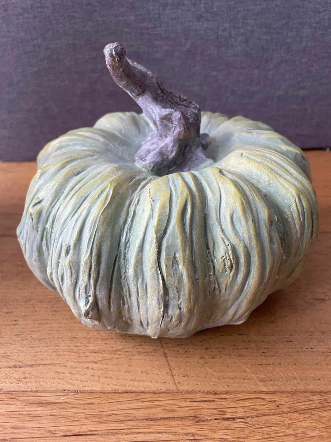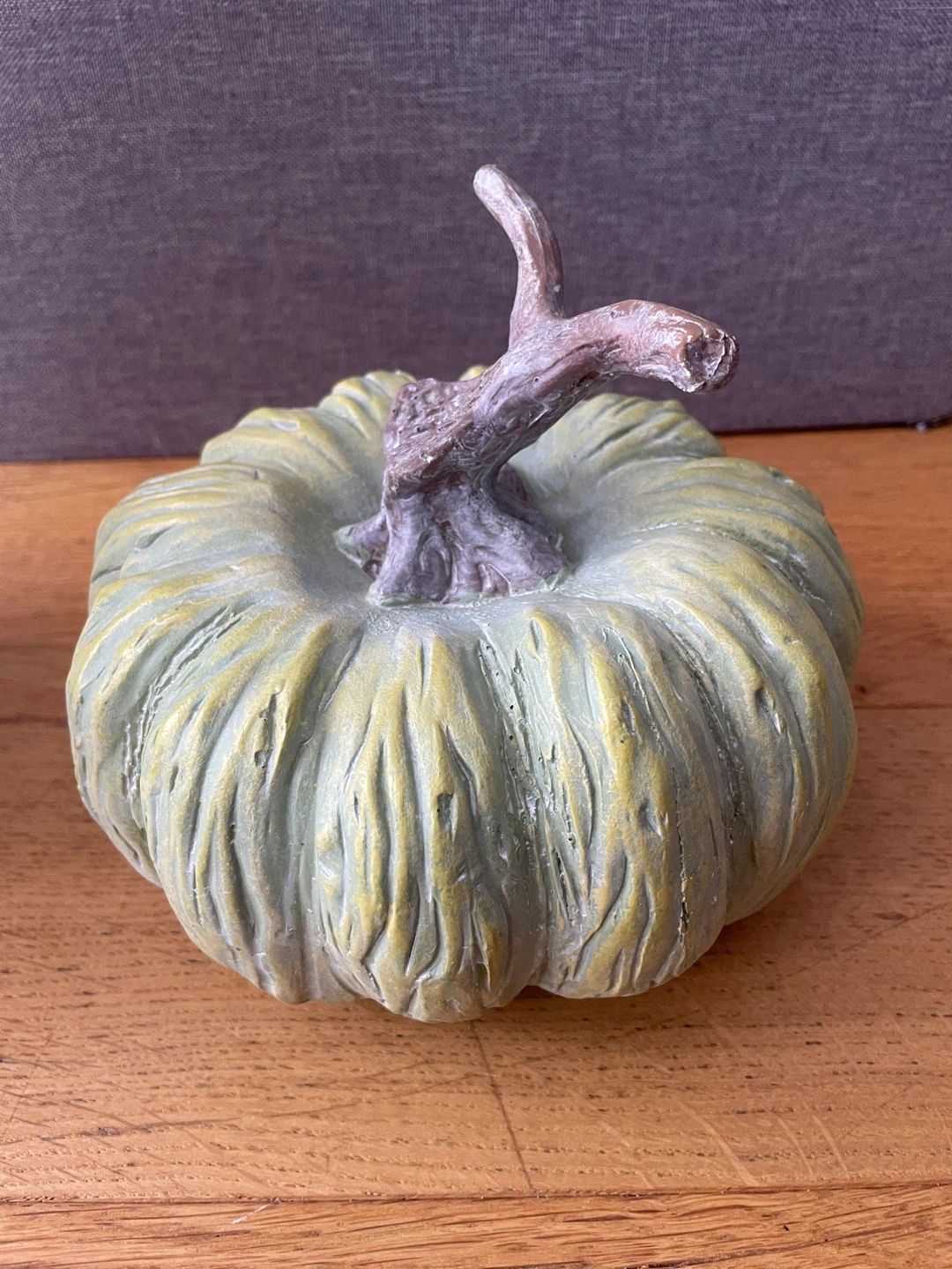 Here's a decorative green pumpkin, perfect for fall decorating! It's in great condition and would look lovely on a table or shelf