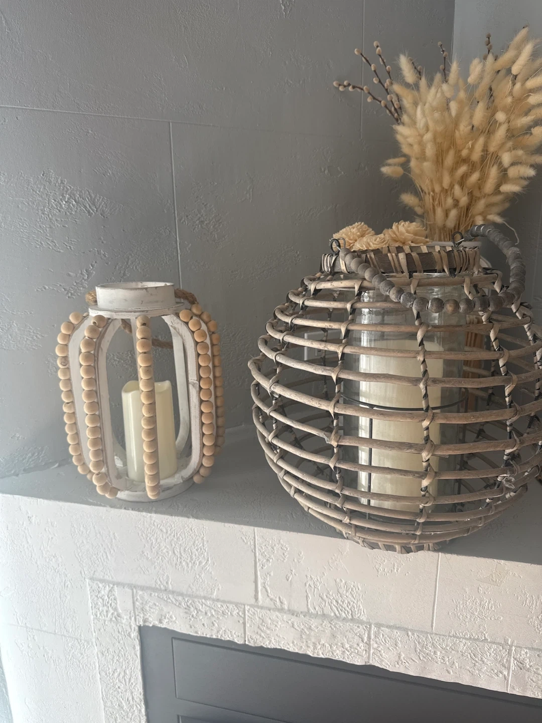 60Selling two decorative lanterns. One is a white wooden lantern with beads, and the other is a woven lantern with a glass insert. They both add a cozy touch to any room!