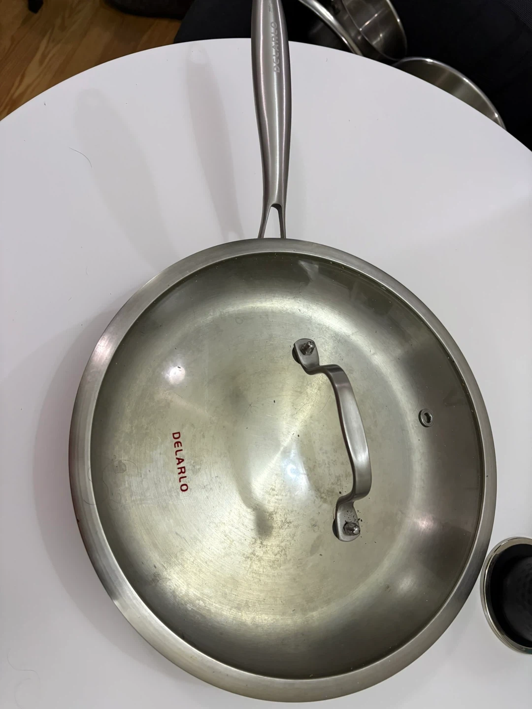 Selling a DELARLO stainless steel n w/ lid. It has a handle on top and a long handle on the side. It's in good condition and ready for a new home