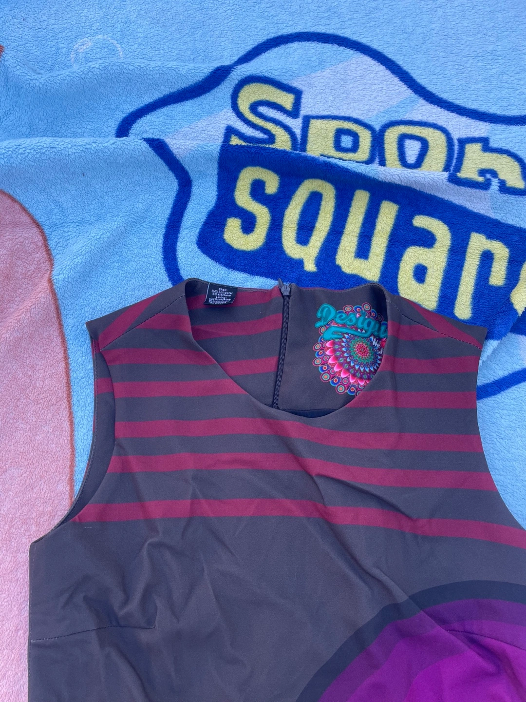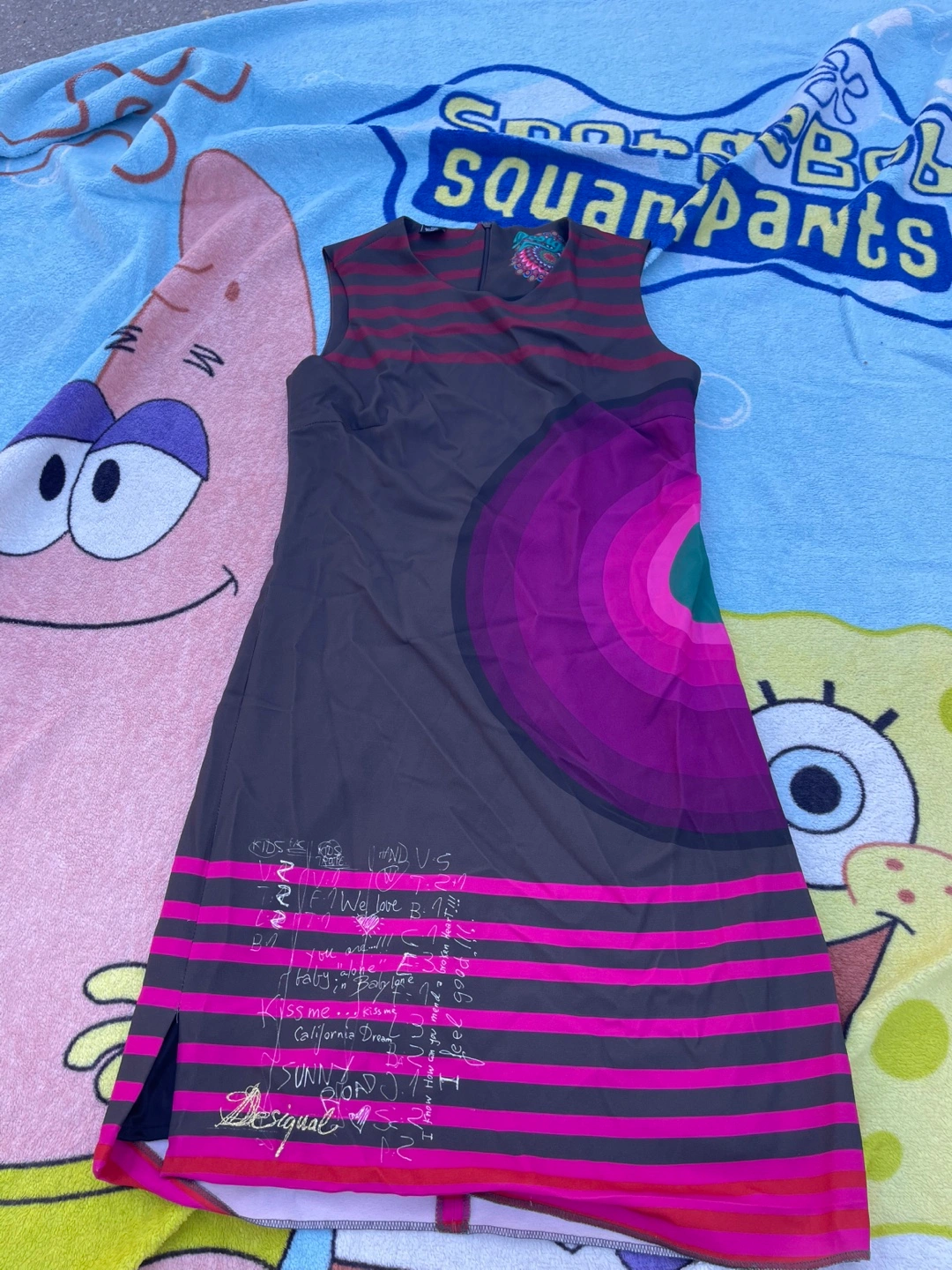 Desigual dress with a colorful design. The dress features a unique pattern with stripes and a circular graphic element. Perfect for adding a pop of color to your wardrobe!