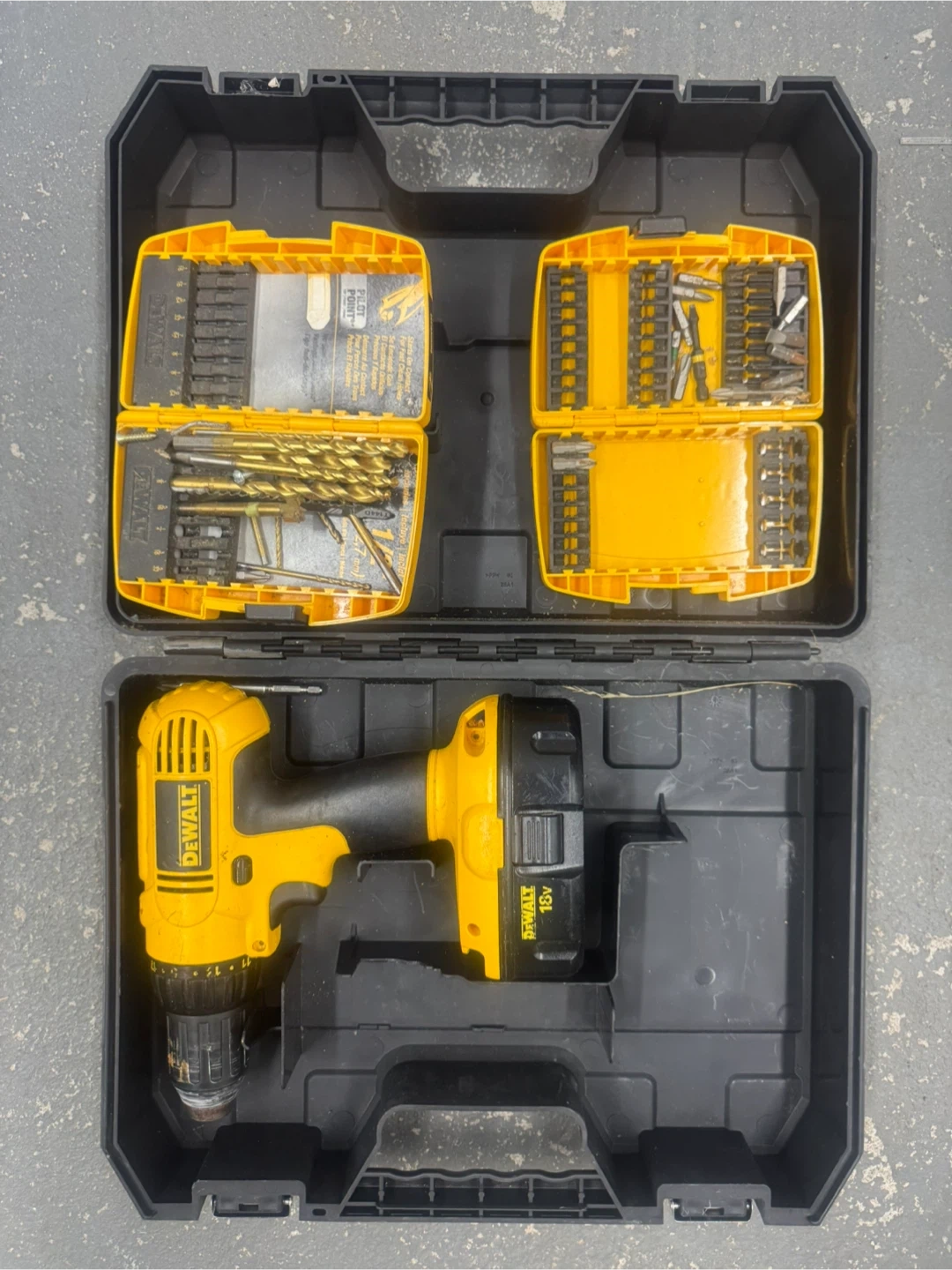 60Selling a DeWalt 18V cordless drill driver kit. It comes with the drill, battery, charger, and a variety of drill bits and driver bits, all neatly organized in a carrying case. Perfect for any DIY projects around the house!