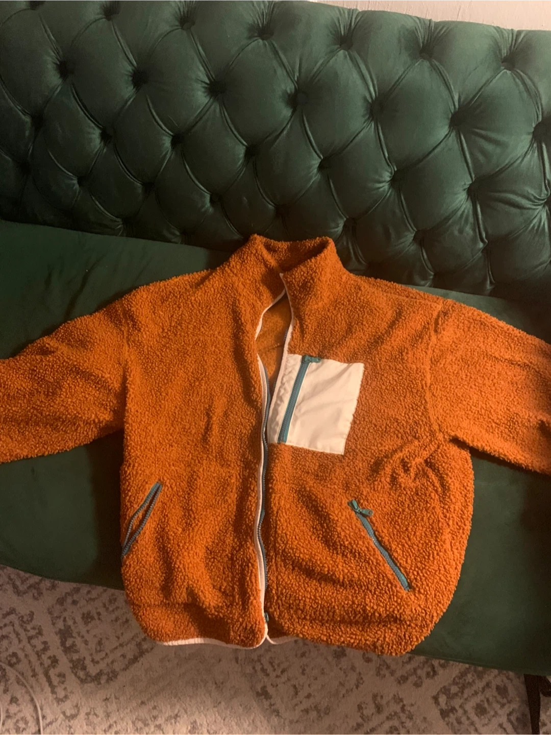 Giving away this sherpa jacket. I love this jacket but it got damaged in the dryer😞 it got burned in some parts, so it feels crusty on the interior and exterior. It might be fixable? Please take it.