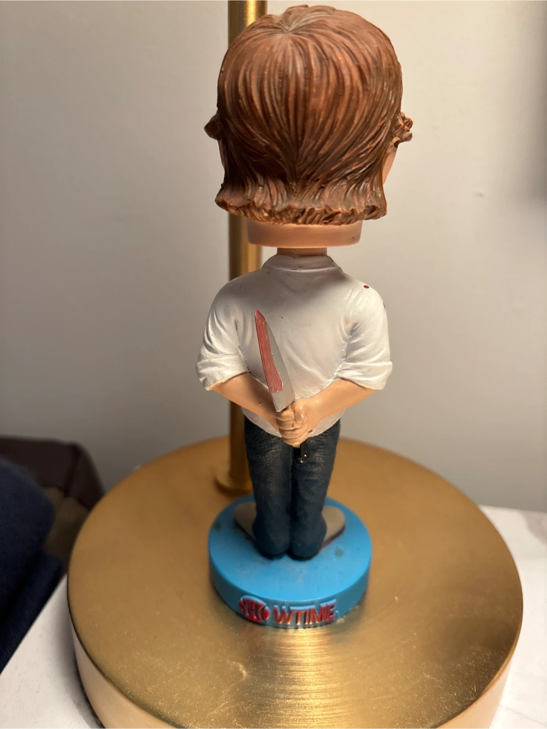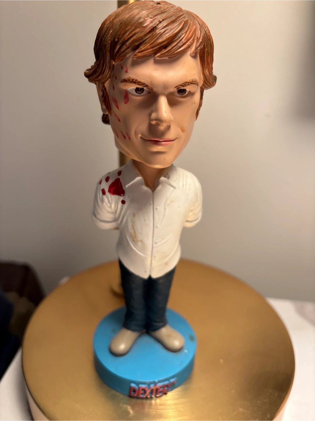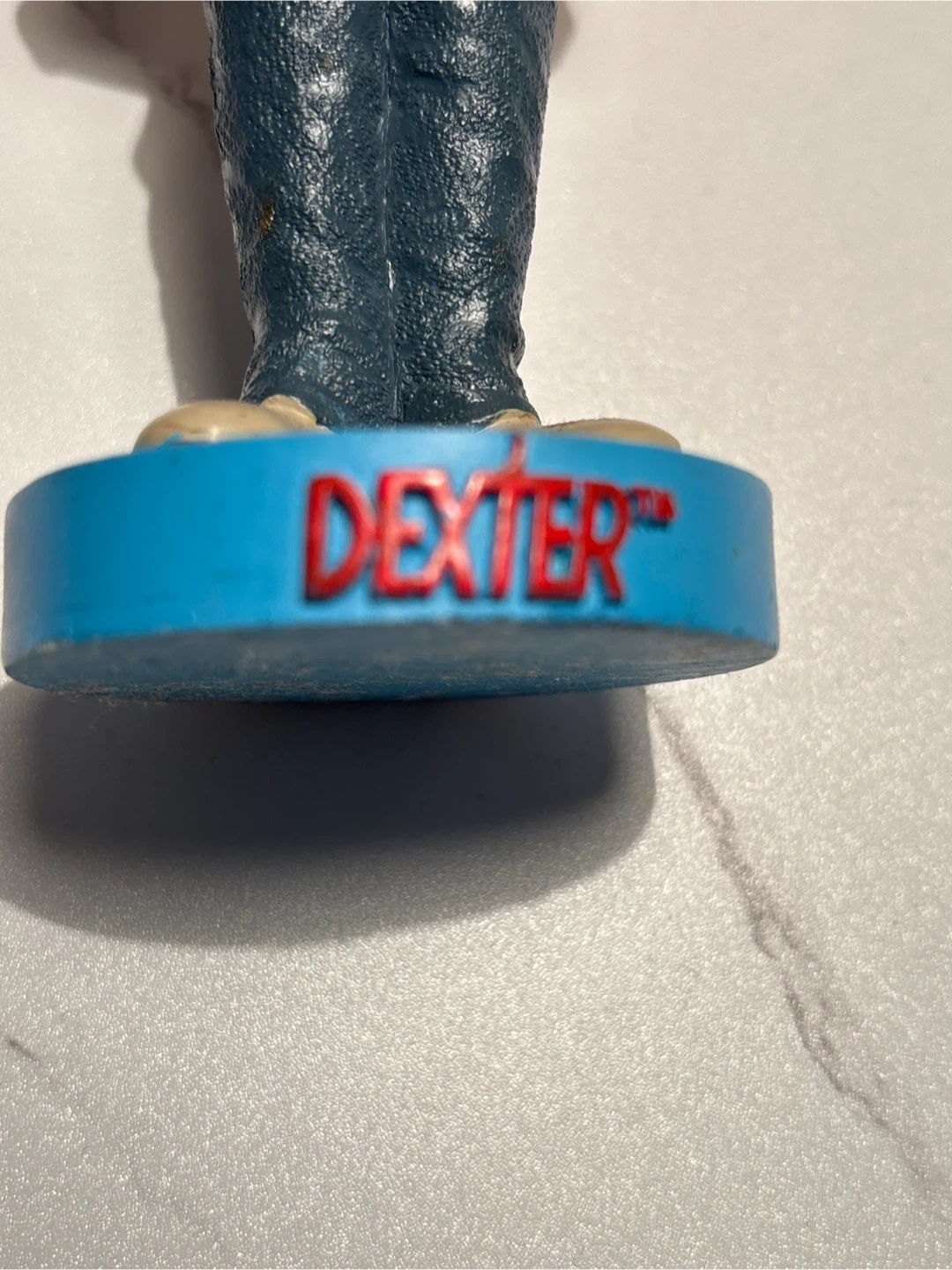 Selling a Dexter bobblehead figure from Showtime! It's about 7 inches tall and in good condition. The bobblehead is standing on a blue base with the Dexter logo. $89 on eBay