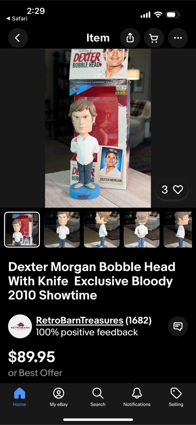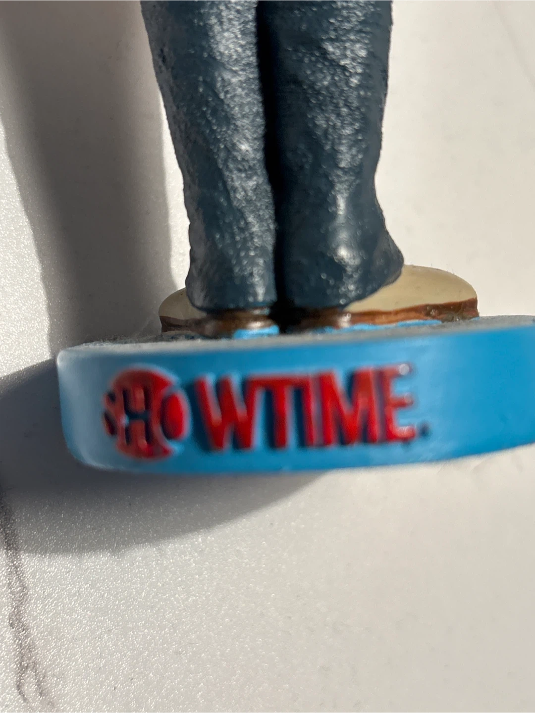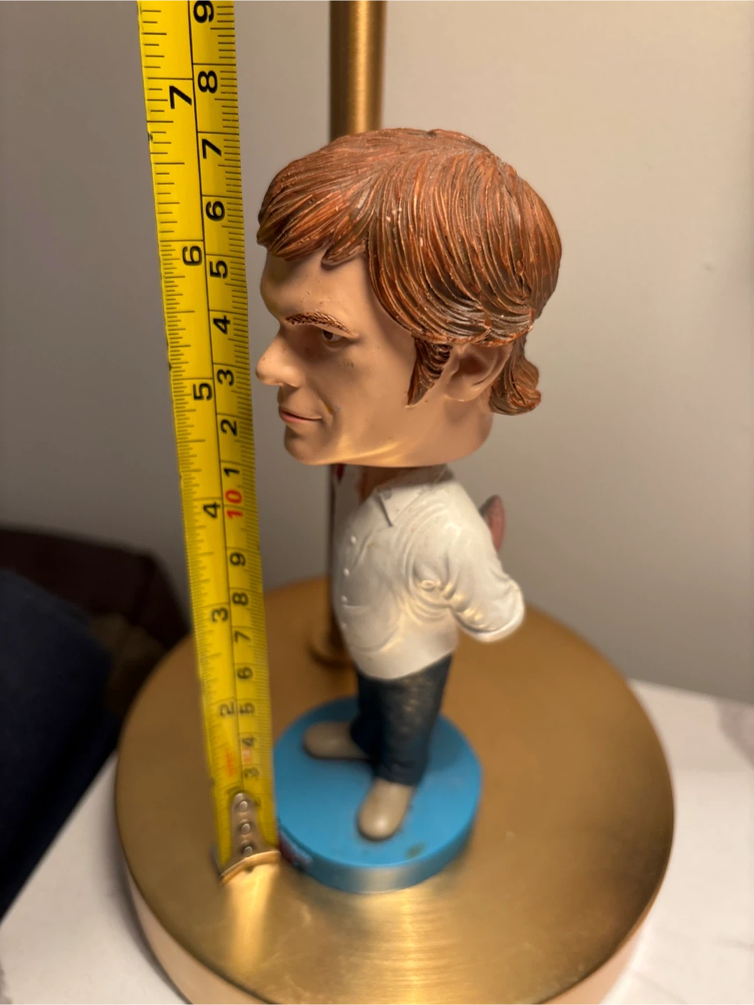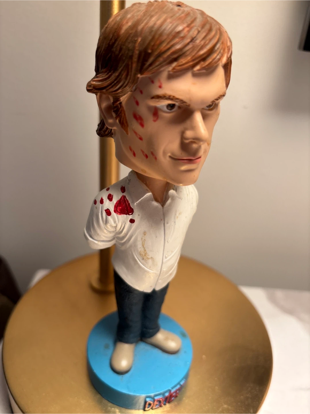 Selling a Dexter bobblehead figure from Showtime! It's about 7 inches tall and in good condition. The bobblehead is standing on a blue base with the Dexter logo. $89 on eBay