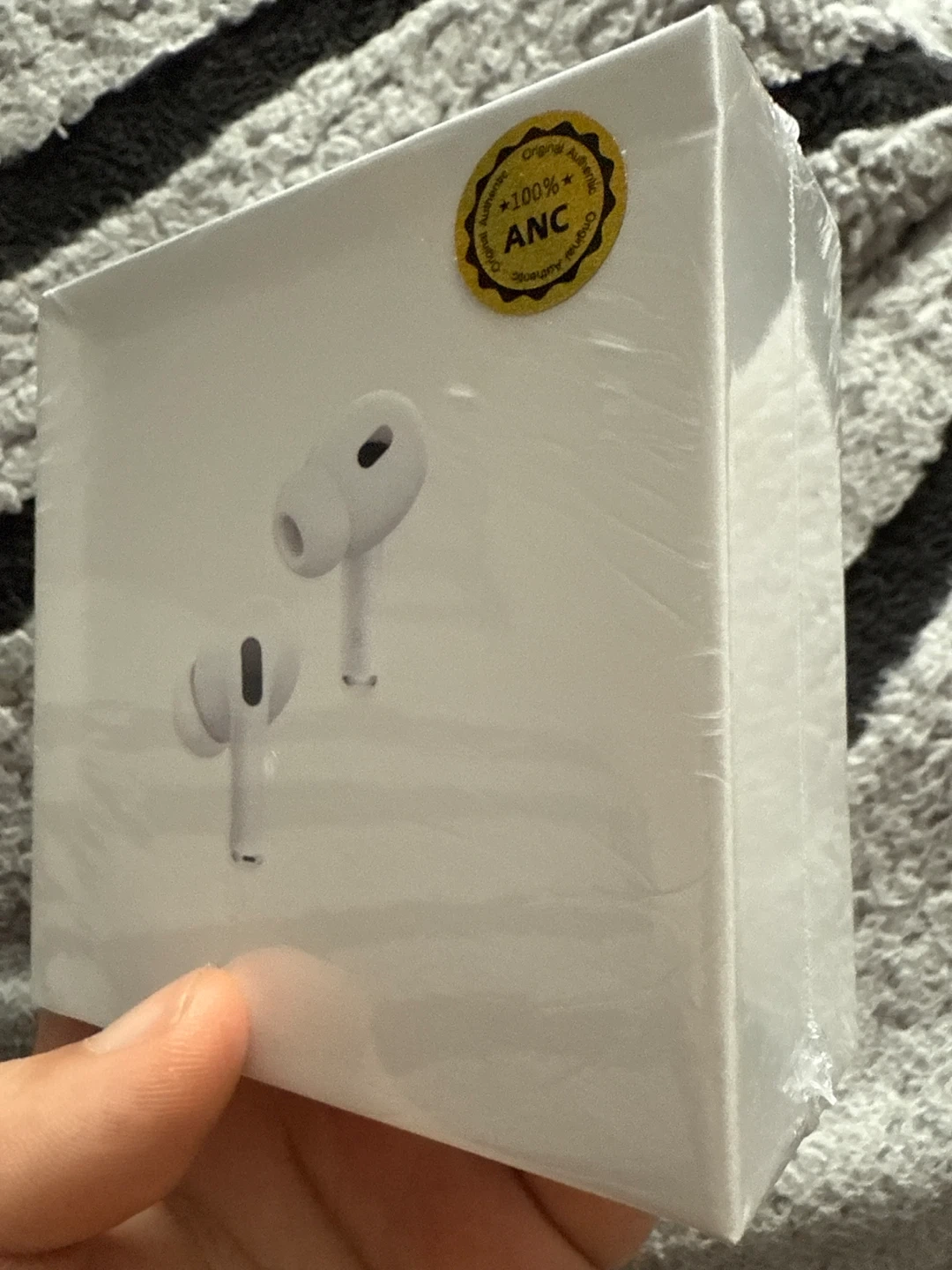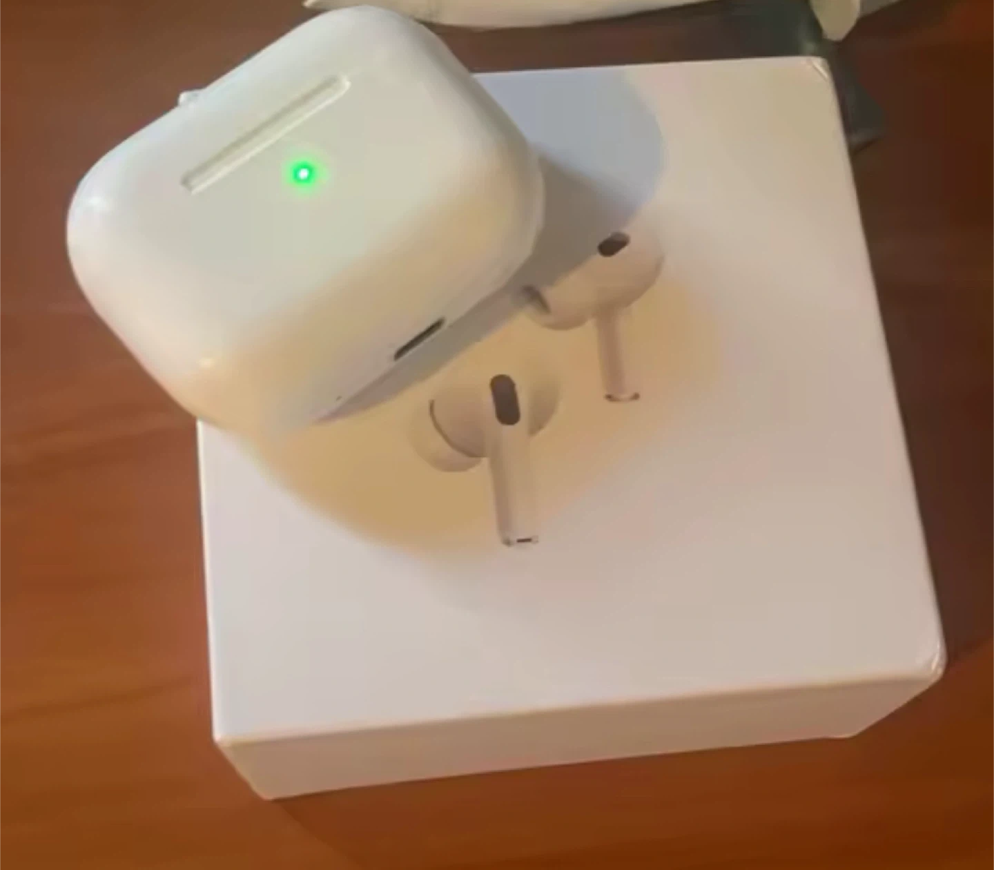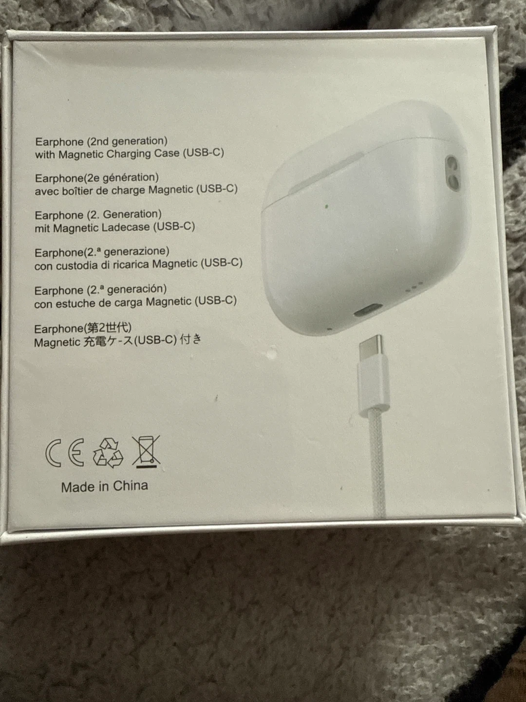 Apple AirPods Pro (2nd generation) with MagSafe Charging Case (USB-C). Includes earphones and charging case. Made in China.