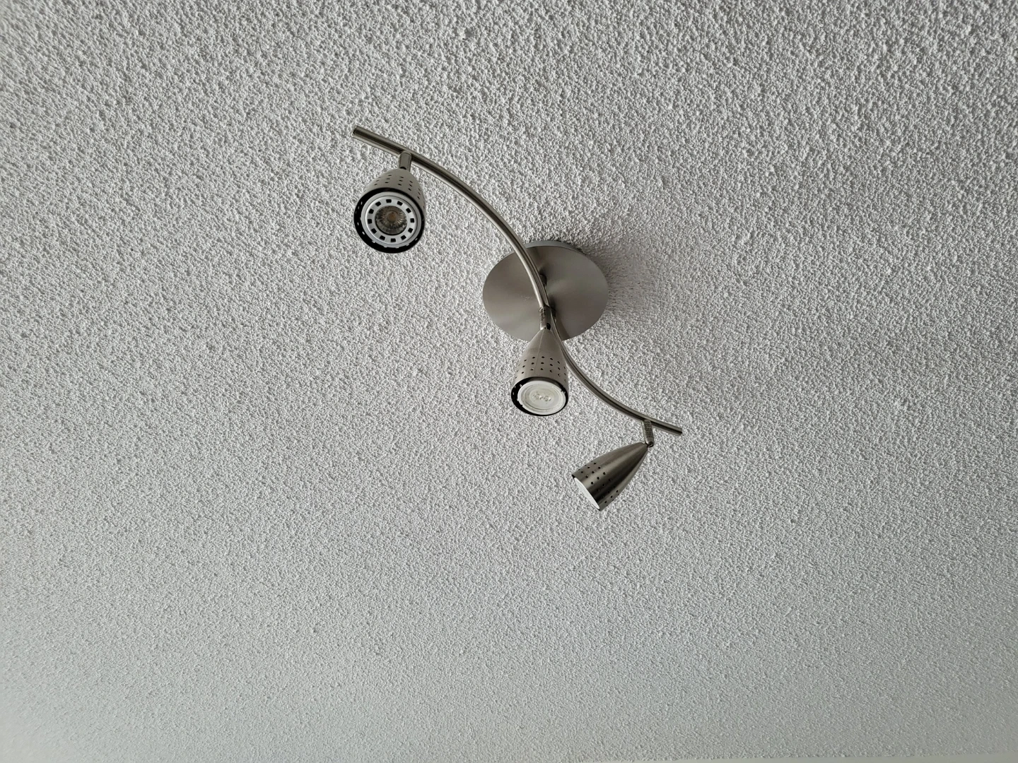 This is a three-headed track light fixture with adjustable heads. It's made of brushed metal and mounts to the ceiling. The heads can be directed to illuminate different areas.