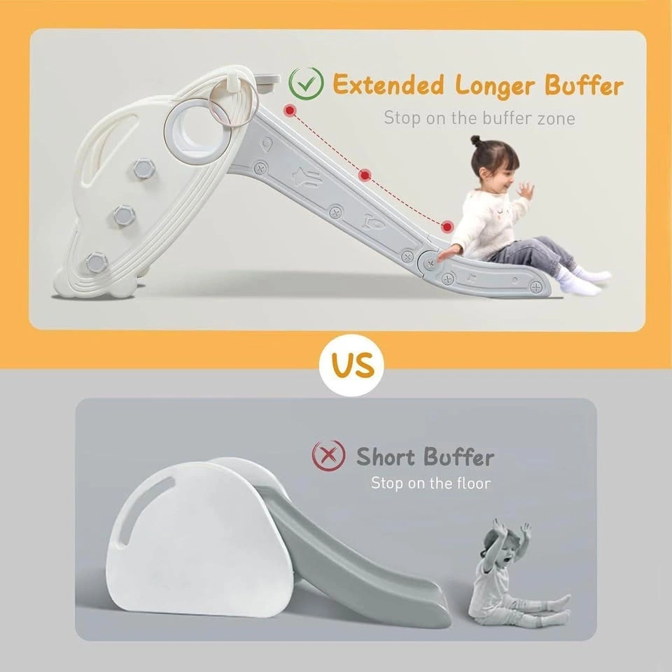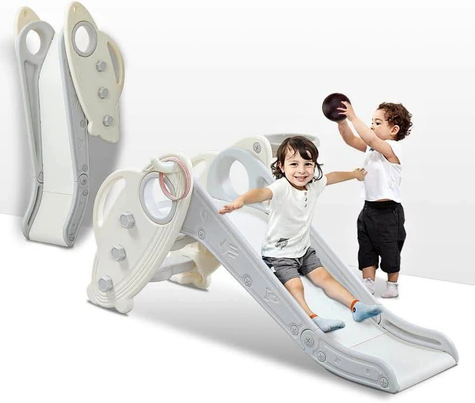 This toddler slide is designed for easy setup and forms a stable, safe triangular structure. It features an anti-slip mat for extra stability and folds compactly for easy storage or transport. The playset offers a variety of activities including a basketball hoop and ring toss game, perfect for indoor or backyard fun. It's designed to enhance playtime, encouraging sports, learning, and exercise. The handrail is easy for little hands to grip, and the non-slip pedal is at a reasonable height. The spacious waiting area provides a secure climbing experience. The slide has an extra-long slope with a buffer at the end for a safe, controlled stop. Made from non-toxic, odorless HDPE+PP material, the surface is polished smooth and free of burrs for baby's safety. Recommended age is 6-36 months. Parental supervision is advised for children under 2 years old.