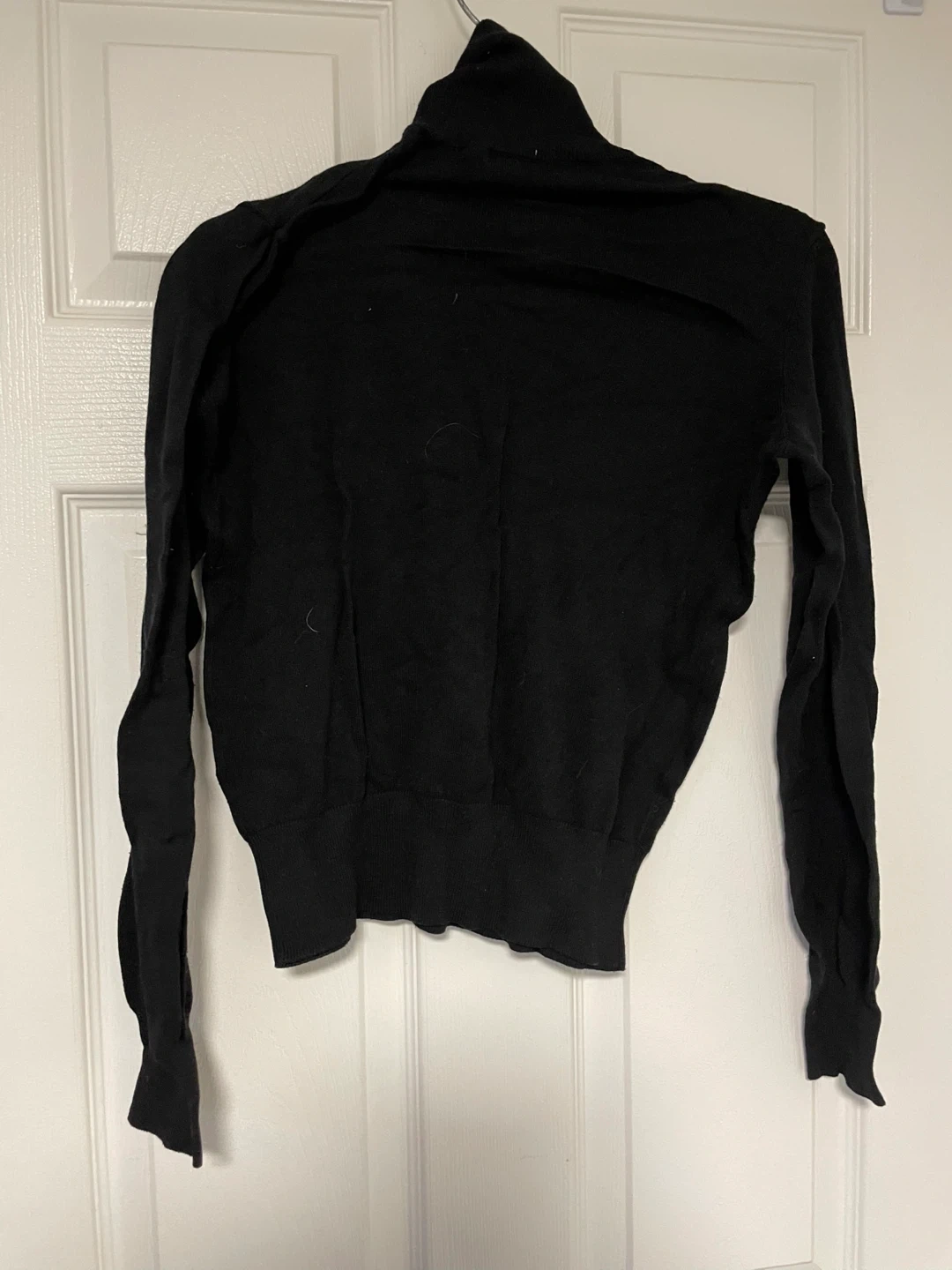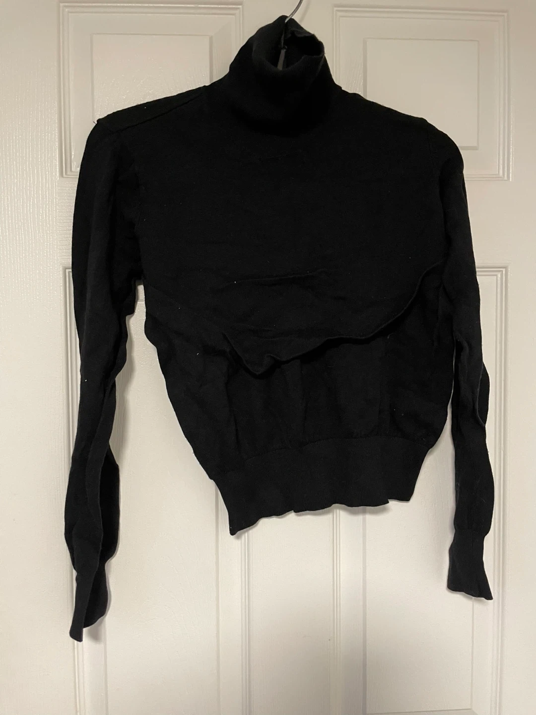 Selling a gently used H&M black turtleneck sweater in size small. It's a stylish and comfortable piece, perfect for layering or wearing on its own. The material is soft and has a nice stretch to it. Great for fall or winter!