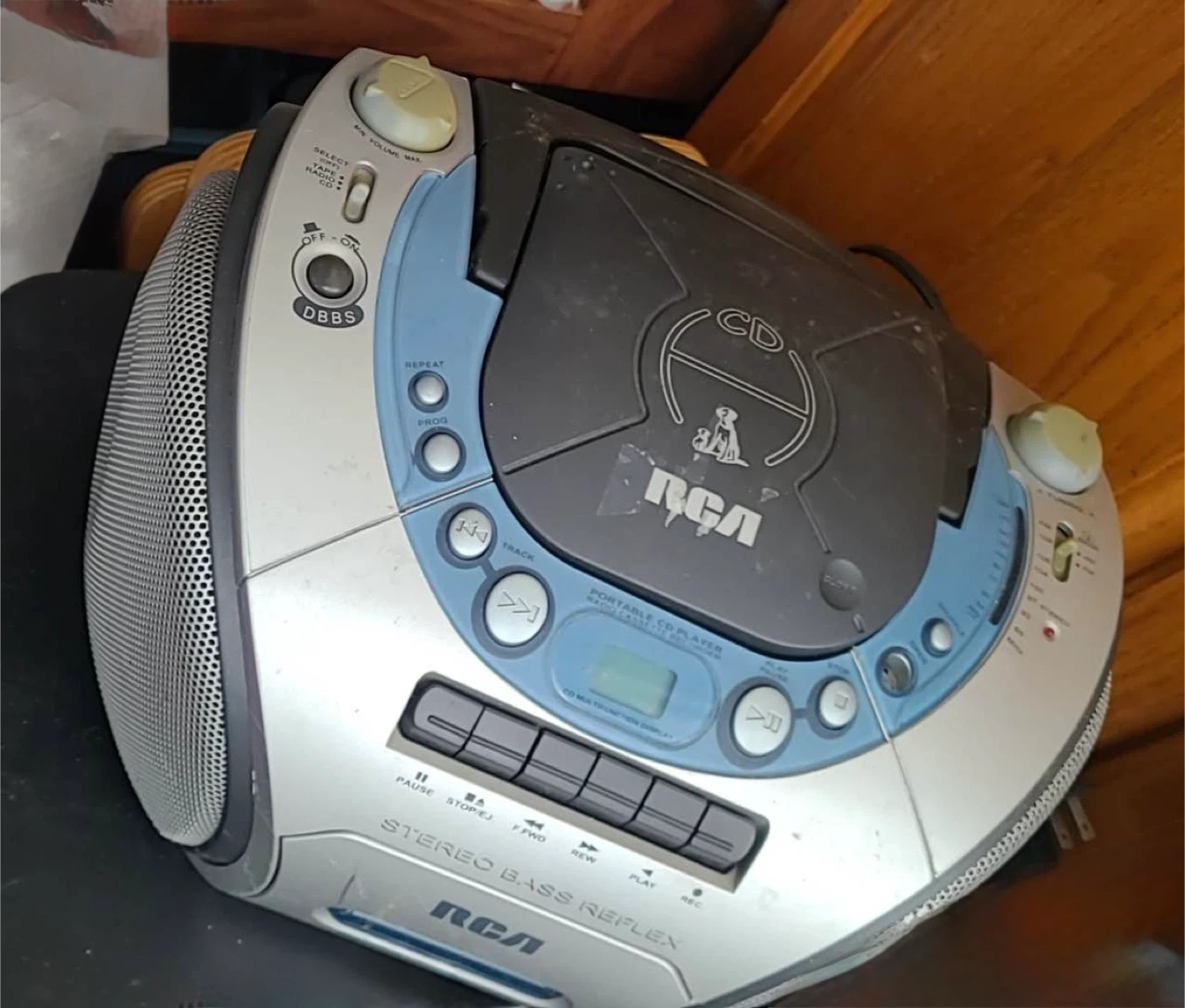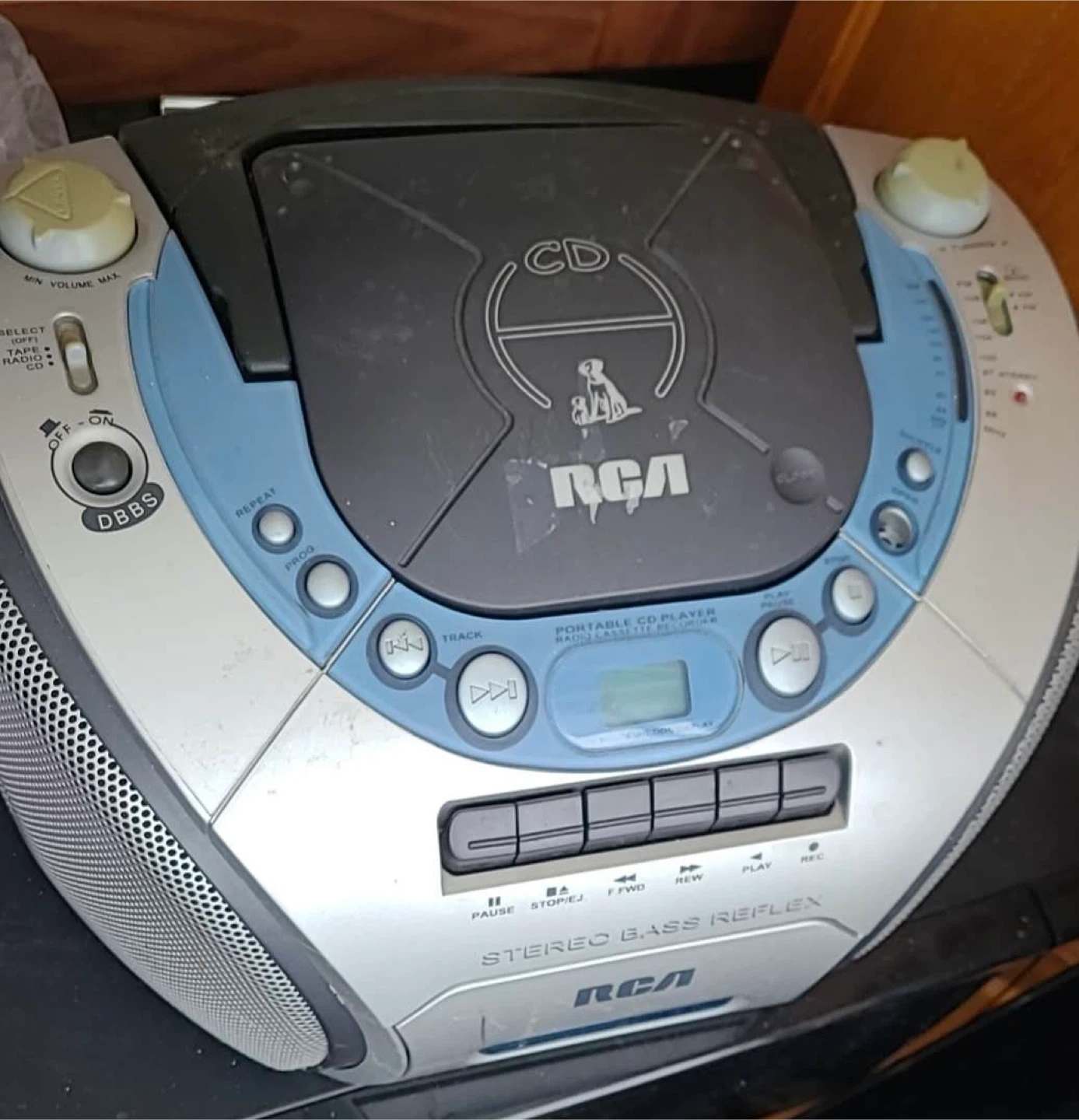 This RCA portable CD player boombox includes a radio and cassette deck. It features stereo bass reflex for enhanced sound. It's perfect for listening to music on the go!