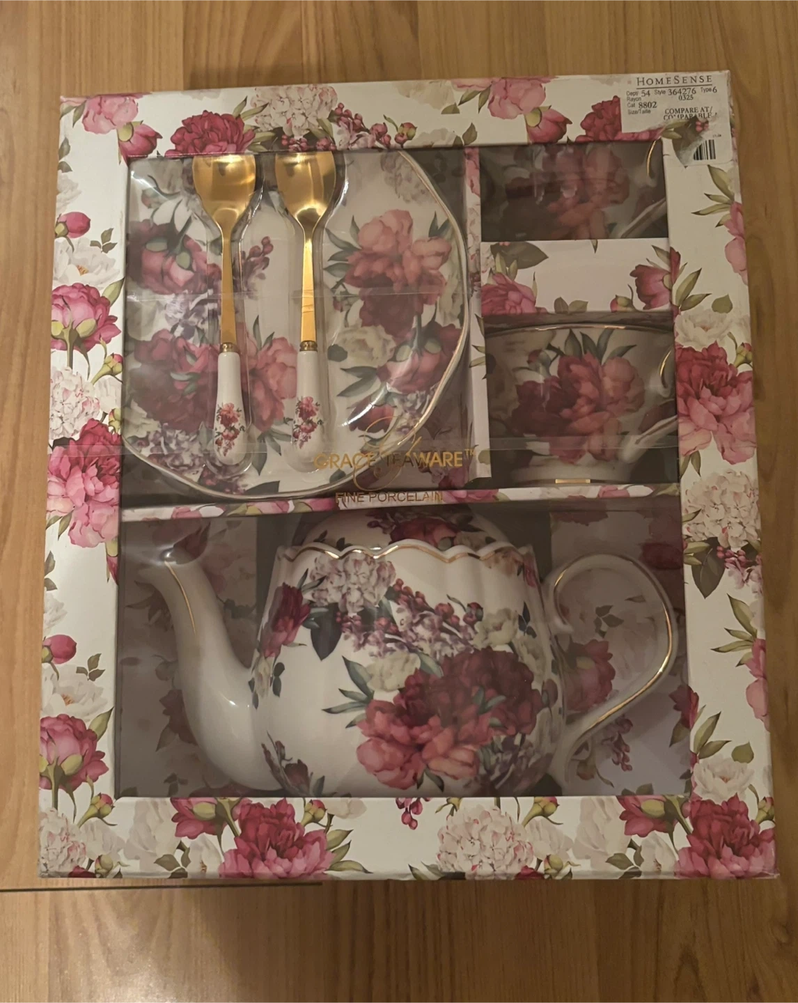 Beautifully patterned fine porcelain tea set. Includes teapot, teacups, saucers, and spoons. Features a floral design.