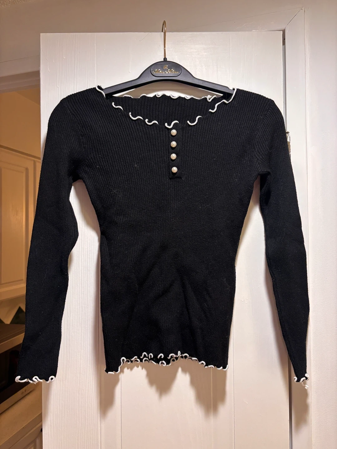 Black ribbed long sleeve top with a button-up front and white ruffled trim. It's made of a stretchy knit material. This top is great for layering or wearing on its own!