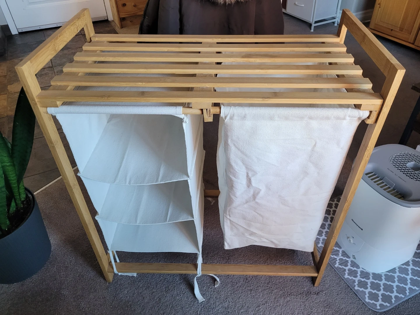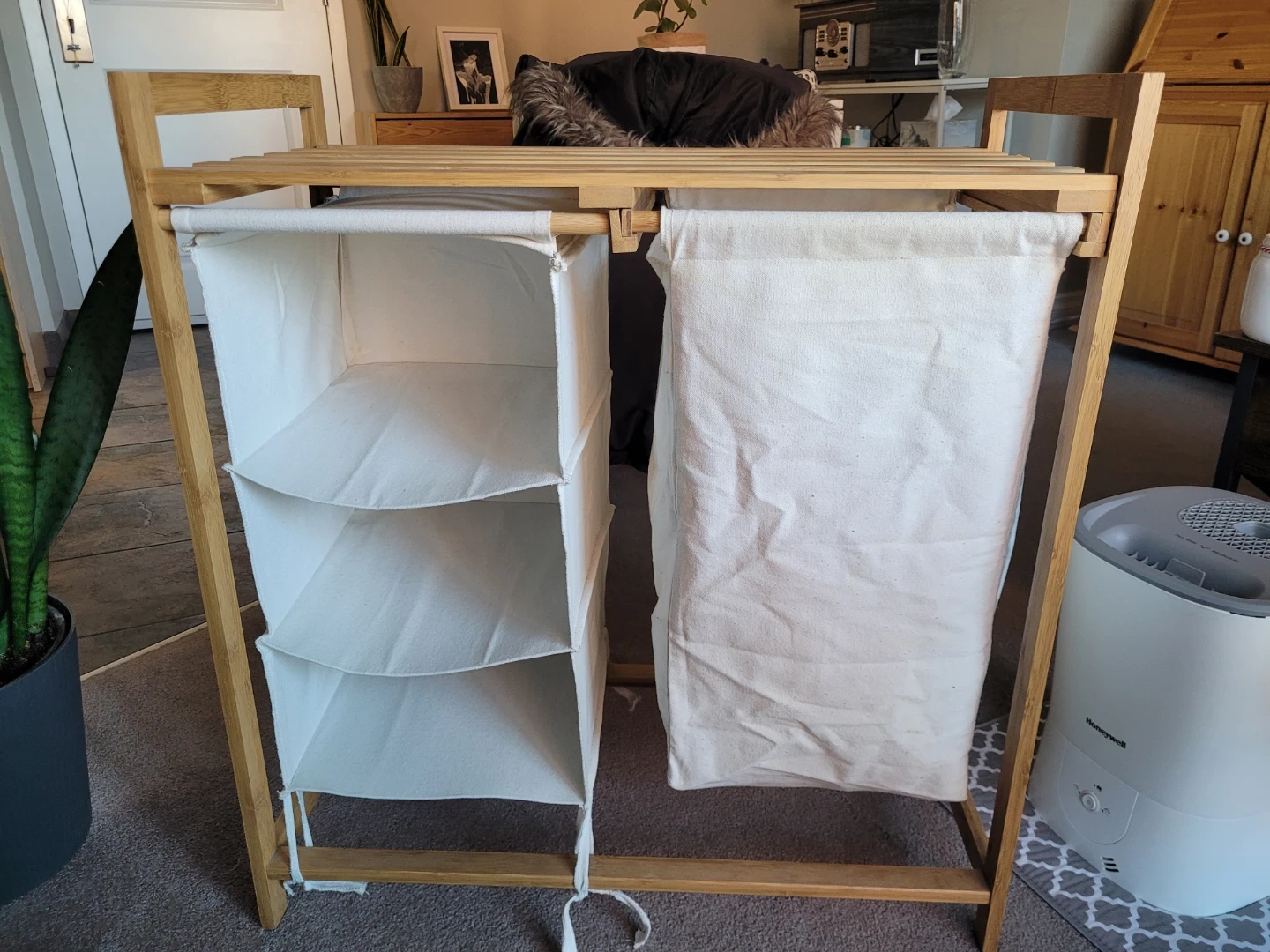 Bamboo framed laundry sorter with a removable white fabric bag and three fabric shelves. It's handy for organizing laundry or storing items. Great for small spaces!