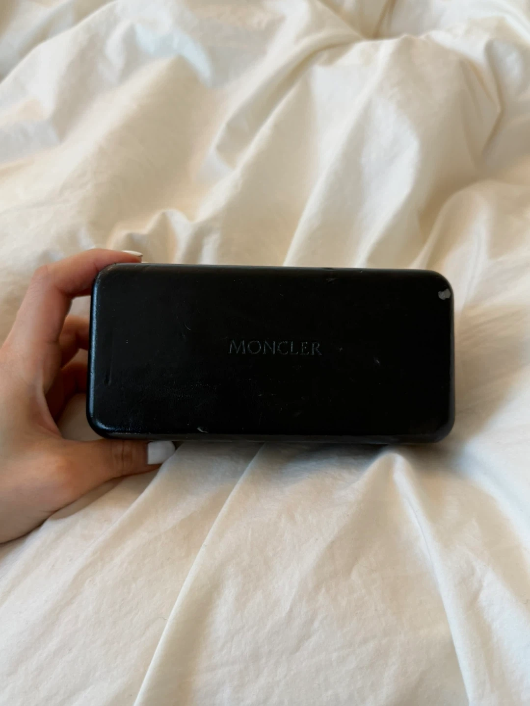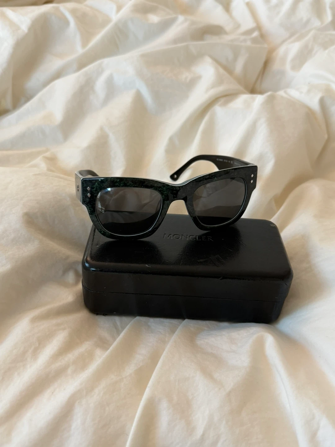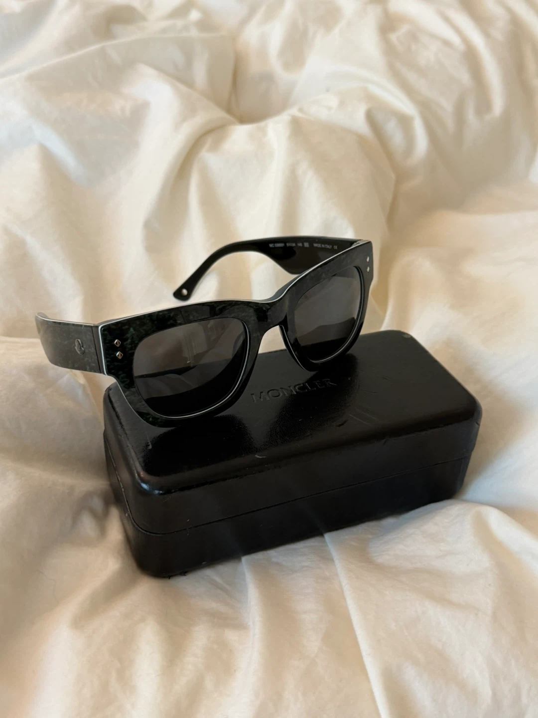 Stylish Moncler sunglasses with a dark tortoiseshell pattern. Includes the original Moncler hard case for protection. Made in Italy.