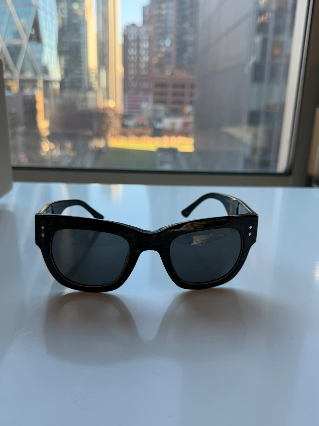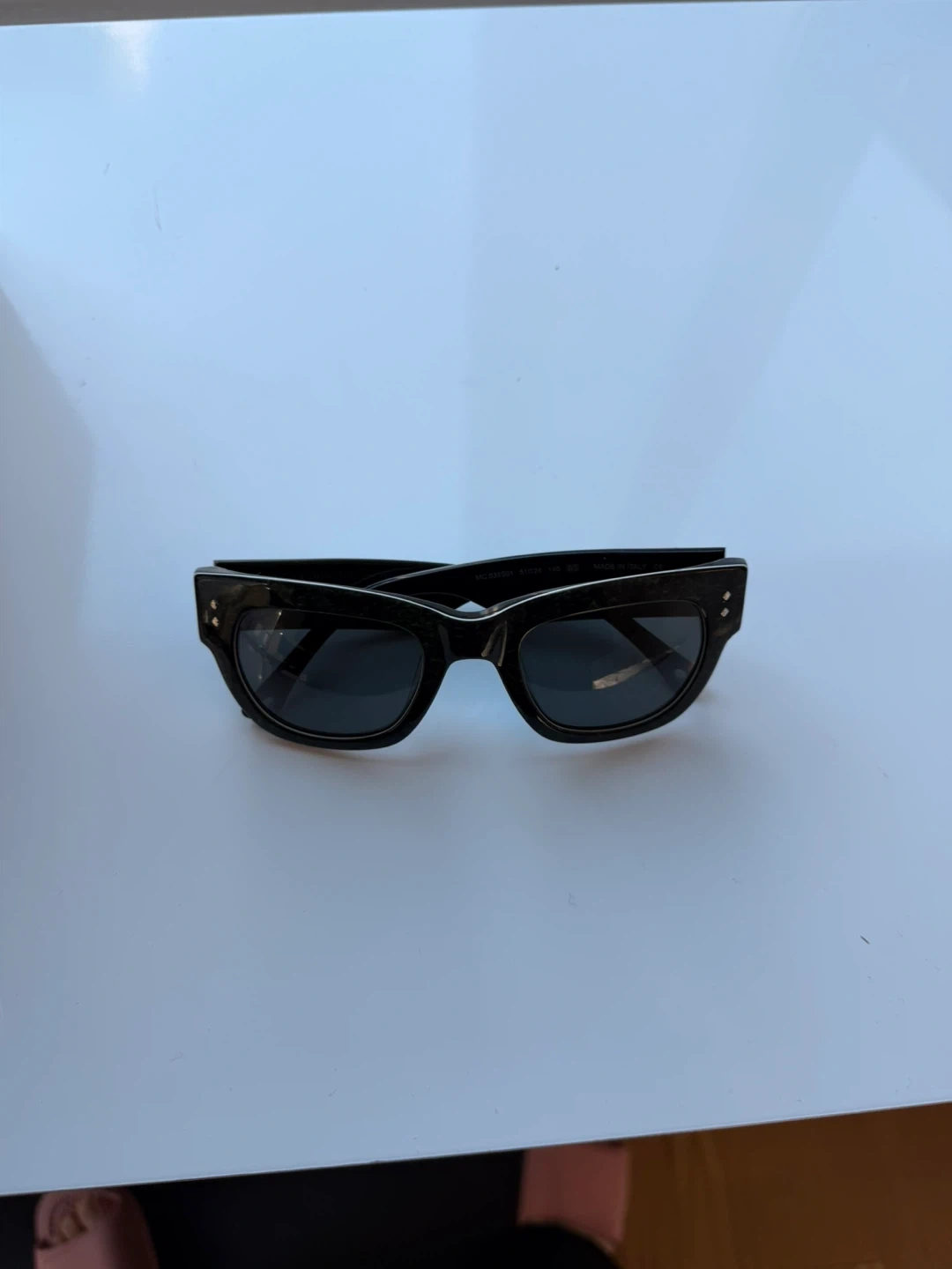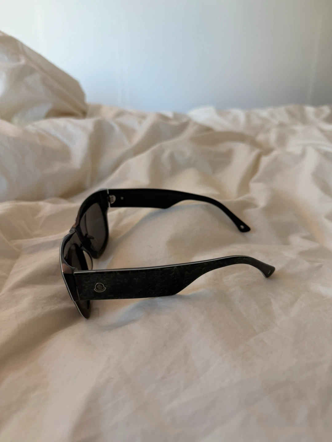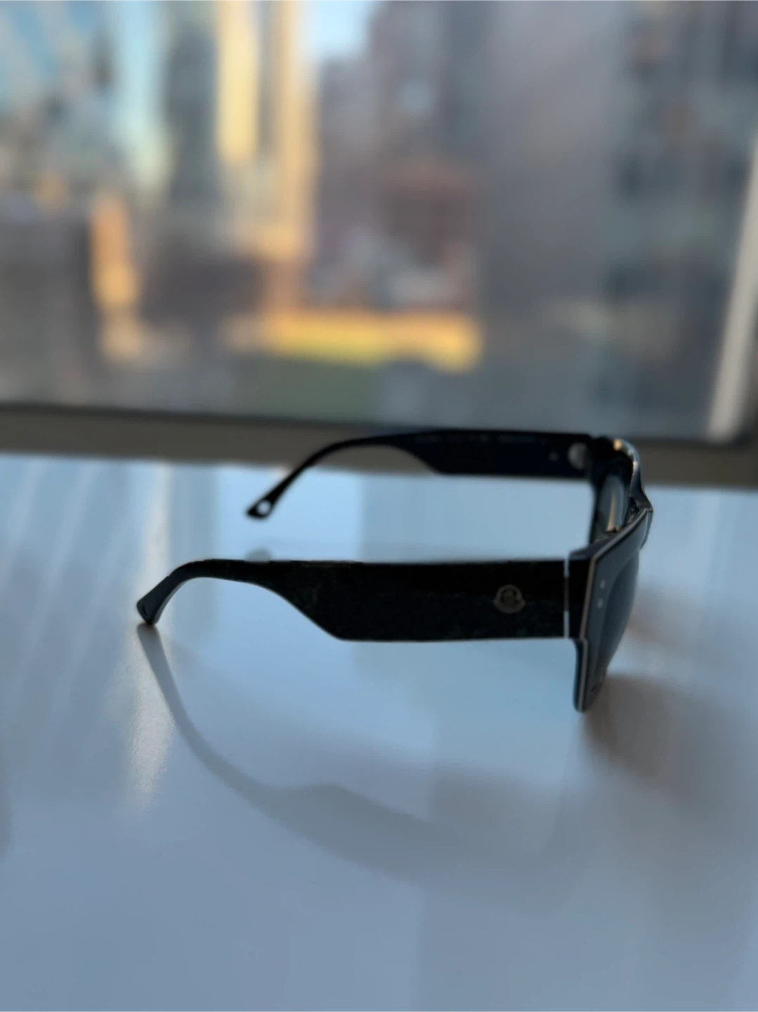 Stylish Moncler sunglasses with a dark tortoiseshell pattern. Includes the original Moncler hard case for protection. Made in Italy.